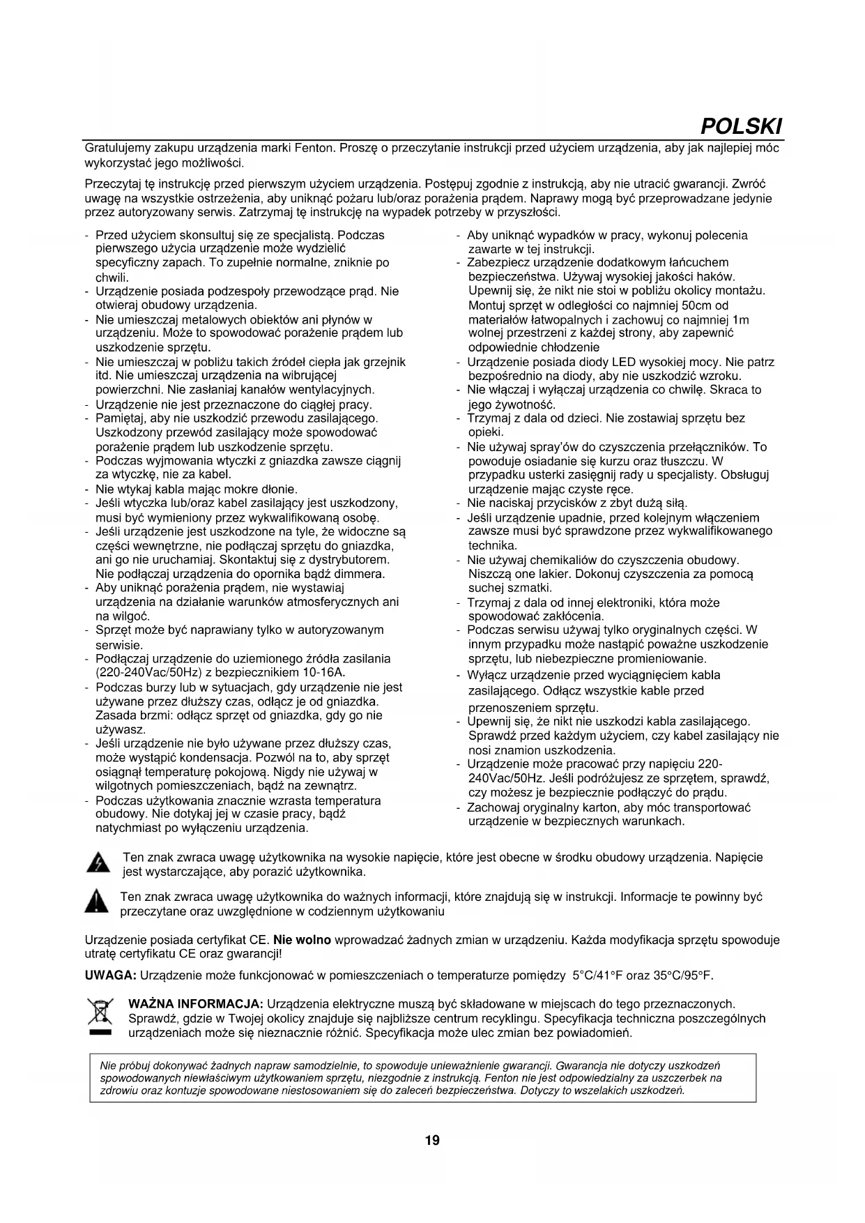 POLSKI Gratulujemy zakupu urządzenia marki Fenton. Proszę o przeczytanie instrukcji przed użyciem urządzenia, aby jak najlepiej móc wykorzystać jego możliwości. Przeczytaj tę instrukcję przed pierwszym użyciem urządzenia. Postępuj zgodnie z instrukcją, aby nie utracić gwarancji. Zwróć uwagę na wszystkie ostrzeżenia, aby uniknąć pożaru lub/oraz porażenia prądem. Naprawy mogą być przeprowadzane jedynie przez autoryzowany serwis. Zatrzymaj tę instrukcję na wypadek potrzeby w przyszłości. - Przed użyciem skonsultuj się ze specjalistą. Podczas pierwszego użycia urządzenie może wydzielić specyficzny zapach. To zupełnie normalne, zniknie po chwili. - Urządzenie posiada podzespoły przewodzące prąd. Nie otwieraj obudowy urządzenia. - Nie umieszczaj metalowych obiektów ani płynów w urządzeniu. Może to spowodować porażenie prądem lub uszkodzenie sprzętu. - Nie umieszczaj w pobliżu takich źródeł ciepła jak grzejnik itd. Nie umieszczaj urządzenia na wibrującej powierzchni. Nie zasłaniaj kanałów wentylacyjnych. - Urządzenie nie jest przeznaczone do ciągłej pracy. - Pamiętaj, aby nie uszkodzić przewodu zasilającego. Uszkodzony przewód zasilający może spowodować porażenie prądem lub uszkodzenie sprzętu. - Podczas wyjmowania wtyczki z gniazdka zawsze ciągnij za wtyczkę, nie za kabel. - Nie wtykaj kabla mając mokre dłonie. - Jeśli wtyczka lub/oraz kabel zasilający jest uszkodzony, musi być wymieniony przez wykwalifikowaną osobę. - Jeśli urządzenie jest uszkodzone na tyle, że widoczne są części wewnętrzne, nie podłączaj sprzętu do gniazdka, ani go nie uruchamiaj. Skontaktuj się z dystrybutorem. Nie podłączaj urządzenia do opornika bądź dimmera. - Aby uniknąć porażenia prądem, nie wystawiaj urządzenia na działanie warunków atmosferycznych ani na wilgoć. - Sprzęt może być naprawiany tylko w autoryzowanym serwisie. - Podłączaj urządzenie do uziemionego źródła zasilania (220-240Vac/50Hz) z bezpiecznikiem 10-16A. - Podczas burzy lub w sytuacjach, gdy urządzenie nie jest używane przez dłuższy czas, odłącz je od gniazdka. Zasada brzmi: odłącz sprzęt od gniazdka, gdy go nie używasz. - Jeśli urządzenie nie było używane przez dłuższy czas, może wystąpić kondensacja. Pozwól na to, aby sprzęt osiągnął temperaturę pokojową. Nigdy nie używaj w wilgotnych pomieszczeniach, bądź na zewnątrz. - Podczas użytkowania znacznie wzrasta temperatura obudowy. Nie dotykaj jej w czasie pracy, bądź natychmiast po wyłączeniu urządzenia. - Aby uniknąć wypadków w pracy, wykonuj polecenia zawarte w tej instrukcji. - Zabezpiecz urządzenie dodatkowym łańcuchem bezpieczeństwa. Używaj wysokiej jakości haków. Upewnij się, że nikt nie stoi w pobliżu okolicy montażu. Montuj sprzęt w odległości co najmniej 50cm od materiałów łatwopalnych i zachowuj co najmniej 1m wolnej przestrzeni z każdej strony, aby zapewnić odpowiednie chłodzenie - Urządzenie posiada diody LED wysokiej mocy. Nie patrz bezpośrednio na diody, aby nie uszkodzić wzroku. - Nie włączaj i wyłączaj urządzenia co chwilę. Skraca to jego żywotność. - Trzymaj z dala od dzieci. Nie zostawiaj sprzętu bez opieki. - Nie używaj spray’ów do czyszczenia przełączników. To powoduje osiadanie się kurzu oraz tłuszczu. W przypadku usterki zasięgnij rady u specjalisty. Obsługuj urządzenie mając czyste ręce. - Nie naciskaj przycisków z zbyt dużą siłą. - Jeśli urządzenie upadnie, przed kolejnym włączeniem zawsze musi być sprawdzone przez wykwalifikowanego technika. - Nie używaj chemikaliów do czyszczenia obudowy. Niszczą one lakier. Dokonuj czyszczenia za pomocą suchej szmatki. - Trzymaj z dala od innej elektroniki, która może spowodować zakłócenia. - Podczas serwisu używaj tylko oryginalnych części. W innym przypadku może nastąpić poważne uszkodzenie sprzętu, lub niebezpieczne promieniowanie. - Wyłącz urządzenie przed wyciągnięciem kabla zasilającego. Odłącz wszystkie kable przed przenoszeniem sprzętu. - Upewnij się, że nikt nie uszkodzi kabla zasilającego. Sprawdź przed każdym użyciem, czy kabel zasilający nie nosi znamion uszkodzenia. - Urządzenie może pracować przy napięciu 220- 240Vac/50Hz. Jeśli podróżujesz ze sprzętem, sprawdź, czy możesz je bezpiecznie podłączyć do prądu. - Zachowaj oryginalny karton, aby móc transportować urządzenie w bezpiecznych warunkach. Ten znak zwraca uwagę użytkownika na wysokie napięcie, które jest obecne w środku obudowy urządzenia. Napięcie jest wystarczające, aby porazić użytkownika. Ten znak zwraca uwagę użytkownika do ważnych informacji, które znajdują się w instrukcji. Informacje te powinny być przeczytane oraz uwzględnione w codziennym użytkowaniu Urządzenie posiada certyfikat CE. Nie wolno wprowadzać żadnych zmian w urządzeniu. Każda modyfikacja sprzętu spowoduje utratę certyfikatu CE oraz gwarancji! UWAGA: Urządzenie może funkcjonować w pomieszczeniach o temperaturze pomiędzy 5°C/41°F oraz 35°C/95°F. WAŻNA INFORMACJA: Urządzenia elektryczne muszą być składowane w miejscach do tego przeznaczonych. Sprawdź, gdzie w Twojej okolicy znajduje się najbliższe centrum recyklingu. Specyfikacja techniczna poszczególnych urządzeniach może się nieznacznie różnić. Specyfikacja może ulec zmian bez powiadomień.