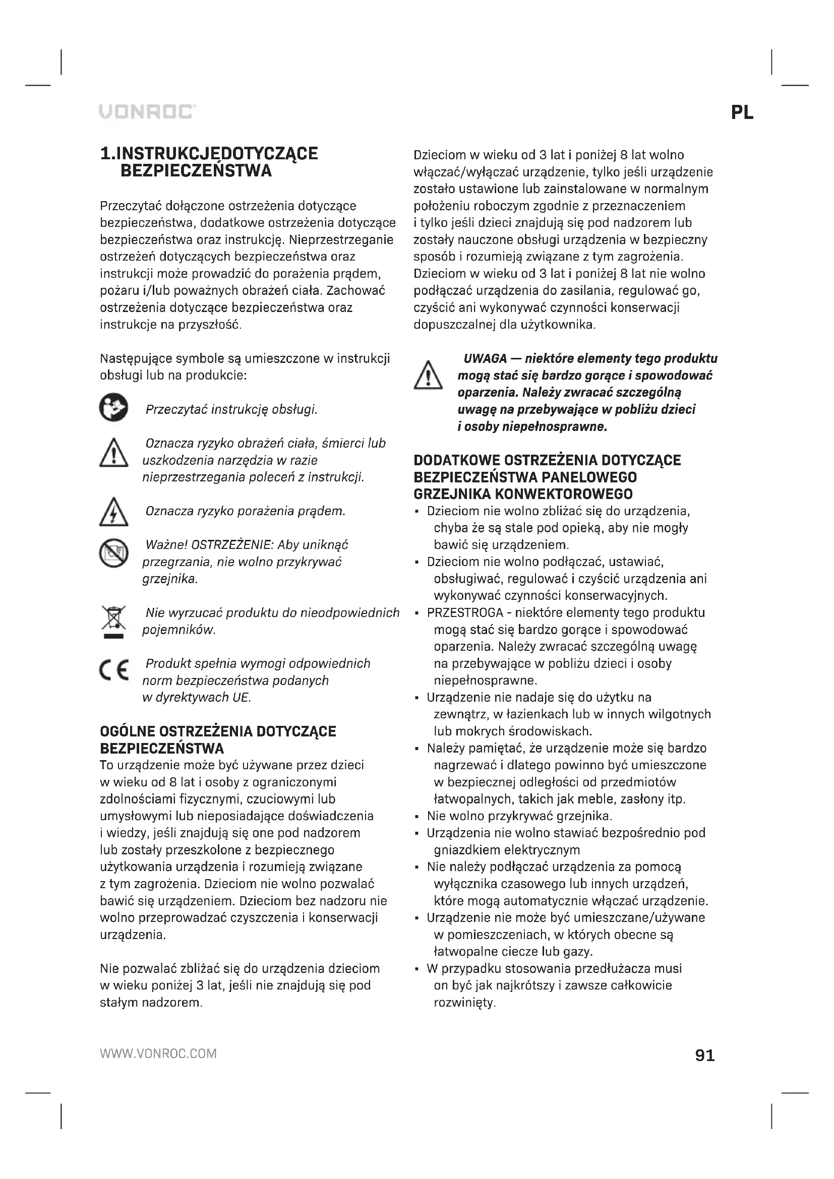 BEZPIECZEŃSTWA Przeczytać dołączone ostrzeżenia dotyczące bezpieczeństwa, dodatkowe ostrzeżenia dotyczące bezpieczeństwa oraz instrukcję. Nieprzestrzeganie ostrzeżeń dotyczących bezpieczeństwa oraz instrukcji może prowadzić do porażenia prądem, pożaru i/lub poważnych obrażeń ciała. Zachować ostrzeżenia dotyczące bezpieczeństwa oraz instrukcje na przyszłość. Następujące symbole są umieszczone winstrukcji obsługi lub na produkcie: Przeczytać instrukcję obsługi. Oznacza ryzyko obrażeń ciała, śmierci lub uszkodzenia narzędzia wrazie nieprzestrzegania poleceń zinstrukcji. Oznacza ryzyko porażenia prądem. Ważne! OSTRZEŻENIE: Aby uniknąć przegrzania, nie wolno przykrywać grzejnika. Nie wyrzucać produktu do nieodpowiednich pojemników. Produkt spełnia wymogi odpowiednich norm bezpieczeństwa podanych wdyrektywach UE.