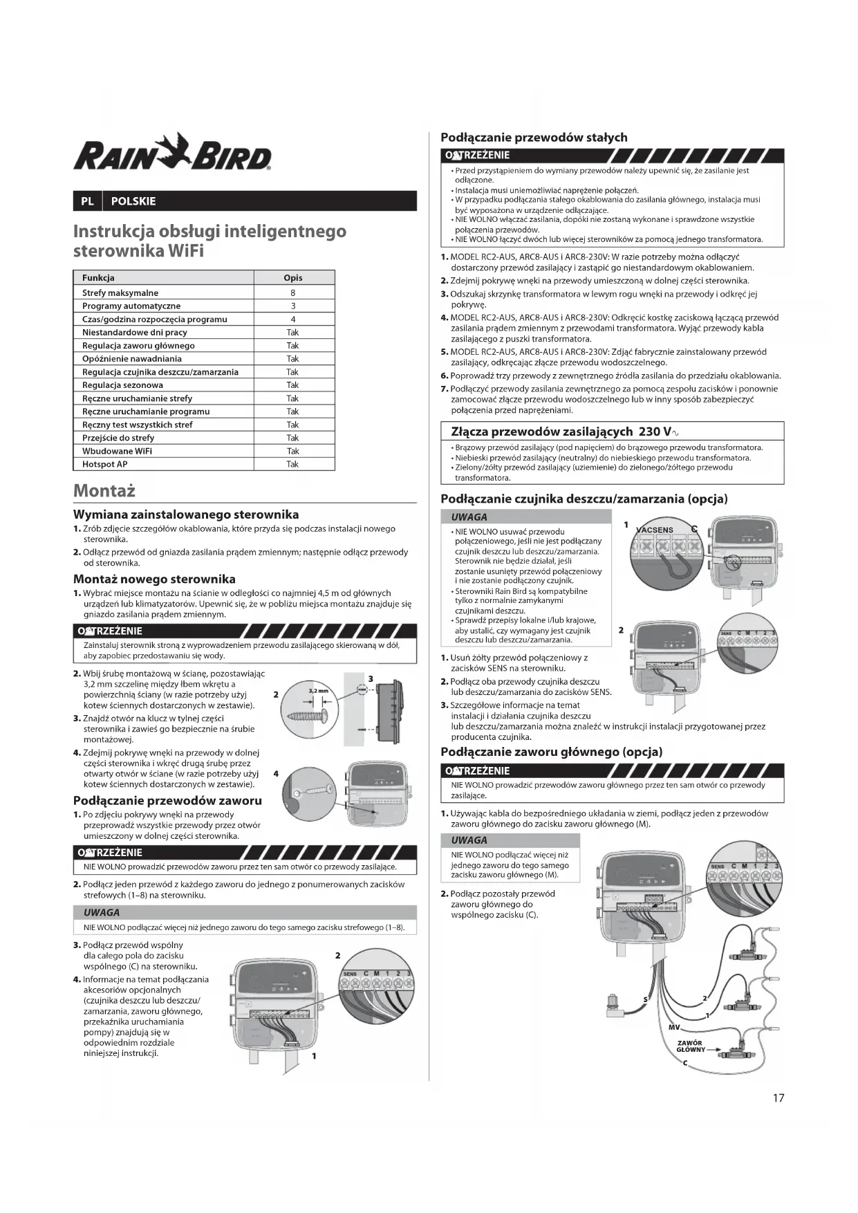 DRZWICZKI STEROWNIKA: Zdejmowane drzwiczki chroniące przed niekorzystnymi warunkami atmosferycznymi NAWADNIANIE AUTOMATYCZNE: Nawadnianie odbywa się automatycznie zgodnie z zaprogramowanym harmonogramemWYŁĄCZONY: Natychmiast przerywa wszelkie aktywne podlewanie i wyłącza automatyczne nawadnianieNAWADNIANIE RĘCZNE: Natychmiast rozpoczyna nawadnianie wszystkich stref po koleiPRZEJŚCIE DO NASTĘPNEJ STREFY: Przejście do następnej strefy w kolejnościTRYBY PAROWANIA: Przełączanie pomiędzy trybem Hotspot AP a trybem parowania WiFiPOLE ELEKTROINSTALACYJNE: Zawiera skrzynkę transformatora oraz blok zacisków do podłączenia przewodów zaworu i akcesoriów opcjonalnych PRZEWÓD ZASILAJĄCY (DLA MODELI RC2-AUS, ARC8-AUS i ARC8-230V): Przewód zasilający AC 1,8 mLED DZIAŁANIESTATUS Miga na niebiesko Tryb transmisji Quick PairSTATUS Na przemian na czerwono i zielono Tryb transmisji Hotspot APSTATUS Świeci na zielono Tryb transmisji WiFiSTATUS Miga na czerwono NiepołączonyAUTO Świeci na zielono Automatyczne nawadnianie aktywneOFF Świeci na czerwono Sterownik wyłączonyMANUAL Miga na zielono Ręczne nawadnianie aktywne Stan diod LED na sterowniku Instrukcje dotyczące bezpieczeństwa OSTRZEŻENIE Urządzenie nie jest przeznaczone do użytku przez osoby (w tym dzieci) o ograniczonej sprawności zycznej, sensorycznej lub umysłowej, a także nieposiadające doświadczenia i wiedzy, chyba że osoby te otrzymały nadzór lub instrukcje dotyczące użytkowania urządzenia od osoby odpowiedzialnej za ich bezpieczeństwo. Należy pilnować dzieci, aby nie bawiły się urządzeniem.Modele RC2-AUS, ARC8-AUS i ARC8-230V: jeśli przewód zasilający jest uszkodzony, musi zostać wymieniony przez producenta, jego przedstawiciela serwisowego lub osoby o podobnych kwalikacjach, aby uniknąć zagrożenia.Należy zachować szczególne środki ostrożności, gdy przewody zaworu znajdują się w pobliżu innych przewodów lub korzystają ze wspólnego kanału z innymi przewodami, np. używanymi do oświetlenia krajobrazu lub innych instalacji elektrycznych.Należy starannie oddzielić i zaizolować wszystkie przewodniki, uważając, aby nie uszkodzić izolacji przewodów podczas instalacji. Zwarcie elektryczne (styk) między przewodami zaworu a innym źródłem zasilania może spowodować uszkodzenie sterownika i stworzyć zagrożenie pożarowe. OSTRZEŻENIE Urządzenie musi zostać zainstalowane w odległości co najmniej 20 cm od osób; nie może być umieszczane ani eksploatowane w połączeniu z żadną inną anteną lub nadajnikiem. UWAGA Zmiany lub modykacje, które nie zostały wyraźnie zatwierdzone przez Rain Bird, mogą unieważnić uprawnienia użytkownika do obsługi urządzenia.Należy używać wyłącznie akcesoriów zatwierdzonych przez Rain Bird. Niezatwierdzone urządzenia mogą uszkodzić sterownik i spowodować utratę gwarancji.Wszystkie połączenia elektryczne i okablowanie muszą być zgodne z lokalnymi przepisami budowlanymi. Niektóre przepisy lokalne wymagają, aby instalację zasilania wykonywał wyłącznie licencjonowany lub certykowany elektryk. Sterownik powinien być instalowany wyłącznie przez profesjonalny personel. Sprawdź lokalne przepisy budowlane, aby uzyskać odpowiednie wskazówki.