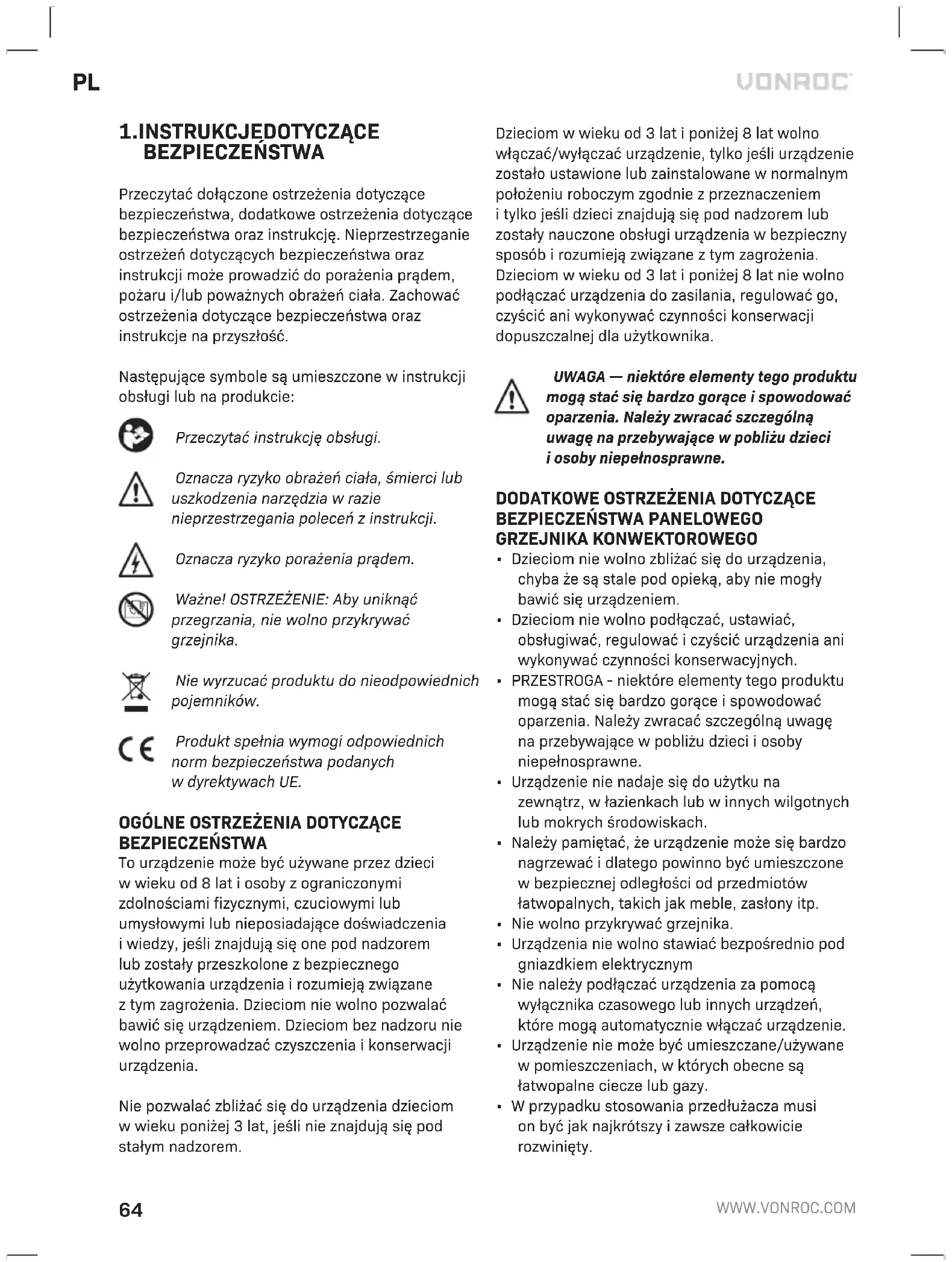 BEZPIECZEŃSTWA Przeczytać dołączone ostrzeżenia dotyczące bezpieczeństwa, dodatkowe ostrzeżenia dotyczące bezpieczeństwa oraz instrukcję. Nieprzestrzeganie ostrzeżeń dotyczących bezpieczeństwa oraz instrukcji może prowadzić do porażenia prądem, pożaru i/lub poważnych obrażeń ciała. Zachować ostrzeżenia dotyczące bezpieczeństwa oraz instrukcje na przyszłość. Następujące symbole są umieszczone winstrukcji obsługi lub na produkcie: Przeczytać instrukcję obsługi. Oznacza ryzyko obrażeń ciała, śmierci lub uszkodzenia narzędzia wrazie nieprzestrzegania poleceń zinstrukcji. Oznacza ryzyko porażenia prądem. Ważne! OSTRZEŻENIE: Aby uniknąć przegrzania, nie wolno przykrywać grzejnika. Nie wyrzucać produktu do nieodpowiednich pojemników. Produkt spełnia wymogi odpowiednich norm bezpieczeństwa podanych wdyrektywach UE.