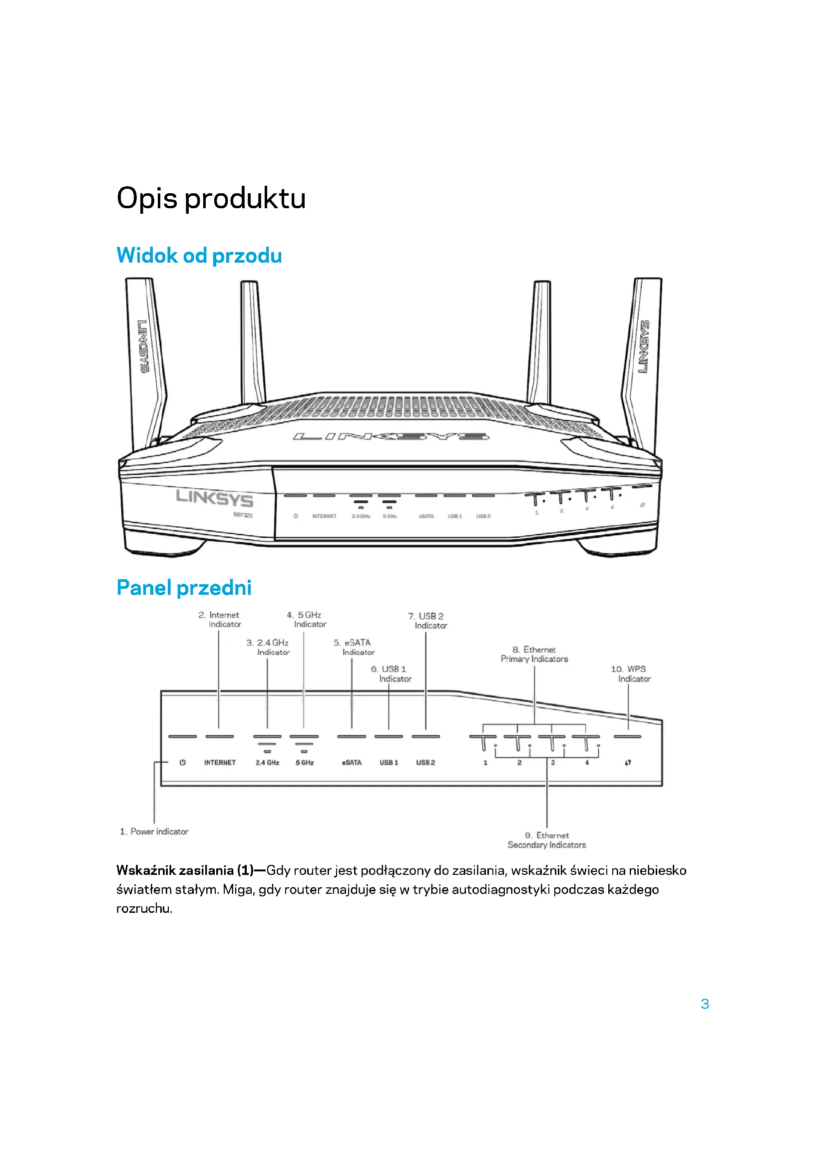 - Parametry fizyczne i środowiskowe Opis produktu Widok od przodu Panel przedni Wskaźnik zasilania (1)—Gdy router jest podłączony do zasilania, wskaźnik świeci na niebiesko światłem stałym. Miga, gdy router znajduje się w trybie autodiagnostyki podczas każdego rozruchu.4 Wskaźnik Internetu (2)—Dioda INTERNET świeci na niebiesko światłem stałym przy połączeniu z Internetem. Miga, gdy router nawiązuje połączenie z Internetem. Kolor pomarańczowy (światło ciągłe) oznacza, że połączenie nie działa prawidłowo z powodu niewłaściwej konfiguracji. Migające światło pomarańczowe oznacza, że połączenie nie działa prawidłowo z powodu problemu sprzętowego. Wskaźnik 2,4 GHz (3) — Wskaźnik świeci na niebiesko światłem stałym, gdy przynajmniej jeden klient jest połączony z siecią o częstotliwości 2,4 GHz. Wskaźnik miga, gdy router przesyła lub odbiera dane za pośrednictwem sieci 2,4 GHz. Wskaźnik 5 GHz (4) — Wskaźnik świeci na niebiesko światłem stałym, gdy przynajmniej jeden klient jest połączony z siecią o częstotliwości 5GHz. Wskaźnik miga, gdy router przesyła lub odbiera dane za pośrednictwem sieci 5 GHz. Wskaźnik eSATA (5)—Jeśli wskaźnik nie świeci, port USB/eSATA urządzenia USB jest podłączony. Wskaźnik świeci światłem stałym w kolorze niebieskim, gdy podłączone jest urządzenie eSATA. Miganie wskaźnika oznacza aktywność portu eSATA. Wskaźnik USB1 (6)—Jeśli wskaźnik nie świeci, port USB/eSATA urządzenia eSATA jest podłączony. Wskaźnik świeci światłem stałym w kolorze niebieskim, gdy podłączone jest urządzenie USB. Miganie wskaźnika oznacza aktywność portu. Wskaźnik USB2 (7)—Wskaźnik świeci światłem stałym w kolorze niebieskim, gdy podłączone jest urządzenie USB. Miganie wskaźnika oznacza aktywność portu. ETHERNET 1 przez 4 (podstawowy) (8)—Ponumerowane wskaźniki odpowiadają numerom portów na tylnym panelu routera. Kiedy wskaźnik świeci światłem stałym w kolorze niebieskim, router jest prawidłowo połączony z urządzeniem przez ten port. Jeśli wskaźnik miga, oznacza to, że dany port obsługuje ruch sieciowy. ETHERNET 1 przez 4 (dodatkowe) (9)—Jeśli wskaźnik jest wyłączony, router jest prawidłowo podłączony do urządzenia przez dany port z szybkością 10/100 Mb/s. Światło stałe w kolorze niebieskim oznacza, że router jest prawidłowo połączony z urządzeniem z szybkością 1000 Mb/s. Wskaźnik WPS (10)—Wskaźnik miga powoli przez maksymalnie dwie minuty podczas korzystania z funkcji Wi-Fi Protected Setup. Po nawiązaniu połączenia wskaźnik świeci przez pięć sekund światłem stałym w kolorze niebieskim. Wskaźnik miga na pomarańczowo, jeśli proces WPS się nie powiedzie. Jeśli tak się stanie, należy upewnić się, że urządzenie klienta wspiera WPS. Zaczekaj, aż wskaźnik przestanie świecić, i spróbuj ponownie. Router może obsługiwać tylko jedną sesję WPS na raz.5 Widok z tyłu Anteny regulowane (1) —Przed uruchomieniem routera należy podłączyć do niego znajdujące się w zestawie cztery regulowane anteny zewnętrzne. Złącze anteny należy nakręcić na port w routerze, obracając w kierunku zgodnym z ruchem wskazówek zegara. Uwaga — W celu uzyskania najlepszej wydajności boczne anteny należy ustawić pionowo, tak jak pokazano na obrazku po lewej stronie. Przycisk Wi-Fi Protected Setup™ (2)— służy do konfigurowania zabezpieczeń sieci bezprzewodowych w połączeniu z urządzeniami obsługującymi tryb Wi-Fi Protected Setup. Gniazda Ethernet (3) — do tych niebieskich gniazd gigabitowych (10/100/1000) należy podłączyć kable Ethernet prowadzące do urządzeń komunikujących się z siecią drogą przewodową. Uwaga — W celu uzyskania najlepszej wydajności należy stosować kable z oznaczeniem CAT5e lub wyższym.6 Gniazdo Internet (4) — do tego żółtego gniazda gigabitowego (10/100/1000) należy podłączyć kabel Ethernet prowadzący do szerokopasmowego modemu kablowego, DSL lub światłowodowego. Uwaga — W celu uzyskania najlepszej wydajności należy stosować kable z oznaczeniem CAT5e lub wyższym. Port USB 3.0 (5) — umożliwia podłączenie pamięci USB w celu jej udostępnienia w sieci domowej lub w Internecie. Gniazdo wielofunkcyjne USB 2.0/eSATA (6)— Tutaj można podłączyć napęd USB lub eSATA w celu udostępnienia go w sieci domowej lub w Internecie Przycisk reset (7) — naciśnięcie tego przycisku i przytrzymanie go przez 10 sekund, aż wskaźnik zasilania zacznie migać, powoduje przywrócenie domyślnych ustawień routera. Gniazdo zasilania (8) — tutaj należy podłączyć znajdujący się w zestawie zasilacz. Wyłącznik zasilania(9)—Wciśnij w pozycję |, by włączyć router7 Przygotowanie urządzenia do pracy: Podstawy Aby ukończyć ustawienia, potrzebny będzie komputer lub urządzenie mobilne. p. 213