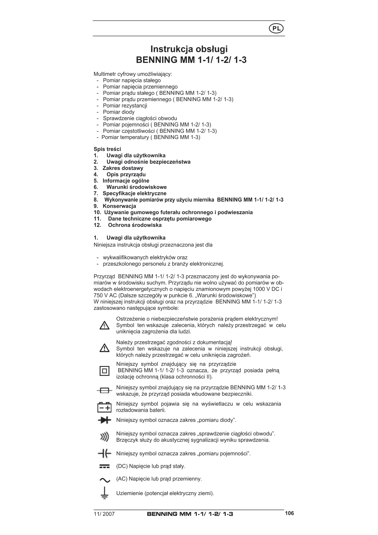 11/ 2007 BENNING MM 1‑1/ 1‑2/ 1‑3 Instrukcjaobsługi BENNING MM 1‑1/ 1‑2/ 1‑3 Multimetr cyfrowy umożliwiający: - Pomiar napięcia stałego - Pomiar napięcia przemiennego - Pomiar prądu stałego ( BENNING MM 1-2/ 1-3) - Pomiar prądu przemiennego ( BENNING MM 1-2/ 1-3) - Pomiar rezystancji - Pomiar diody - Sprawdzenie ciągłości obwodu - Pomiar pojemności ( BENNING MM 1-2/ 1-3) - Pomiar częstotliwości ( BENNING MM 1-2/ 1-3) - Pomiar temperatury ( BENNING MM 1-3) Spistreści