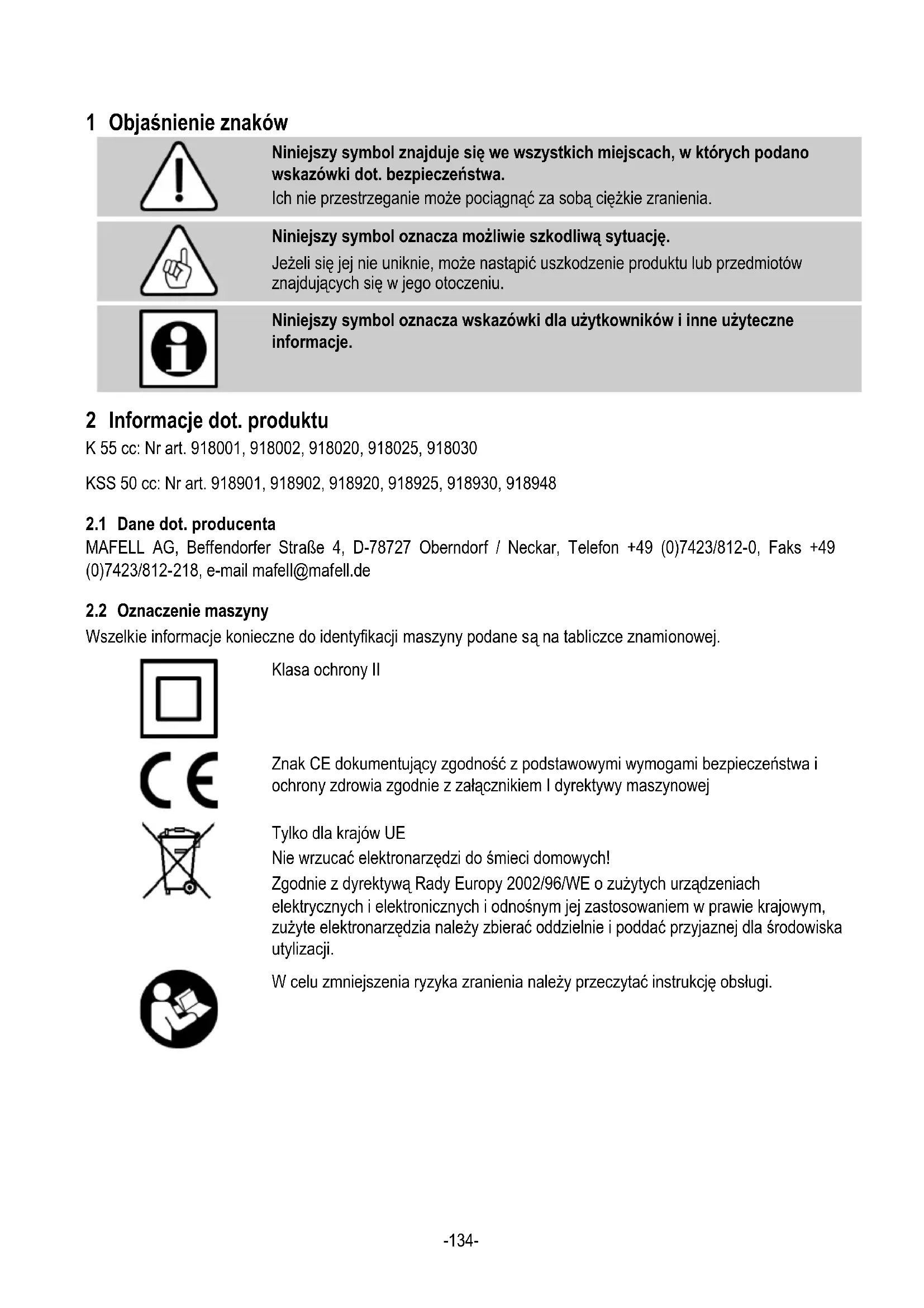 Niniejszy symbol oznacza wskazówki dla użytkowników i inne użyteczne informacje. 2 Informacje dot. produktu K 55 cc: Nr art. 918001, 918002, 918020, 918025, 918030 KSS 50 cc: Nr art. 918901, 918902, 918920, 918925, 918930, 918948