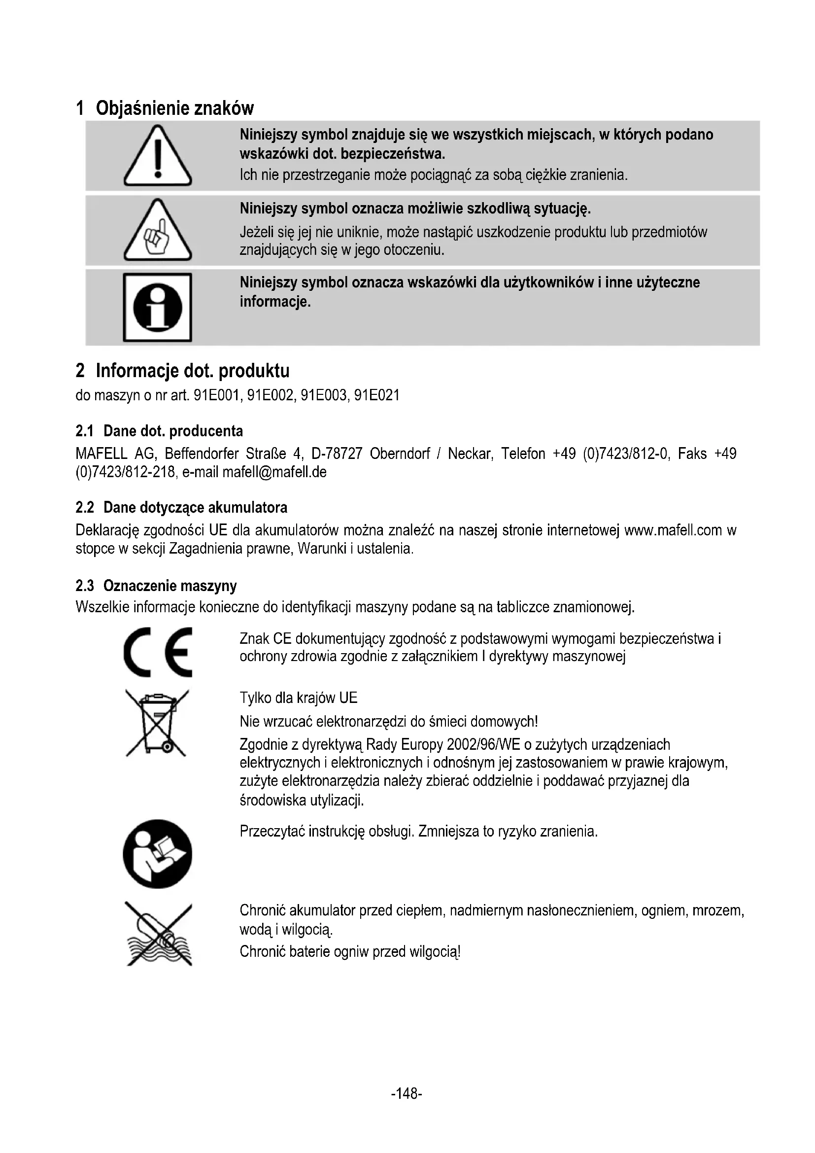 Deklarację zgodności UE dla akumulatorów można znaleźć na naszej stronie internetowej www.mafell.com w stopce w sekcji Zagadnienia prawne, Warunki i ustalenia.