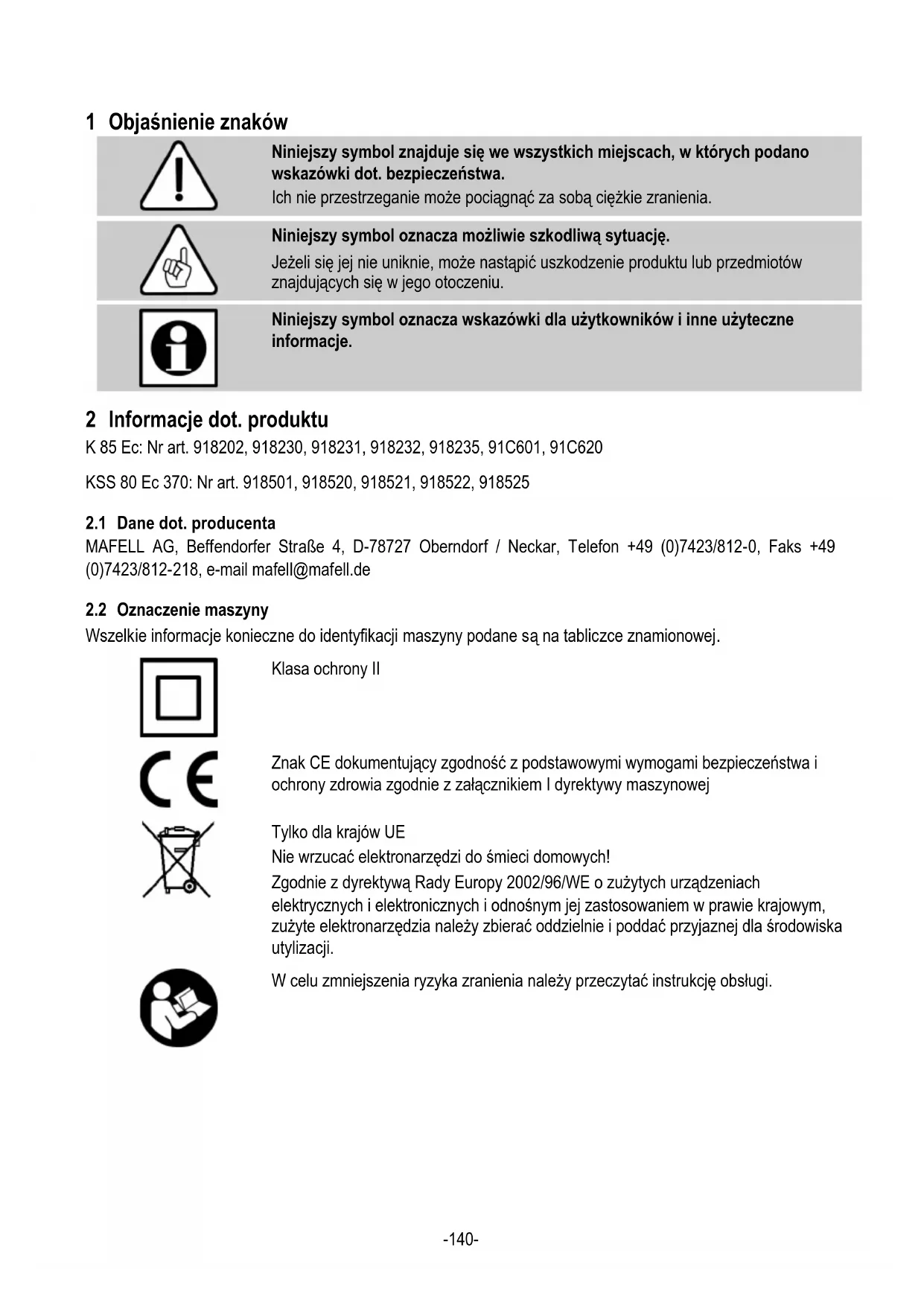 Niniejszy symbol oznacza wskazówki dla użytkowników i inne użyteczne informacje. 2 Informacje dot. produktu K 85 Ec: Nr art. 918202, 918230, 918231, 918232, 918235, 91C601, 91C620 KSS 80 Ec 370: Nr art. 918501, 918520, 918521, 918522, 918525