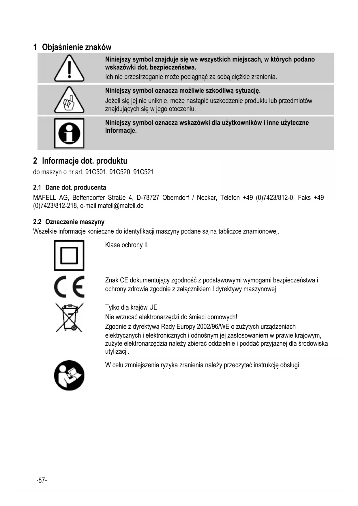 2 Informacje dot. produktu do maszyn o nr art. 91C501, 91C520, 91C521