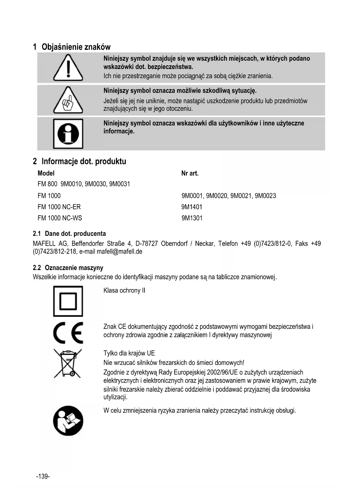 Niniejszy symbol oznacza wskazówki dla użytkowników i inne użyteczne informacje. 2 Informacje dot. produktu Model Nr art. FM 800 9M0010, 9M0030, 9M0031 FM 1000 9M0001, 9M0020, 9M0021, 9M0023 FM 1000 NC-ER 9M1401 FM 1000 NC-WS 9M1301