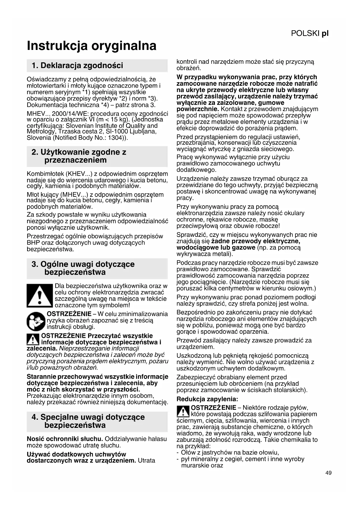 Instrukcja oryginalna Oświadczamy z pełną odpowiedzialnością, że młotowiertarki i młoty kujące oznaczone typem i numerem seryjnym *1) spełniają wszystkie obowiązujące przepisy dyrektyw *2) i norm *3). Dokumentacja techniczna *4) – patrz strona 3. MHEV... 2000/14/WE: procedura oceny zgodności w oparciu o załącznik VI (m < 15 kg). (Jednostka certyfikująca: Slovenian Institute of Quality and Metrology, Trzaska cesta 2, SI-1000 Ljubljana, Slovenia (Notified Body No.: 1304)). Kombimłotek (KHEV...) z odpowiednim osprzętem nadaje się do wiercenia udarowego i kucia betonu, cegły, kamienia i podobnych materiałów. Młot kujący (MHEV...) z odpowiednim osprzętem nadaje się do kucia betonu, cegły, kamienia i podobnych materiałów. Za szkody powstałe w wyniku użytkowania niezgodnego z przeznaczeniem odpowiedzialność ponosi wyłącznie użytkownik. Przestrzegać ogólnie obowiązujących przepisów BHP oraz dołączonych uwag dotyczących bezpieczeństwa. Dla bezpieczeństwa u żytkownika oraz w celu ochrony elektronarzędzia zwracać szczególną uwagę na miejsca w tekście oznaczone tym symbolem! OSTRZEŻENIE – W celu zminimalizowania ryzyka obrażeń zapoznać się z treścią instrukcji obsługi. OSTRZEŻENIE Przeczytać wszystkie informacje dotyczące bezpieczeństwa i zalecenia. Nieprzestrzeganie informacji dotyczących bezpieczeństwa i zaleceń może być przyczyną porażenia prądem elektrycznym, pożaru i/lub poważnych obrażeń. Starannie przechowywać wszystkie informacje dotyczące bezpieczeństwa i zalecenia, aby móc z nich skorzystać w przyszłości. Przekazując elektronarzędzie innym osobom, należy przekazać również niniejszą dokumentację. Nosić ochronniki słuchu. Oddziaływanie hałasu może spowodować utratę słuchu. Używać dodatkowych uchwytów dostarczonych wraz z urządzeniem. Utrata kontroli nad narzędziem może stać się przyczyną obrażeń. W przypadku wykonywania prac, przy których zamocowane narzędzie robocze może natrafić na ukryte przewody elektryczne lub własny przewód zasilający, urządzenie należy trzymać wyłącznie za zaizolowane, gumowe powierzchnie. Kontakt z przewodem znajdującym się pod napięciem może spowodować przepływ prądu przez metalowe elementy urządzenia i w efekcie doprowadzić do porażenia prądem. Przed przystą pieniem do regulacji ustawień, przezbrajania, konserwacji lub czyszczenia wyciągnąć wtyczkę z gniazda sieciowego. Pracę wykonywać wyłącznie przy użyciu prawidłowo zamocowanego uchwytu dodatkowego. Urządzenie należy zawsze trzymać oburącz za przewidziane do tego uchwyty, przyjąć bezpieczną postawę i skoncentrować uwagę na wykonywanej pracy. Przy wykonywaniu pracy za pomocą elektronarzędzia zawsze należy nosić okulary ochronne, rękawice robocze, maskę przeciwpyłową oraz obuwie robocze! Sprawdzić, czy w miejscu wykonywanych prac nie znajdują się żadne przewody elektryczne, wodociągowe lub gazowe (np. za pomocą wykrywacza metali). Podczas pracy narzędzie robocze musi być zawsze prawidłowo zamocowane. Sprawdzić prawidłowość zamocowania narzędzia poprzez jego poci ągnięcie. (Narzędzie robocze musi się poruszać kilka centymetrów w kierunku osiowym.) Przy wykonywaniu prac ponad poziomem podłogi należy sprawdzić, czy strefa poniżej jest wolna. Bezpośrednio po zakończeniu pracy nie dotykać narzędzia roboczego ani elementów znajdujących się w pobliżu, ponieważ mogą one być bardzo gorące i spowodować oparzenia. Przewód zasilający należy zawsze prowadzić za urządzeniem. Uszkodzoną lub pękniętą rękojeść pomocniczą należy wymienić. Nie wolno używać urządzenia z uszkodzonym uchwytem dodatkowym. Zabezpieczyć obrabiany element przed przesunięciem lub obróceniem (na przykład poprzez zamocowanie w ściskach stolarskich). Redukcja zapylenia: OSTRZEŻ ENIE – Niektóre rodzaje pyłów, które powstają podczas szlifowania papierem ściernym, cięcia, szlifowania, wiercenia i innych prac, zawierają substancje chemiczne, o których wiadomo, że wywołują raka, wady wrodzone lub zaburzają zdolność rozrodczą. Takie chemikalia to na przykład: -Ołów z jastrychów na bazie ołowiu, -pył mineralny z cegieł, cement i inne wyroby murarskie oraz
