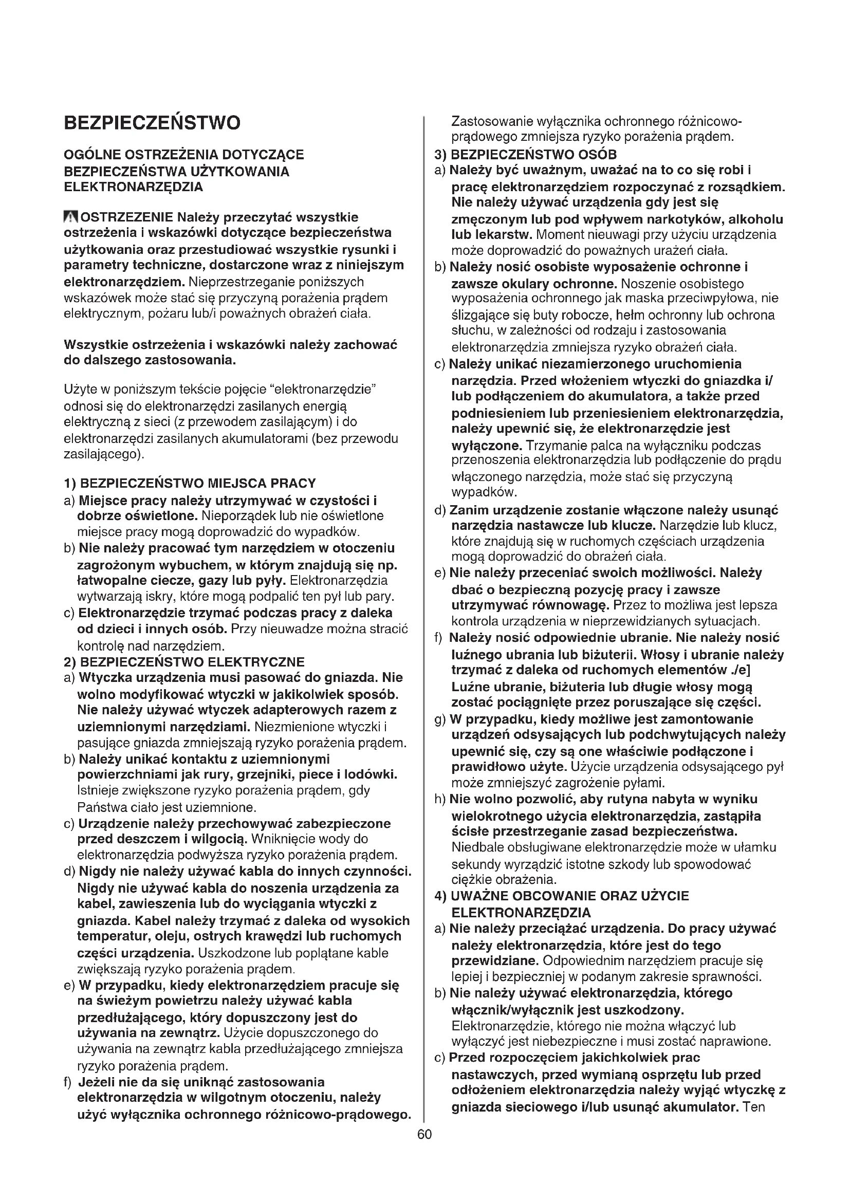 ELEKTRONARZĘDZIA OSTRZEZENIE Należy przeczytać wszystkie ostrzeżenia i wskazówki dotyczące bezpieczeństwa użytkowania oraz przestudiować wszystkie rysunki i parametry techniczne, dostarczone wraz z niniejszym elektronarzędziem. Nieprzestrzeganie poniższych wskazówek może stać się przyczyną porażenia prądem elektrycznym, pożaru lub/i poważnych obrażeń ciała. Wszystkie ostrzeżenia i wskazówki należy zachować do dalszego zastosowania. Użyte w poniższym tekście pojęcie “elektronarzędzie” odnosi się do elektronarzędzi zasilanych energią elektryczną z sieci (z przewodem zasilającym) i do elektronarzędzi zasilanych akumulatorami (bez przewodu zasilającego).