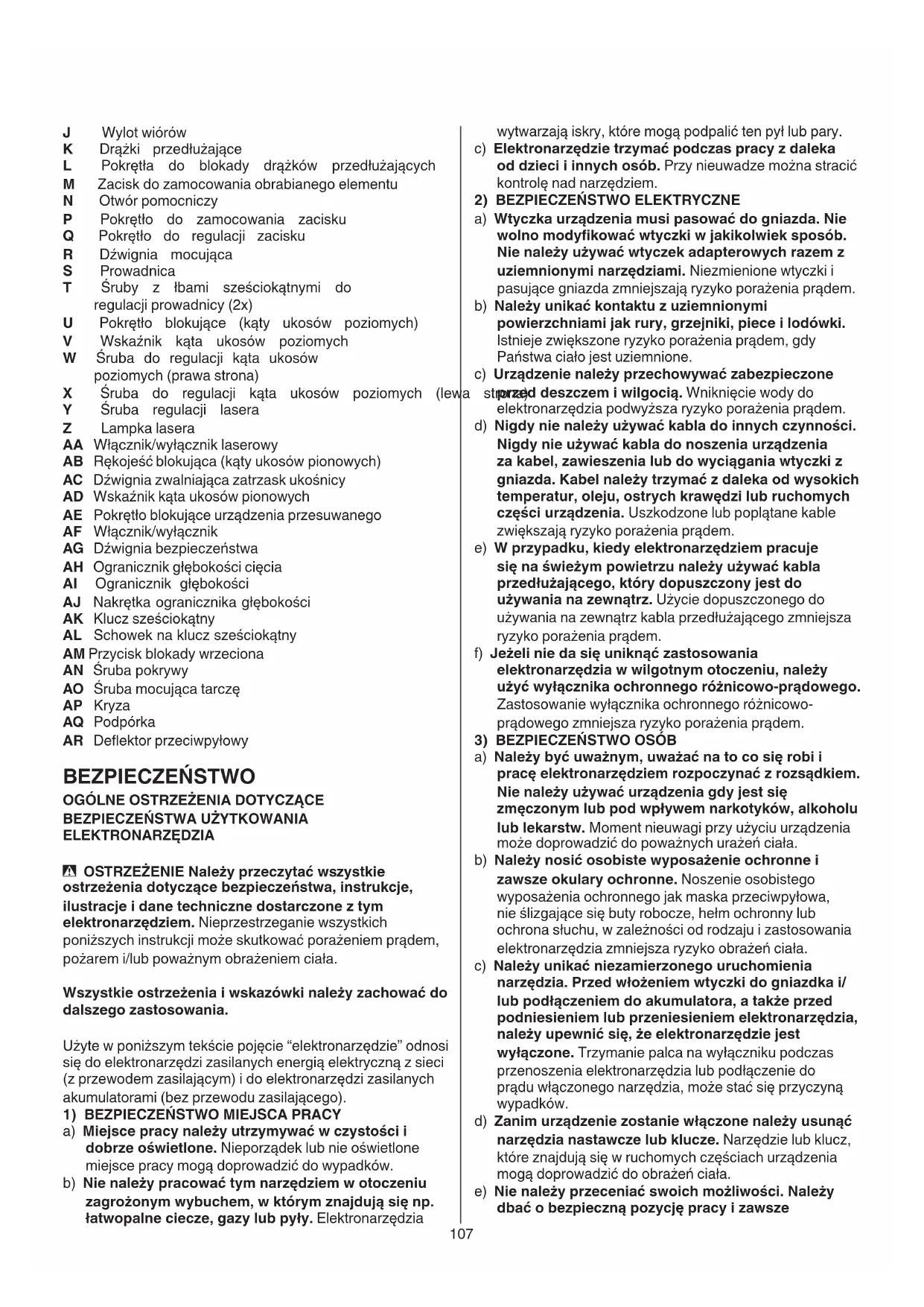 a) Należy być uważnym, uważać na to co się robi i pracę elektronarzędziem rozpoczynać z rozsądkiem. Nie należy używać urządzenia gdy jest się zmęczonym lub pod wpływem narkotyków, alkoholu lub lekarstw. Moment nieuwagi przy użyciu urządzenia może doprowadzić do poważnych urażeń ciała. b) Należy nosić osobiste wyposażenie ochronne i zawsze okulary ochronne. Noszenie osobistego wyposażenia ochronnego jak maska przeciwpyłowa, nie ślizgające się buty robocze, hełm ochronny lub ochrona słuchu, w zależności od rodzaju i zastosowania elektronarzędzia zmniejsza ryzyko obrażeń ciała. c) Należy unikać niezamierzonego uruchomienia narzędzia. Przed włożeniem wtyczki do gniazdka i/ lub podłączeniem do akumulatora, a także przed podniesieniem lub przeniesieniem elektronarzędzia, należy upewnić się, że elektronarzędzie jest wyłączone. Trzymanie palca na wyłączniku podczas przenoszenia elektronarzędzia lub podłączenie do prądu włączonego narzędzia, może stać się przyczyną wypadków. d) Zanim urządzenie zostanie włączone należy usunąć narzędzia nastawcze lub klucze. Narzędzie lub klucz, które znajdują się w ruchomych częściach urządzenia mogą doprowadzić do obrażeń ciała. e) Nie należy przeceniać swoich możliwości. Należy dbać o bezpieczną pozycję pracy i zawsze J Wylot wiórów K Drążki przedłużające L Pokrętła do blokady drążków przedłużających M Zacisk do zamocowania obrabianego elementu N Otwór pomocniczy P Pokrętło do zamocowania zacisku Q Pokrętło do regulacji zacisku R Dźwignia mocująca S Prowadnica T Śruby z łbami sześciokątnymi do regulacji prowadnicy (2x) U Pokrętło blokujące (kąty ukosów poziomych) V Wskaźnik kąta ukosów poziomych W Śruba do regulacji kąta ukosów poziomych (prawa strona) X Śruba do regulacji kąta ukosów poziomych (lewa strona) Y Śruba regulacji lasera Z Lampka lasera AA Włącznik/wyłącznik laserowy AB Rękojeść blokująca (kąty ukosów pionowych) AC Dźwignia zwalniająca zatrzask ukośnicy AD Wskaźnik kąta ukosów pionowych AE Pokrętło blokujące urządzenia przesuwanego AF Włącznik/wyłącznik AG Dźwignia bezpieczeństwa AH Ogranicznik głębokości cięcia AI Ogranicznik głębokości AJ Nakrętka ogranicznika głębokości AK Klucz sześciokątny AL Schowek na klucz sześciokątny AM Przycisk blokady wrzeciona AN Śruba pokrywy AO Śruba mocująca tarczę AP Kryza AQ Podpórka AR Deektor przeciwpyłowy BEZPIECZEŃSTWO