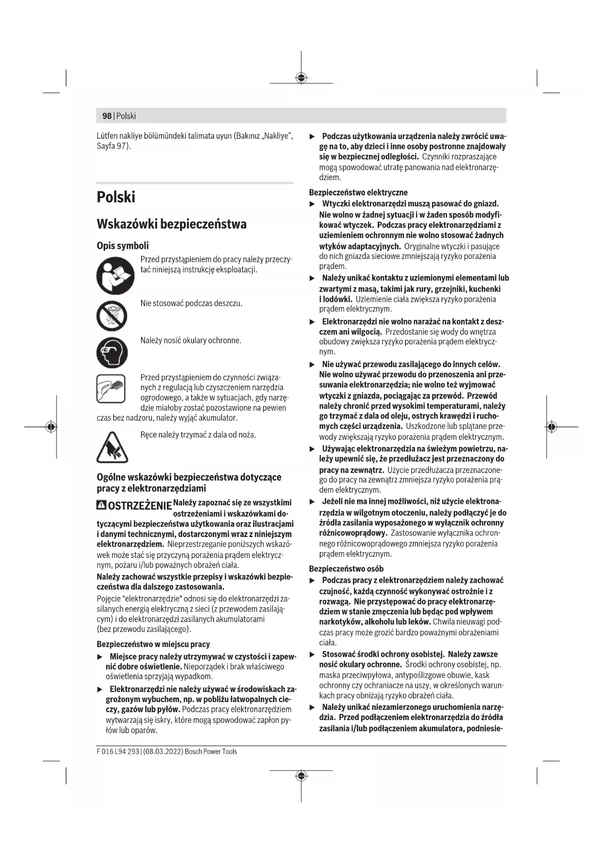 Karasoku Mahallesi 28028. Sokak No:20/A Merkez / ADANA Tel.: +903223599710 -3521379 Fax: +903223591323 E-mail: isiklar@isiklarelektrik.com Diğer servis adreslerini şurada bulabilirsiniz: www.bosch-pt.com/serviceaddresses Nakliye Önerilen Lityum İyon aküler tehlikeli madde taşıma yönetmeliği hükümlerine tabidir. Aküler başka bir yükümlülük olmaksızın kullanıcı tarafından caddeler üzerinde taşınabilir. Üçüncü kişiler eliyle yollanma durumunda (örneğin hava yolu ile veya nakliye şirketleri ile) paketleme ve etiketlemeye ilişkin özel hükümlere uyulmalıdır. Gönderi paketlenirken bir tehlikeli madde uzmanından yardım alınmalıdır. Aküleri sadece ve ancak gövdelerinde hasar yoksa gönderin. Açık kontakları kapatın ve aküyü ambalaj içinde hareket etmeyecek biçimde paketleyin. Lütfen olası ek ulusal yönetmelik hükümlerine de uyun. Tasfiye Ürünler, aküler, aksesuar ve ambalaj malzemesi çevre dostu yeniden kazanım merkezine gönderilmek zorundadır. ürünleri ve aküleri/bataryaları evsel çöplerin içine atmayın! Sadece AB ülkeleri için: 2012/19/EU yönetmeliği uyarınca kullanım ömrünü tamamlamış ürünler ve 2006/66/EC yönetmeliği uyarınca arızalı veya kullanım ömrünü tamamlamış aküler/ bataryalar ayrı ayrı toplanmak ve çevre dostu tasfiye için bir geri dönüşüm merkezine gönderilmek zorundadır. Atık elektrikli ve elektronik ekipmanlar uygun şekilde imha edilmezse olası tehlikeli maddelerin varlığı nedeniyle çevre ve insan sağlığı üzerinde zararlı etkileri olabilir. Aküler/bataryalar: Lityum iyon: Bosch Power Tools F 016 L94 293 | (08.03.2022)98 | Polski Lütfen nakliye bölümündeki talimata uyun (Bakınız „Nakliye“, Sayfa97). Polski Wskazówki bezpieczeństwa Opis symboli Przed przystąpieniem do pracy należy przeczy- tać niniejszą instrukcję eksploatacji. Nie stosować podczas deszczu. Należy nosić okulary ochronne. Przed przystąpieniem do czynności związa- nych z regulacją lub czyszczeniem narzędzia ogrodowego, a także w sytuacjach, gdy narzę- dzie miałoby zostać pozostawione na pewien czas bez nadzoru, należy wyjąć akumulator. Ręce należy trzymać z dala od noża. Ogólne wskazówki bezpieczeństwa dotyczące pracy z elektronarzędziami OSTRZEŻENIE Należy zapoznać się ze wszystkimi ostrzeżeniami i wskazówkami do- tyczącymi bezpieczeństwa użytkowania oraz ilustracjami i danymi technicznymi, dostarczonymi wraz z niniejszym elektronarzędziem. Nieprzestrzeganie poniższych wskazó- wek może stać się przyczyną porażenia prądem elektrycz- nym, pożaru i/lub poważnych obrażeń ciała. Należy zachować wszystkie przepisy i wskazówki bezpie- czeństwa dla dalszego zastosowania. Pojęcie "elektronarzędzie" odnosi się do elektronarzędzi za- silanych energią elektryczną z sieci (z przewodem zasilają- cym) i do elektronarzędzi zasilanych akumulatorami (bezprzewodu zasilającego). Bezpieczeństwo w miejscu pracy u Miejsce pracy należy utrzymywać w czystości i zapew- nić dobre oświetlenie. Nieporządek i brak właściwego oświetlenia sprzyjają wypadkom. u Elektronarzędzi nie należy używać w środowiskach za- grożonym wybuchem, np. w pobliżu łatwopalnych cie- czy, gazów lub pyłów. Podczas pracy elektronarzędziem wytwarzają się iskry, które mogą spowodować zapłon py- łów lub oparów. u Podczas użytkowania urządzenia należy zwrócić uwa- gę na to, aby dzieci i inne osoby postronne znajdowały się w bezpiecznej odległości. Czynniki rozpraszające mogą spowodować utratę panowania nad elektronarzę- dziem. Bezpieczeństwo elektryczne u Wtyczki elektronarzędzi muszą pasować do gniazd. Nie wolno w żadnej sytuacji i w żaden sposób modyfi- kować wtyczek. Podczas pracy elektronarzędziami z uziemieniem ochronnym nie wolno stosować żadnych wtyków adaptacyjnych. Oryginalne wtyczki i pasujące do nich gniazda sieciowe zmniejszają ryzyko porażenia prądem. u Należy unikać kontaktu z uziemionymi elementami lub zwartymi z masą, takimi jak rury, grzejniki, kuchenki ilodówki. Uziemienie ciała zwiększa ryzyko porażenia prądem elektrycznym. u Elektronarzędzi nie wolno narażać na kontakt z desz- czem ani wilgocią. Przedostanie się wody do wnętrza obudowy zwiększa ryzyko porażenia prądem elektrycz- nym. u Nie używać przewodu zasilającego do innych celów. Nie wolno używać przewodu do przenoszenia ani prze- suwania elektronarzędzia; nie wolno też wyjmować wtyczki z gniazda, pociągając za przewód. Przewód należy chronić przed wysokimi temperaturami, należy go trzymać zdala od oleju, ostrych krawędzi i rucho- mych części urządzenia. Uszkodzone lub splątane prze- wody zwiększają ryzyko porażenia prądem elektrycznym. u Używając elektronarzędzia na świeżym powietrzu, na- leży upewnić się, że przedłużacz jest przeznaczony do pracy na zewnątrz. Użycie przedłużacza przeznaczone- go do pracy na zewnątrz zmniejsza ryzyko porażenia prą- dem elektrycznym. u Jeżeli nie ma innej możliwości, niż użycie elektrona- rzędzia w wilgotnym otoczeniu, należy podłączyć je do źródła zasilania wyposażonego w wyłącznik ochronny różnicowoprądowy. Zastosowanie wyłącznika ochron- nego różnicowoprądowego zmniejsza ryzyko porażenia prądem elektrycznym. Bezpieczeństwo osób u Podczas pracy z elektronarzędziem należy zachować czujność, każdą czynność wykonywać ostrożnie i z rozwagą. Nie przystępować do pracy elektronarzę- dziem w stanie zmęczenia lub będąc pod wpływem narkotyków, alkoholu lub leków. Chwila nieuwagi pod- czas pracy może grozić bardzo poważnymi obrażeniami ciała. u Stosować środki ochrony osobistej. Należy zawsze nosić okulary ochronne. Środki ochrony osobistej, np. maska przeciwpyłowa, antypoślizgowe obuwie, kask ochronny czy ochraniacze na uszy, w określonych warun- kach pracy obniżają ryzyko obrażeń ciała. u Na