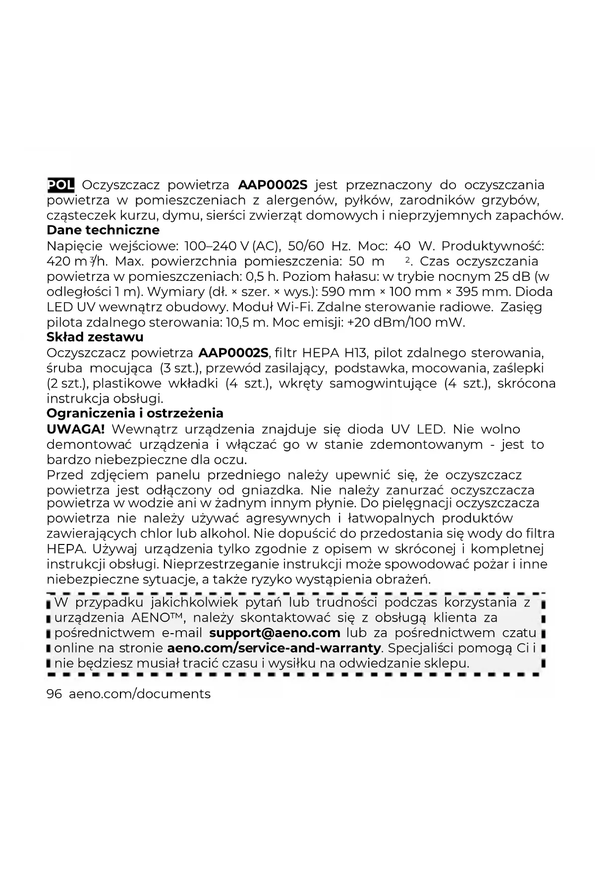. Czas oczyszczania powietrza w pomieszczeniach: 0,5 h. Poziom hałasu: w trybie nocnym 25 dB (w odległości 1 m). Wymiary (dł. × szer. × wys.): 590 mm × 100 mm × 395 mm. Dioda LED UV wewnątrz obudowy. Moduł Wi-Fi. Zdalne sterowanie radiowe. Zasięg pilota zdalnego sterowania: 10,5 m. Moc emisji: +20 dBm/100 mW. Skład zestawu Oczyszczacz powietrza AAP0002S, filtr HEPA H13, pilot zdalnego sterowania, śruba mocująca (3 szt.), przewód zasilający, podstawka, mocowania, zaślepki (2 szt.), plastikowe wkładki (4 szt.), wkręty samogwintujące (4 szt.), skrócona instrukcja obsługi. Ograniczenia i ostrzeżenia UWAGA! Wewnątrz urządzenia znajduje się dioda UV LED. Nie wolno demontować urządzenia i włączać go w stanie zdemontowanym - jest to bardzo niebezpieczne dla oczu. Przed zdjęciem panelu przedniego należy upewnić się, że oczyszczacz powietrza jest odłączony od gniazdka. Nie należy zanurzać oczyszczacza powietrza w wodzie ani w żadnym innym płynie. Do pielęgnacji oczyszczacza powietrza nie należy używać agresywnych i łatwopalnych produktów zawierających chlor lub alkohol. Nie dopuścić do przedostania się wody do filtra HEPA. Używaj urządzenia tylko zgodnie z opisem w skróconej i kompletnej instrukcji obsługi. Nieprzestrzeganie instrukcji może spowodować pożar i inne niebezpieczne sytuacje, a także ryzyko wystąpienia obrażeń. W przypadku