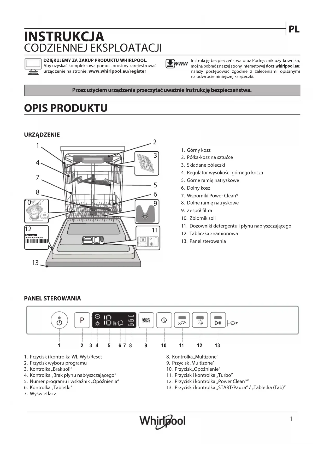 INSTRUKCJA CODZIENNEJ EKSPLOATACJI Przez użyciem urządzenia przeczytać uważnie Instrukcję bezpieczeństwa. URZĄDZENIE OPIS PRODUKTU PANEL STEROWANIA DZIĘKUJEMY ZA ZAKUP PRODUKTU WHIRLPOOL. Aby uzyskać kompleksową pomoc, prosimy zarejestrować urządzenie na stronie: www.whirlpool.eu/registerInstrukcję bezpieczeństwa oraz Podręcznik użytkownika, można pobrać z naszej strony internetowej docs.whirlpool.eu należy postępować zgodnie z zaleceniami opisanymi na odwrocie niniejszej książeczki.1. Przycisk i kontrolka Wł.-Wył./Reset2. Przycisk wyboru programu3. Kontrolka „Brak soli”4. Kontrolka „Brak płynu nabłyszczającego”5. Numer programu i wskaźnik „Opóźnienia”6. Kontrolka „Tabletki”7. Wyświetlacz 8. Kontrolka „Multizone”9. Przycisk „Multizone”10. Przycisk „Opóźnienie”11. Przycisk i kontrolka „Turbo”12. Przycisk i kontrolka „Power Clean®”13. Przycisk i kontrolka „START/Pauza” / „Tabletka (Tab)”1. Górny kosz2. Półka-kosz na sztućce3. Składane półeczki4. Regulator wysokości górnego kosza5. Górne ramię natryskowe6. Dolny kosz7. Wsporniki Power Clean®8. Dolne ramię natryskowe9. Zespół ltra10. Zbiornik soli11. Dozowniki detergentu i płynu nabłyszczającego12. Tabliczka znamionowa13. Panel sterowania0000 000 00000 Service: