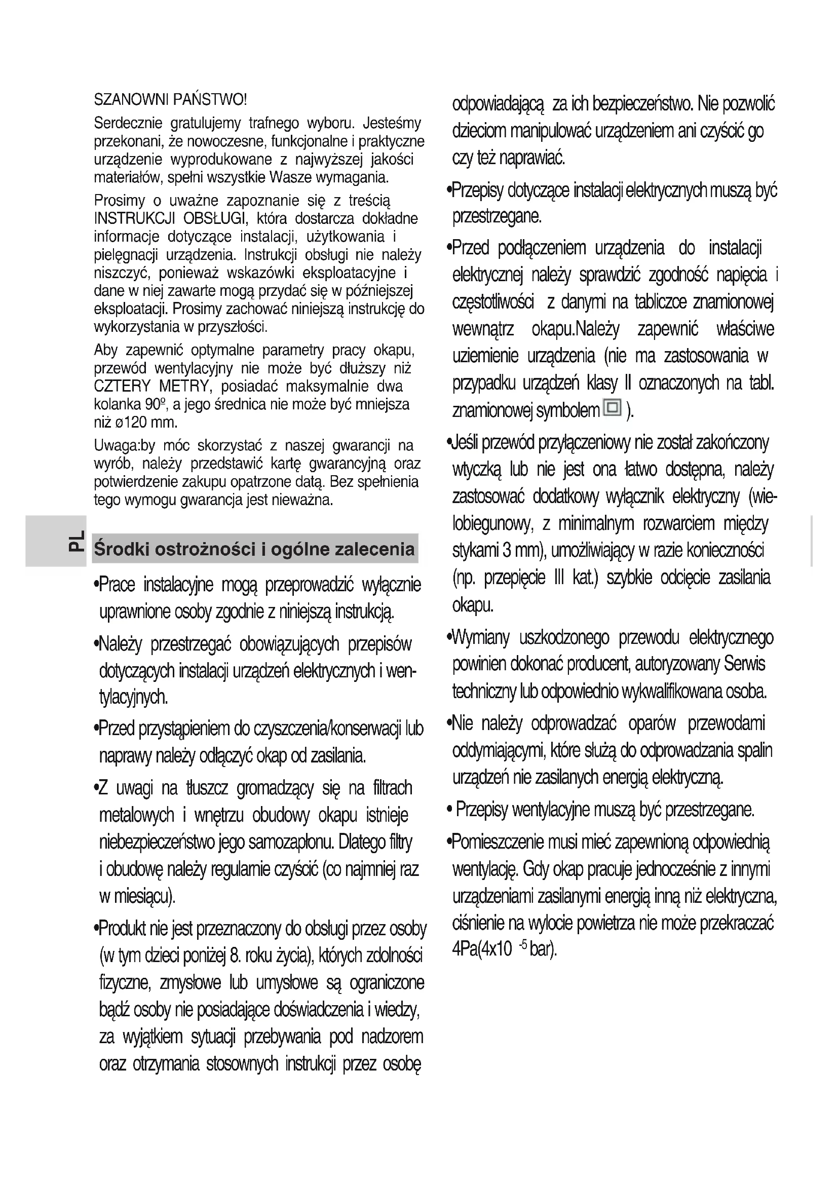TRPL SZANOWNI PAŃSTWO! Serdecznie gratulujemy trafnego wyboru. Jesteśmy przekonani, że nowoczesne, funkcjonalne i praktyczne urządzenie wyprodukowane z najwyższej jakości materiałów, spełni wszystkie Wasze wymagania. Prosimy o uważne zapoznanie się z treścią INSTRUKCJI OBSŁUGI, która dostarcza dokładne informacje dotyczące instalacji, użytkowania i pielęgnacji urządzenia. Instrukcji obsługi nie należy niszczyć, ponieważ wskazówki eksploatacyjne i dane w niej zawarte mogą przydać się w późniejszej eksploatacji. Prosimy zachować niniejszą instrukcję do wykorzystania w przyszłości. Aby zapewnić optymalne parametry pracy okapu, przewód wentylacyjny nie może być dłuższy niż CZTERY METRY, posiadać maksymalnie dwa kolanka 90º, a jego średnica nie może być mniejsza niż ø120 mm. Uwaga:by móc skorzystać z naszej gwarancji na wyrób, należy przedstawić kartę gwarancyjną oraz potwierdzenie zakupu opatrzone datą. Bez spełnienia tego wymogu gwarancja jest nieważna.
