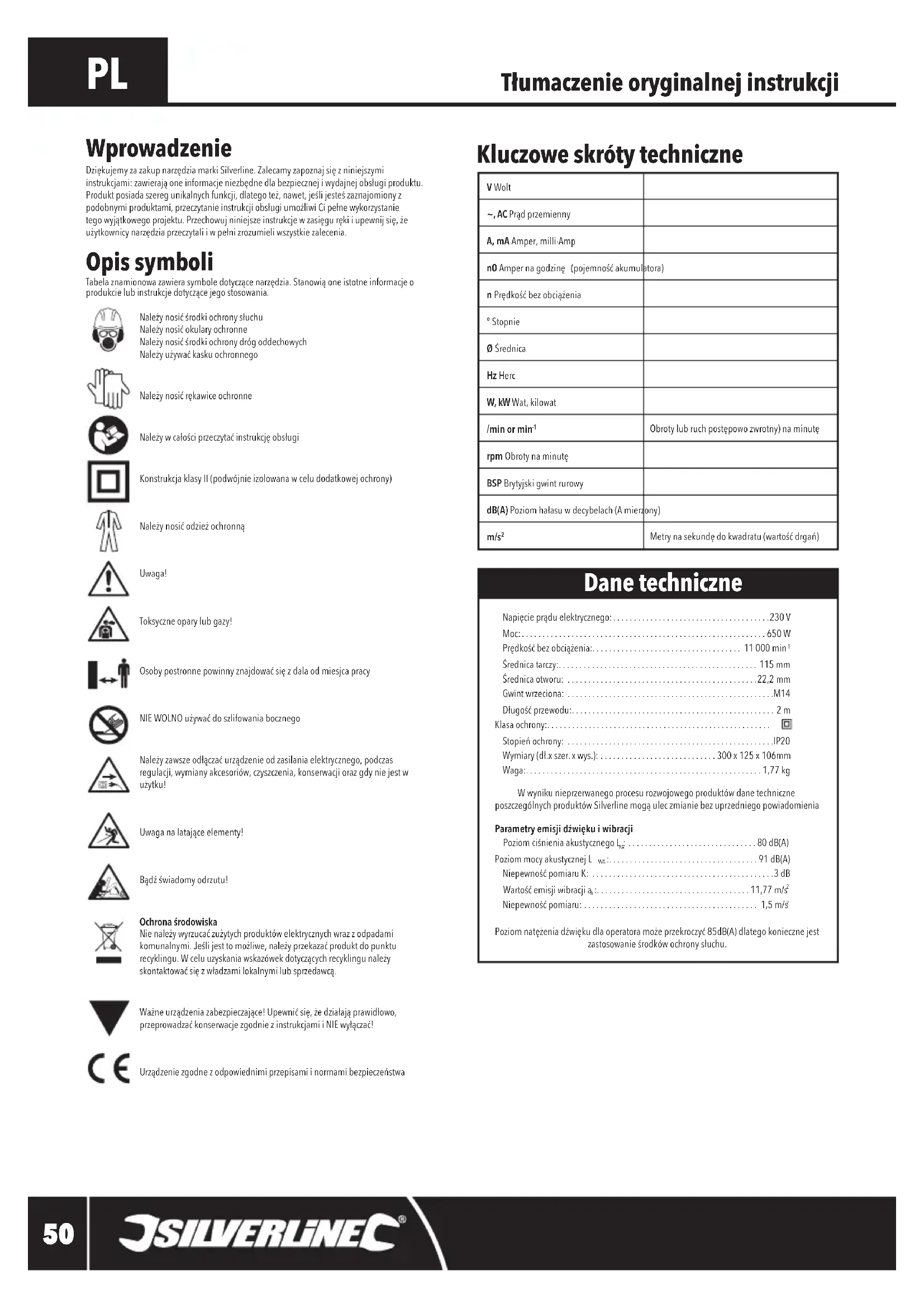 Średnicatarczy:................................................115 mm Średnicaotworu: ..............................................22,2 mm Gwintwrzeciona: ..................................................M14 Długośćprzewodu:.................................................2 m Klasa ochrony:...................................................... Stopieńochrony: ..................................................IP20 Wymiary(dł.xszer.xwys.): ............................300 x 125 x 106mm Waga:.........................................................1,77 kg WwynikunieprzerwanegoprocesurozwojowegoproduktówdanetechniczneposzczególnychproduktówSilverlinemogąuleczmianiebezuprzedniegopowiadomienia Parametry emisji dźwięku i wibracji PoziomciśnieniaakustycznegoL : ...............................80 dB(A) Poziom mocy akustycznej L :....................................91 dB(A) NiepewnośćpomiaruK: ............................................3 dB Wartośćemisjiwibracjia :.....................................11,77 m/s