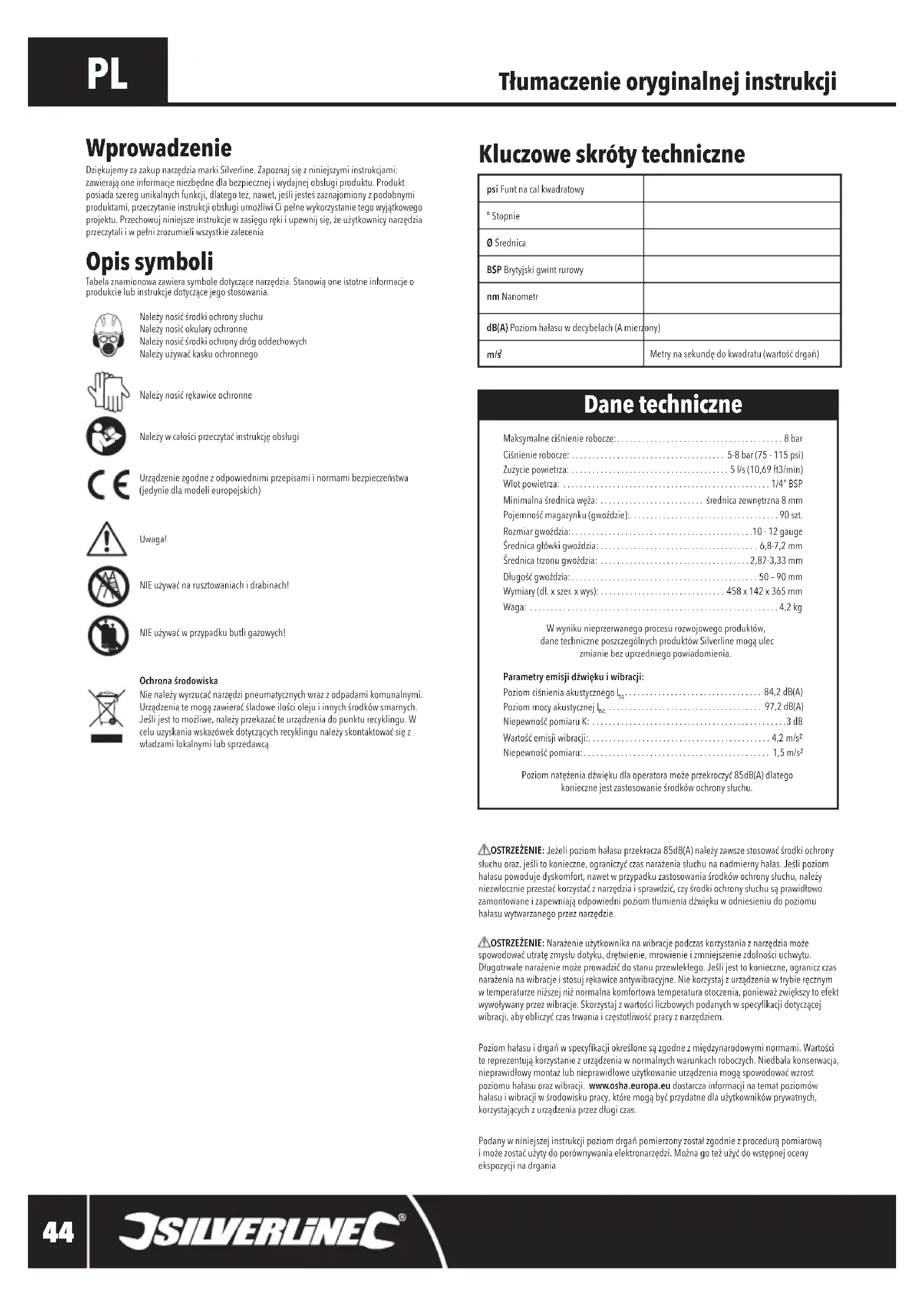 Maksymalneciśnienierobocze:........................................8 bar Ciśnienierobocze: ..................................... 5-8 bar (75 - 115 psi) Zużyciepowietrza: ......................................5 l/s (10,69 ft3/min) Wlotpowietrza: ..................................................1/4”BSP Minimalnaśrednicawęża:......................... średnicazewnętrzna8mm Pojemnośćmagazynku(gwoździe):....................................90szt. Rozmiargwoździa:............................................10 - 12 gauge Średnicagłówkigwoździa: ......................................6,8-7,2 mm Średnicatrzonugwoździa: ....................................2,87-3,33 mm Długośćgwoździa:.............................................50 – 90 mm Wymiary(dł.xszer.xwys): .............................. 458 x 142 x 365 mm Waga: ............................................................4,2 kgWwynikunieprzerwanegoprocesurozwojowegoproduktów, danetechniczneposzczególnychproduktówSilverlinemogąulec zmianiebezuprzedniegopowiadomienia.Parametry emisji dźwięku i wibracji:PoziomciśnieniaakustycznegoL ................................. 84,2 dB(A)PoziommocyakustycznejL ..................................... 97,2 dB(A) NiepewnośćpomiaruK: ...............................................3 dB Wartośćemisjiwibracji:............................................4,2 m/s² Niepewnośćpomiaru:............................................. 1,5 m/s² Poziomnatężeniadźwiękudlaoperatoramożeprzekroczyć85dB(A)dlatego koniecznejestzastosowanieśrodkówochronysłuchu. Dane techniczne OSTRZEŻENIE:Jeżelipoziomhałasuprzekracza85dB(A)należyzawszestosowaćśrodkiochrony słuchuoraz,jeślitokonieczne,ograniczyćczasnarażeniasłuchunanadmiernyhałas.Jeślipoziomhałasupowodujedyskomfort,nawetwprzypadkuzastosowaniaśrodkówochronysłuchu,należyniezwłocznieprzestaćkorzystaćznarzędziaisprawdzić,czyśrodkiochronysłuchusąprawidłowozamontowaneizapewniająodpowiednipoziomtłumieniadźwiękuwodniesieniudopoziomuhałasuwytwarzanegoprzeznarzędzie. OSTRZEŻENIE: Narażenieużytkownikanawibracjepodczaskorzystaniaznarzędziamoże spowodowaćutratęzmysłudotyku,drętwienie,mrowienieizmniejszeniezdolnościuchwytu.Długotrwałenarażeniemożeprowadzićdostanuprzewlekłego.Jeślijesttokonieczne,ograniczczasnarażenianawibracjeistosujrękawiceantywibracyjne.Niekorzystajzurządzeniawtrybieręcznymwtemperaturzeniższejniżnormalnakomfortowatemperaturaotoczenia,ponieważzwiększytoefektwywoływanyprzezwibracje.Skorzystajzwartościliczbowychpodanychwspecykacjidotyczącejwibracji,abyobliczyćczastrwaniaiczęstotliwośćpracyznarzędziem.Poziomhałasuidrgańwspecykacjiokreślonesązgodnezmiędzynarodowyminormami.Wartościtereprezentująkorzystaniezurządzeniawnormalnychwarunkachroboczych.Niedbałakonserwacja,nieprawidłowymontażlubnieprawidłoweużytkowanieurządzeniamogąspowodowaćwzrost poziomuhałasuorazwibracji.www.osha.europa.eudostarczainformacjinatematpoziomów hałasuiwibracjiwśrodowiskupracy,któremogąbyćprzydatnedlaużytkownikówprywatnych,korzystającychzurządzeniaprzezdługiczas.Podanywniniejszejinstrukcjipoziomdrgańpomierzonyzostałzgodniezprocedurąpomiarowąimożezostaćużytydoporównywaniaelektronarzędzi.Możnagoteżużyćdowstępnejocenyekspozycjinadrgania Tłumaczenie oryginalnej instrukcji Kluczowe skróty techniczne psi Funtnacalkwadratowy° StopnieØ ŚrednicaBSP Brytyjskigwintrurowynm NanometrdB(A) Poziomhałasuwdecybelach(Amierzony) m/s