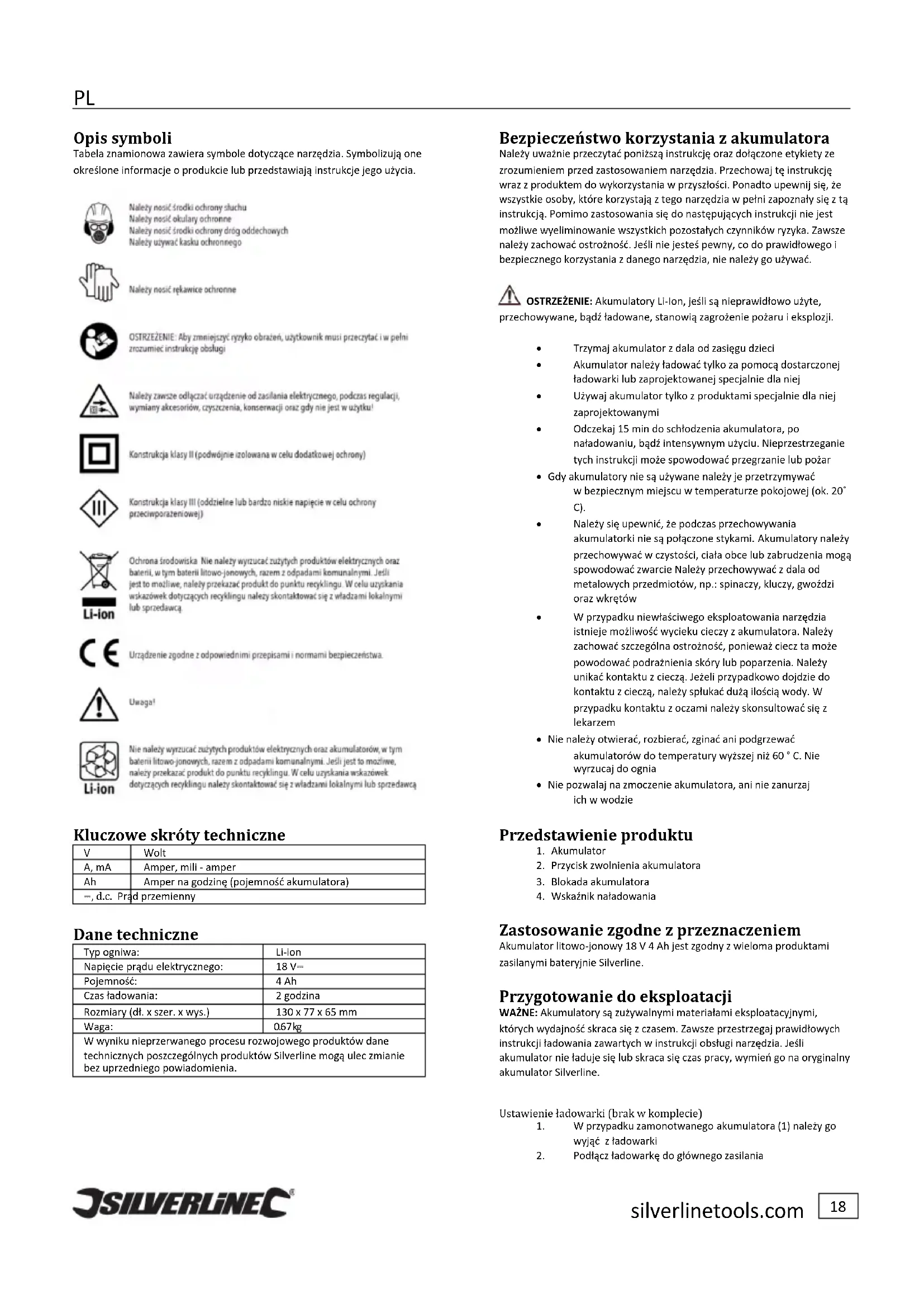 Zastosowanie%zgodne%z%przeznaczeniem% Akumulator litowo-jonowy 18 V 4 Ah jest zgodny z wieloma produktami zasilanymi bateryjnie Silverline. Przygotowanie%do%eksploatacji% WAŻNE: Akumulatory są zużywalnymi materiałami eksploatacyjnymi, których wydajność skraca się z czasem. Zawsze przestrzegaj prawidłowych instrukcji ładowania zawartych w instrukcji obsługi narzędzia. Jeśli akumulator nie ładuje się lub skraca się czas pracy, wymień go na oryginalny akumulator Silverline. !"#$%&'(&')*$+,%$-.&)/0-$.)%).,123'4&'5)