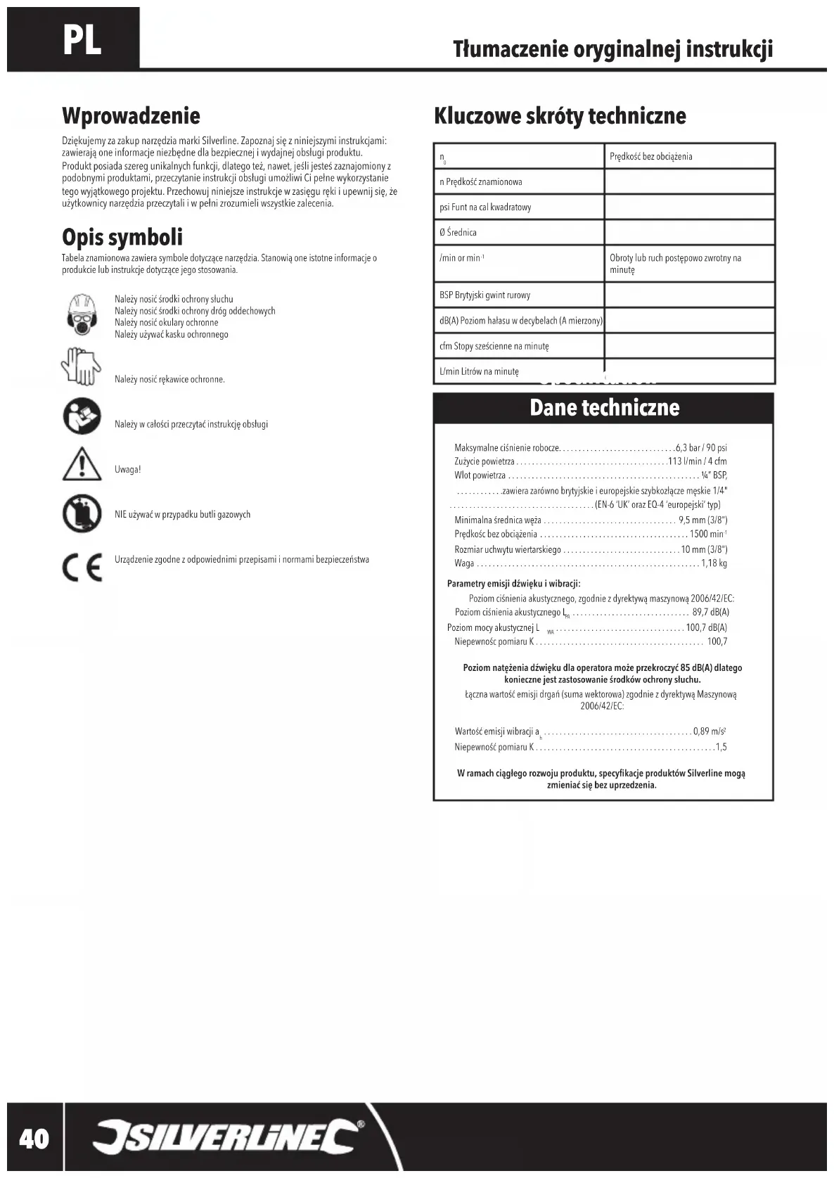 NiepewnośćpomiaruK ..............................................1,5 W ramach ciągłego rozwoju produktu, specykacje produktów Silverline mogą zmieniać się bez uprzedzenia. Specication Wprowadzenie DziękujemyzazakupnarzędziamarkiSilverline.Zapoznajsięzniniejszymiinstrukcjami:zawierająoneinformacjeniezbędnedlabezpiecznejiwydajnejobsługiproduktu.Produktposiadaszeregunikalnychfunkcji,dlategoteż,nawet,jeślijesteśzaznajomionyzpodobnymiproduktami,przeczytanieinstrukcjiobsługiumożliwiCipełnewykorzystanietegowyjątkowegoprojektu.Przechowujniniejszeinstrukcjewzasięgurękiiupewnijsię,żeużytkownicynarzędziaprzeczytaliiwpełnizrozumieliwszystkiezalecenia.