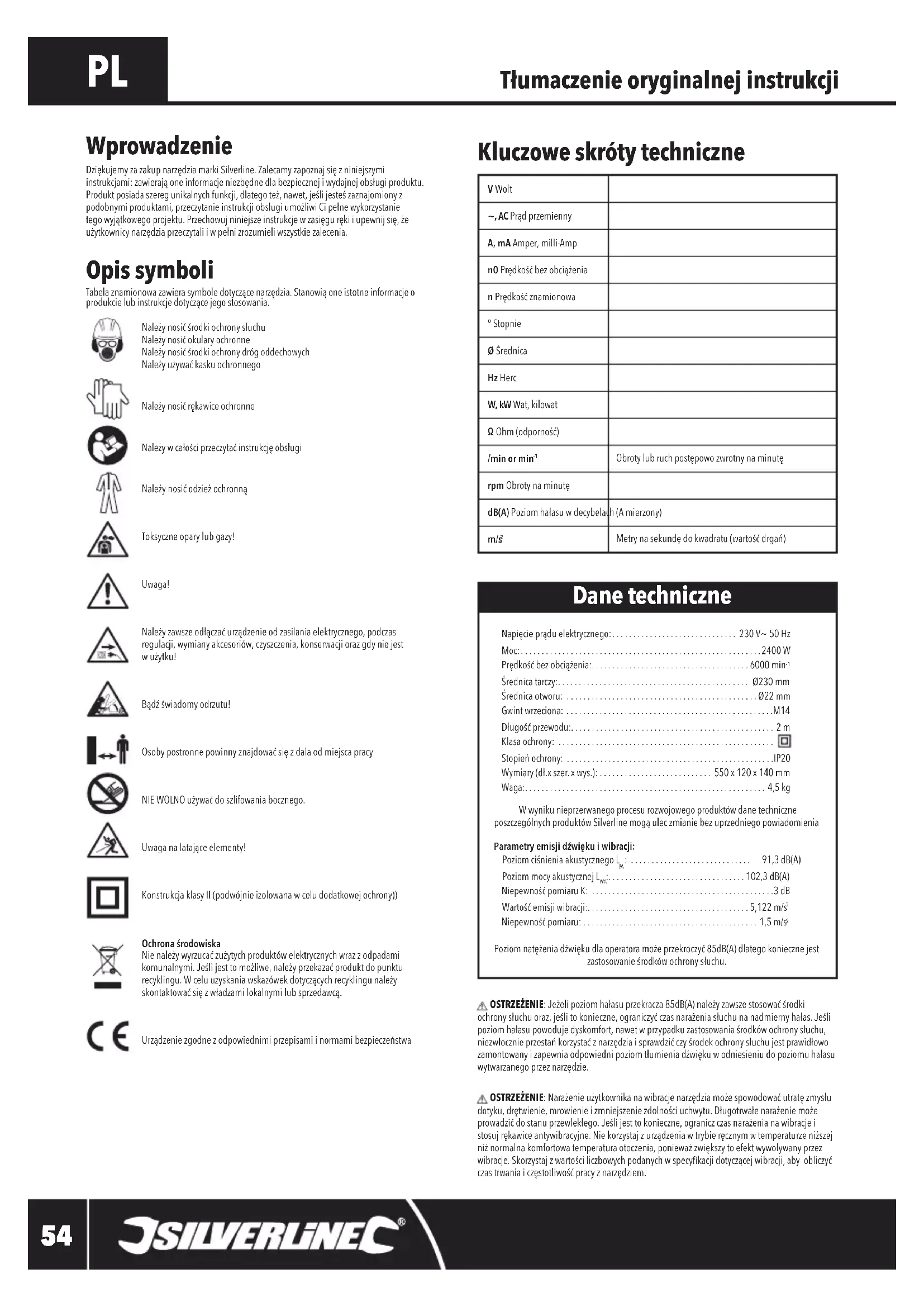 Średnicatarczy:.............................................. Ø230 mm Średnicaotworu:..............................................Ø22 mm Gwintwrzeciona:..................................................M14 Długośćprzewodu:.................................................2 m Klasaochrony:.................................................... Stopieńochrony:..................................................IP20 Wymiary(dł.xszer.xwys.):........................... 550x120x140mm Waga:..........................................................4,5 kg Wwynikunieprzerwanegoprocesurozwojowegoproduktówdanetechniczne poszczególnychproduktówSilverlinemogąuleczmianiebezuprzedniegopowiadomienia Parametry emisji dźwięku i wibracji: PoziomciśnieniaakustycznegoL