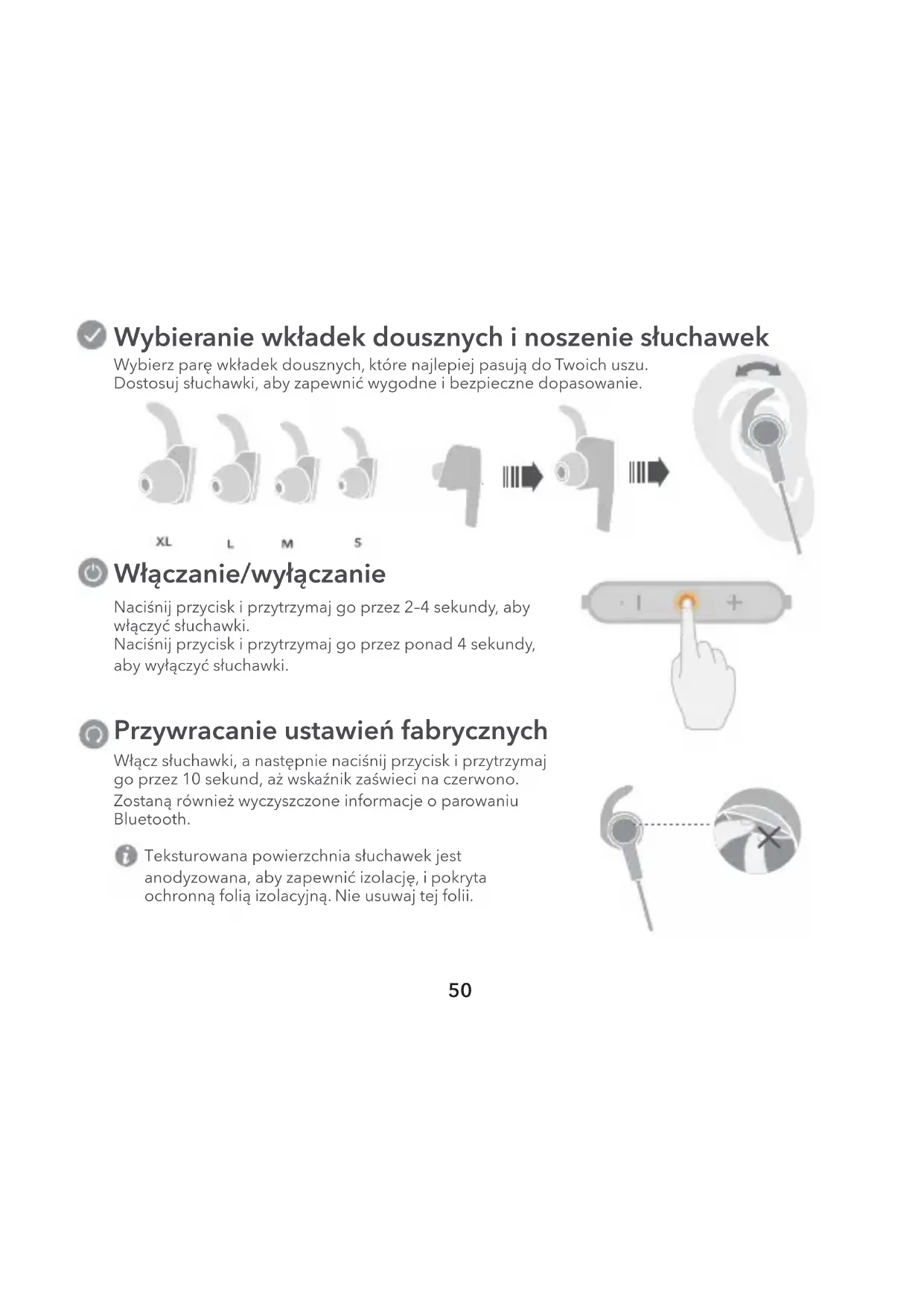 Inc.50 Wybieranie wkładek dousznych inoszenie słuchawek Wybierz parę wkładek dousznych, które najlepiej pasują do Twoich uszu. Dostosuj słuchawki, aby zapewnić wygodne ibezpieczne dopasowanie. Włączanie/wyłączanie Przywracanie ustawień fabrycznych Naciśnij przycisk iprzytrzymaj go przez 2–4 sekundy, aby włączyć słuchawki. Naciśnij przycisk iprzytrzymaj go przez ponad 4sekundy, aby wyłączyć słuchawki. Włącz słuchawki, anastępnie naciśnij przycisk iprzytrzymaj go przez 10sekund, aż wskaźnik zaświeci na czerwono. Zostaną również wyczyszczone informacje oparowaniu Bluetooth. Teksturowana powierzchnia słuchawek jest anodyzowana, aby zapewnić izolację, ipokryta ochronną folią izolacyjną. Nie usuwaj tej folii.51 Parowanie Przy pierwszym włączeniu słuchawki przejdą automatycznie do trybu parowania. Po przejściu do trybu parowania słuchawki wyłączą się automatycznie, jeśli połączenie nie zostanie nawiązane wciągu 3minut. Ponowne łączenie podczas włączania Gdy włączysz słuchawki, automatycznie nawiążą one ponownie połączenie zostatnim telefonem, z którym były połączone. Wznawianie połączenia po znalezieniu się poza zasięgiem urządzenia Gdy słuchawki rozłączą się ztelefonem: Jeśli wciągu mniej niż 10minut znajdziesz się zpowrotem wzasięgu Bluetooth, połączenie zostanie wznowione automatycznie. Jeśli znajdziesz się zpowrotem wzasięgu wciągu 10–30 minut, połączenie możesz wznowić ręcznie. Jeśli po 30minutach nadal nie będziesz wzasięgu, słuchawki wyłączą się automatycznie. Ze względu na różnice wtechnologiach Bluetooth niektóre modele telefonów nie obsługują automatycznego wznawiania połączenia. Nie oznacza to problemu ze słuchawkami. Łączenie zdwoma telefonami