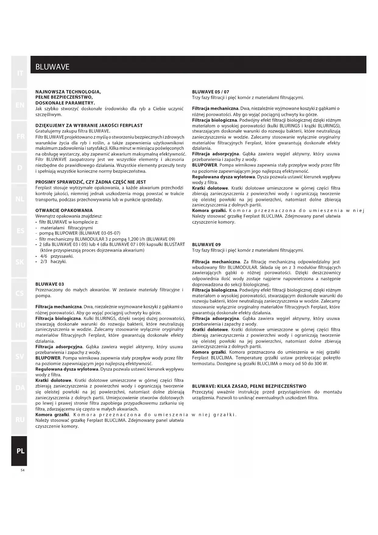 - 2/3 haczyki. BLUWAVE 03 Przeznaczony do małych akwariów. W zestawie materiały filtracyjne i pompa. Filtracja mechaniczna. Dwa, niezależnie wyjmowane koszyki z gąbkami o różnej porowatości. Aby go wyjąć pociągnij uchwyty ku górze. Filtracja biologiczna. Kulki BLURINGS, dzięki swojej dużej porowatości, stwarzają doskonałe warunki do rozwoju bakterii, które neutralizują zanieczyszczenia w wodzie. Zalecamy stosowanie wyłącznie oryginalny materiałów filtracyjnych Ferplast, które gwarantują doskonałe efekty działania. Filtracja adsorpcyjna. Gąbka zawiera węgiel aktywny, który usuwa przebarwienia i zapachy z wody. BLUPOWER. Pompa wirnikowa zapewnia stały przepływ wody przez filtr na poziomie zapewniającym jego najlepszą efektywność. Regulowana dysza wylotowa. Dysza pozwala ustawić kierunek wypływu wody z filtra. Kratki dolotowe. Kratki dolotowe umieszczone w górnej części filtra zbierają zanieczyszczenia z powierzchni wody i ograniczają tworzenie się oleistej powłoki na jej powierzchni, natomiast dolne zbierają zanieczyszczenia z dolnych partii. Umiejscowienie otworów dolotowych po lewej i prawej stronie filtra zapobiega przypadkowemu zatkaniu się filtra, zdarzającemu się często w małych akwariach. Komora grzałki. Komora przeznaczona do umieszenia w niej grzałki. Należy stosować grzałkę Ferplast BLUCLIMA. Zdejmowany panel ułatwia czyszczenie komory. BLUWAVE 05 / 07 Trzy fazy filtracji i pięć komór z materiałami filtrującymi. Filtracja mechaniczna. Dwa, niezależnie wyjmowane koszyki z gąbkami o różnej porowatości. Aby go wyjąć pociągnij uchwyty ku górze. Filtracja biologiczna. Podwójny efekt filtracji biologicznej dzięki różnym materiałom o wysokiej porowatości (kulki BLURINGS i krążki BLURINGS), stwarzającym doskonałe warunki do rozwoju bakterii, które neutralizują zanieczyszczenia w wodzie. Zalecamy stosowanie wyłącznie oryginalny materiałów filtracyjnych Ferplast, które gwarantują doskonałe efekty działania. Filtracja adsorpcyjna. Gąbka zawiera węgiel aktywny, który usuwa przebarwienia i zapachy z wody. BLUPOWER. Pompa wirnikowa zapewnia stały przepływ wody przez filtr na poziomie zapewniającym jego najlepszą efektywność. Regulowana dysza wylotowa. Dysza pozwala ustawić kierunek wypływu wody z filtra. Kratki dolotowe. Kratki dolotowe umieszczone w górnej części filtra zbierają zanieczyszczenia z powierzchni wody i ograniczają tworzenie się oleistej powłoki na jej powierzchni, natomiast dolne zbierają zanieczyszczenia z dolnych partii. Komora grzałki. Komora przeznaczona do umieszenia w niej grzałki. Należy stosować grzałkę Ferplast BLUCLIMA. Zdejmowany panel ułatwia czyszczenie komory. BLUWAVE 09 Trzy fazy filtracji i pięć komór z materiałami filtrującymi. Filtracja mechaniczna. Za filtrację mechaniczną odpowiedzialny jest wbudowany filtr BLUMODULAR. Składa się on z 3 modułów filtrujących zawierających gąbki o różnej porowatości. Dzięki deszczownicy odpowiednia ilość wody zostaje najpierw napowietrzona a następnie doprowadzona do sekcji biologicznej. Filtracja biologiczna. Podwójny efekt filtracji biologicznej dzięki różnym materiałom o wysokiej porowatości, stwarzającym doskonałe warunki do rozwoju bakterii, które neutralizują zanieczyszczenia w wodzie. Zalecamy stosowanie wyłącznie oryginalny materiałów filtracyjnych Ferplast, które gwarantują doskonałe efekty działania. Filtracja adsorpcyjna. Gąbka zawiera węgiel aktywny, który usuwa przebarwienia i zapachy z wody. Kratki dolotowe. Kratki dolotowe umieszczone w górnej części filtra zbierają zanieczyszczenia z powierzchni wody i ograniczają tworzenie się oleistej powłoki na jej powierzchni, natomiast dolne zbierają zanieczyszczenia z dolnych partii. Komora grzałki. Komora przeznaczona do umieszenia w niej grzałki Ferplast BLUCLIMA. Temperaturę grzałki ustaw przekręcając pokrętło termostatu. Dostępne są grzałki BLUCLIMA o mocy od 50 do 300 W. BLUWAVE: KILKA ZASAD, PEŁNE BEZPIECZEŃSTWO Przeczytaj uważnie instrukcję przed przystąpieniem do montażu urządzenia. Pozwoli to uniknąć ewentualnych uszkodzeń filtra. 363110-3_FI_BLUWAVE_nero.indd 54363110-3_FI_BLUWAVE_nero.indd 54 17/05/11 12.2517/05/11 12.2555