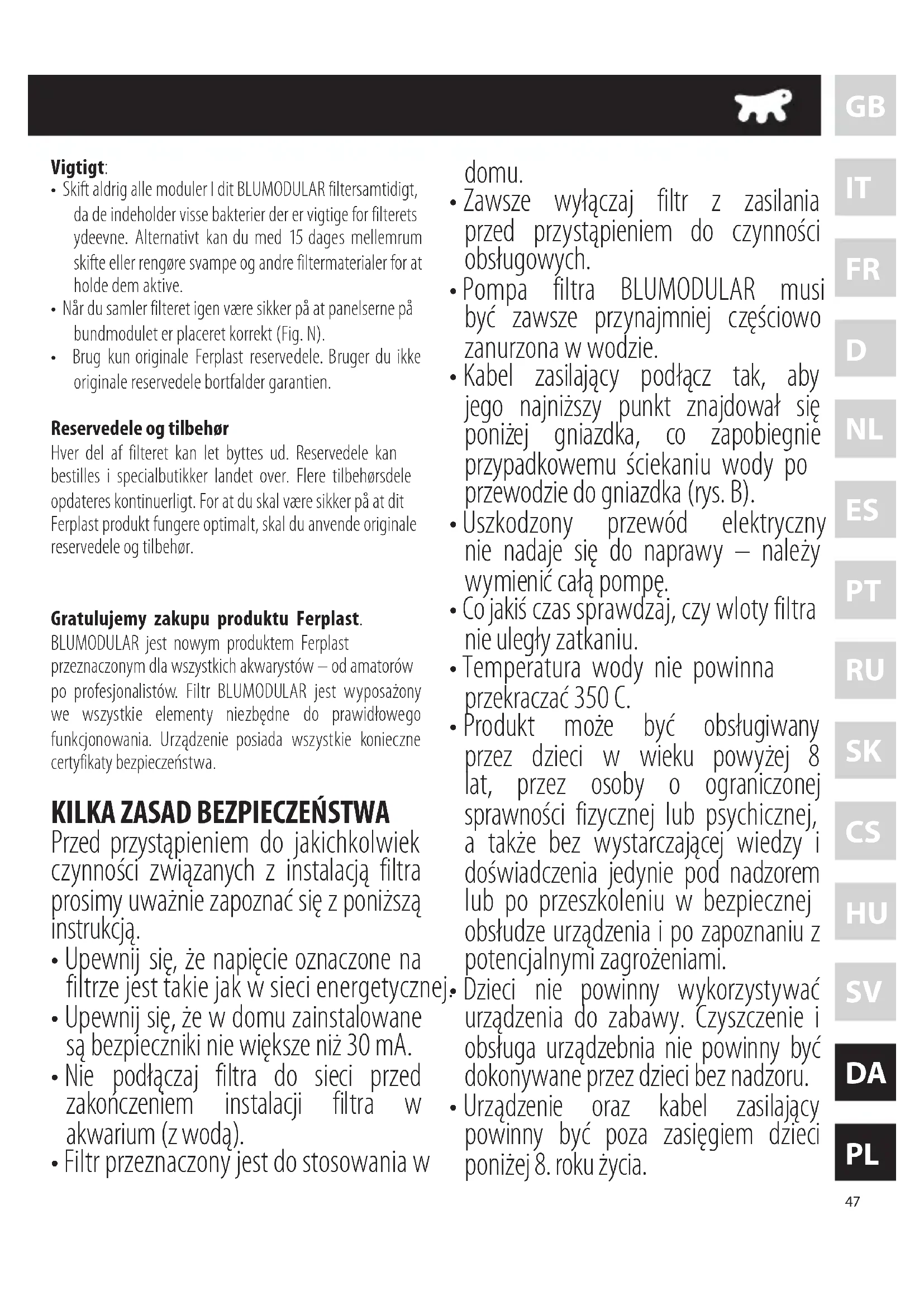 - Brug kun originale Ferplast reservedele. Bruger du ikke originale reservedele bortfalder garantien. Reservedele og tilbehør Hver del af filteret kan let byttes ud. Reservedele kan bestilles i specialbutikker landet over. Flere tilbehørsdele opdateres kontinuerligt. For at du skal være sikker på at dit Ferplast produkt fungere optimalt, skal du anvende originale reservedele og tilbehør. Gratulujemy zakupu produktu Ferplast. BLUMODULAR jest nowym produktem Ferplast przeznaczonym dla wszystkich akwarystów – od amatorów po profesjonalistów. Filtr BLUMODULAR jest wyposażony we wszystkie elementy niezbędne do prawidłowego funkcjonowania. Urządzenie posiada wszystkie konieczne certyfikaty bezpieczeństwa.