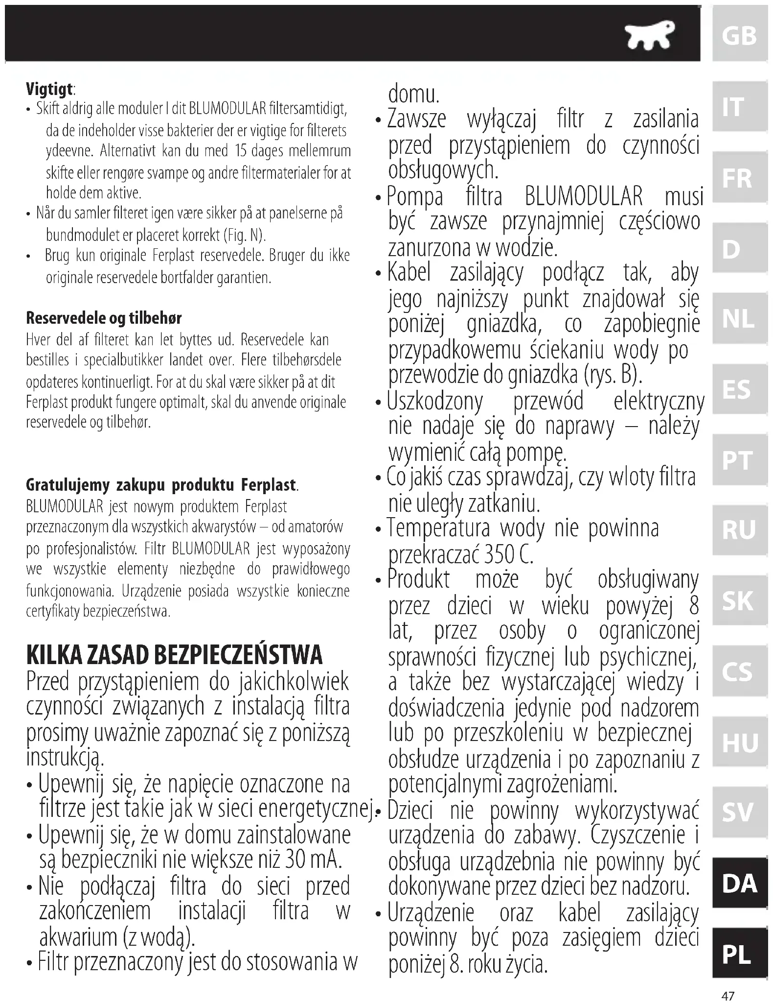 - Brug kun originale Ferplast reservedele. Bruger du ikke originale reservedele bortfalder garantien. Reservedele og tilbehør Hver del af filteret kan let byttes ud. Reservedele kan bestilles i specialbutikker landet over. Flere tilbehørsdele opdateres kontinuerligt. For at du skal være sikker på at dit Ferplast produkt fungere optimalt, skal du anvende originale reservedele og tilbehør. Gratulujemy zakupu produktu Ferplast. BLUMODULAR jest nowym produktem Ferplast przeznaczonym dla wszystkich akwarystów – od amatorów po profesjonalistów. Filtr BLUMODULAR jest wyposażony we wszystkie elementy niezbędne do prawidłowego funkcjonowania. Urządzenie posiada wszystkie konieczne certyfikaty bezpieczeństwa.