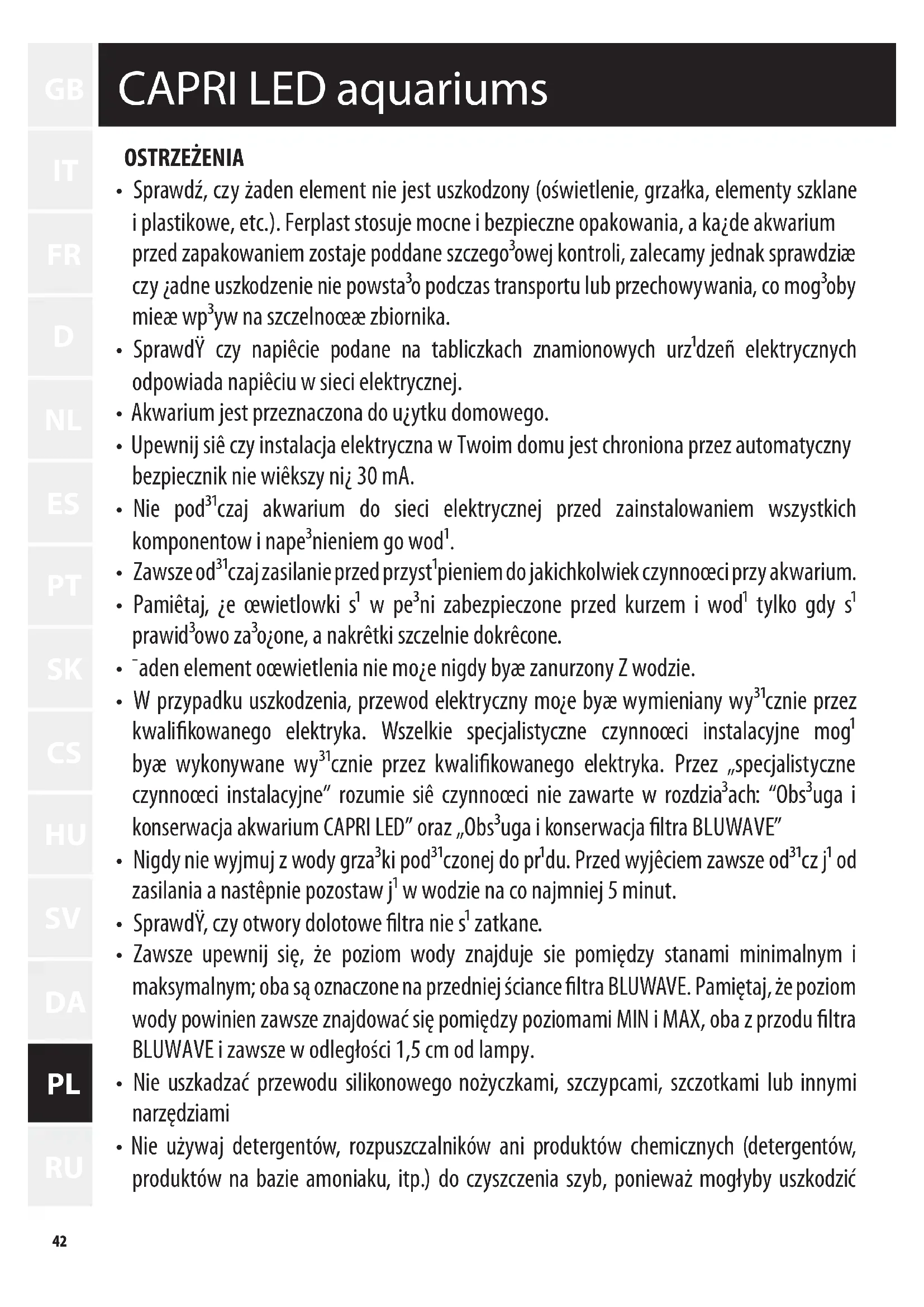 - W przypadku uszkodzenia, przewod elektryczny mo¿e byæ wymieniany wy³¹cznie przez kwalikowanego elektryka. Wszelkie specjalistyczne czynnoœci instalacyjne mog¹ byæ wykonywane wy³¹cznie przez kwalikowanego elektryka. Przez „specjalistyczne czynnoœci instalacyjne” rozumie siê czynnoœci nie zawarte w rozdzia³ach: “Obs³uga i konserwacja akwarium CAPRI LED” oraz „Obs³uga i konserwacja ltra BLUWAVE”