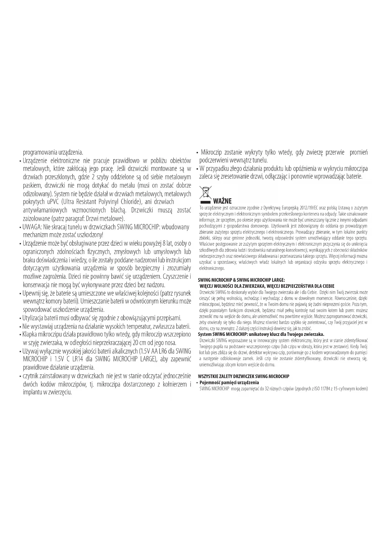 - W przypadku złego działania produktu lub opóźnienia w wykryciu mikroczipa zaleca się zresetowanie drzwi, odłączając i ponownie wprowadzając baterie. WAŻNE To urządzenie jest oznaczone zgodnie z Dyrektywą Europejską 2012/19/EC oraz polską Ustawą o zużytym sprzęcie elektrycznym i elektronicznym symbolem przekreślonego kontenera na odpady. Takie oznakowanie informuje, że sprzętten, po okresie jego użytkowania nie może być umieszczany łącznie z innymi odpadami pochodzącymi z gospodarstwa domowego. Użytkownik jest zobowiązany do oddania go prowadzącym zbieranie zużytego sprzętu elektrycznego i elektronicznego. Prowadzący zbieranie, w tym lokalne punkty zbiórki, sklepy oraz gminne jednostki, tworzą odpowiedni system umożliwiający oddanie tego sprzętu. Właściwe postępowanie ze zużytym sprzętem elektrycznym i elektronicznym przyczynia się do uniknięcia szkodliwych dla zdrowia ludzi i środowiska naturalnego konsekwencji, wynikających z obecności składników niebezpiecznych oraz niewłaściwego składowania i przetwarzania takiego sprzętu. Więcej informacji mozna uzyskać u sprzedawcy, właściwych władz lokalnych lub organizacji odzysku sprzętu elektrycznego i elektronicznego. SWING MICROCHIP & SWING MICROCHIP LARGE: WIĘCEJ WOLNOŚCI DLA ZWIERZAKA, WIĘCEJ BEZPIECZEŃSTWA DLA CIEBIE Drzwiczki SWING to doskonały wybór dla Twojego zwierzaka ale i dla Ciebie. Dzięki nim Twój zwierzak może cieszyć się pełną wolnością, wchodząc i wychodząc z domu w dowolnym momencie. Równocześnie, dzięki mikroczipowi, będziesz mieć pewność, że w Twoim domu nie pojawią się żadni nieproszeni goście. Poza tym, dzięki pozostałym funkcjom drzwiczek, będziesz miał pełną kontrolę nad swoim kotem lub psem: możesz zezwolić mu na wejście do domu, ale uniemożliwić mu powtórne wyjście. Możesz zaprogramować drzwiczki, żeby otwierały się tylko dla niego. Możesz również bardzo szybko się zorientować, czy Twój przyjaciel jest w domu, czy na zewnątrz. Z dalszej części instrukcji dowiesz się, jak to zrobić. System SWING MICROCHIP: unikatowy klucz dla Twojego zwierzaka. Drzwiczki SWING wyposażone są w innowacyjny system elektroniczny, który jest w stanie zidentyfikować Twojego pupila na podstawie wszczepionego czipu (lub czipu w obroży, która jest w zestawie). Kiedy Twój kot lub pies zbliża się do drzwi, detektor wykrywa czip, porównuje go z kodem wprowadzonym do pamięci a następnie odblokowuje zamek. Jeśli czip nie zostanie zidentyfikowany, drzwiczki nie otworzą się, uniemożliwiając obcym kotom wejście do domu.