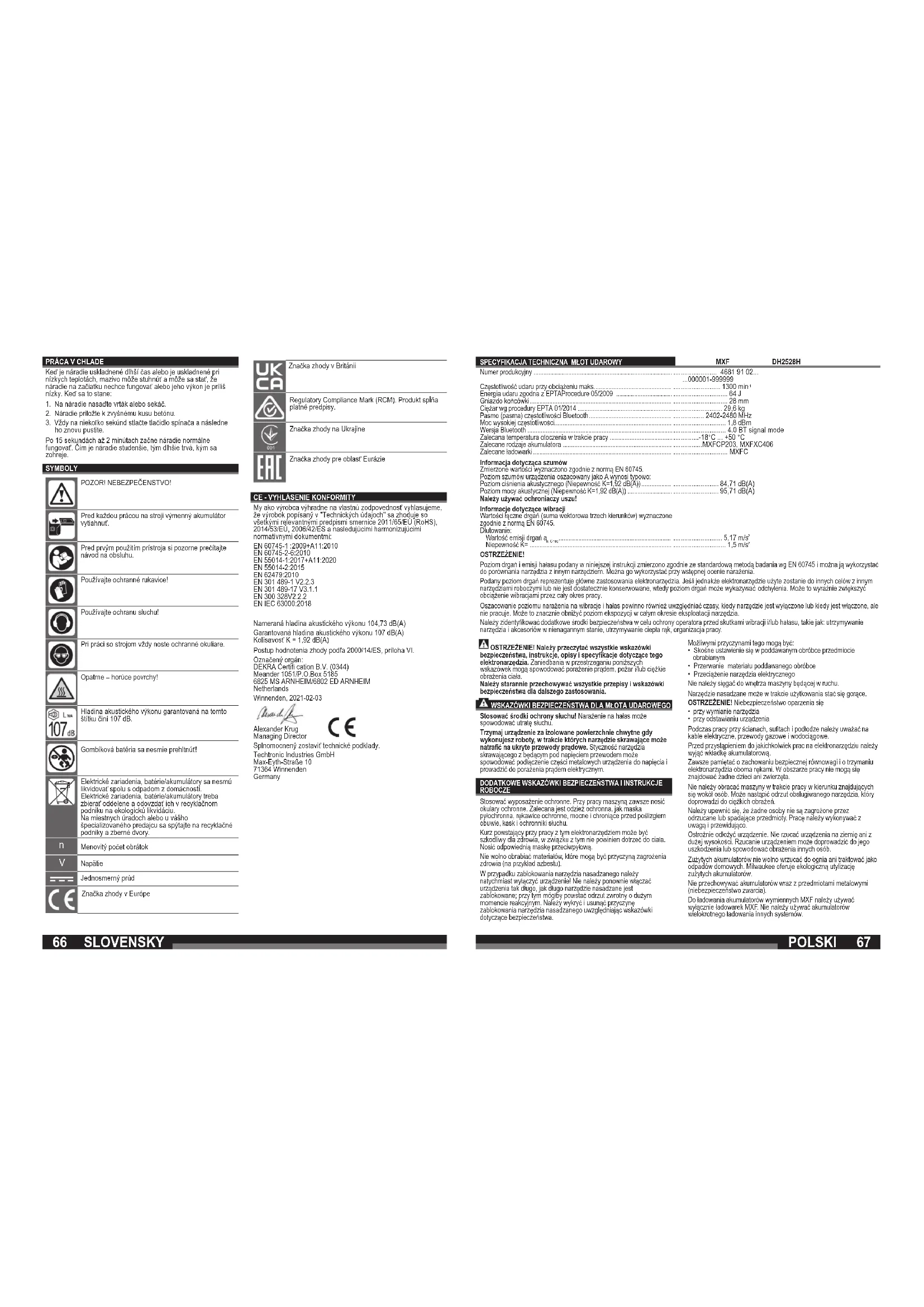 Jako producent oświadczamy na naszą wyłączną odpowiedzialność, że produkt opisany w punkcie „Dane techniczne” jest zgodny ze wszystkimi istotnymi przepisami Dyrektywy 2011/65/EU (RoHS), 2014/53/UE, 2006/42/WE oraz z następującymi zharmonizowanymi dokumentami normatywnymi: EN 60745-1 :2009+A11:2010 EN 60745-2-6:2010 EN 55014-1:2017+A11:2020 EN 55014-2:2015 EN 62479:2010 EN 301 489-1 V2.2.3 EN 301 489-17 V3.1.1 EN 300 328V2.2.2 EN IEC 63000:2018 Zmierzony poziom mocy akustycznej 104,73 dB(A) Gwarantowany poziom mocy akustycznej 107 dB(A) Niepewność K = 1,92 dB(A) Procedura oceny zgodności według 2000/14/WE Załącznik VI. Organ powiadamiany: DEKRA Certifi cation B.V. (0344) Meander 1051/P.O.Box 5185