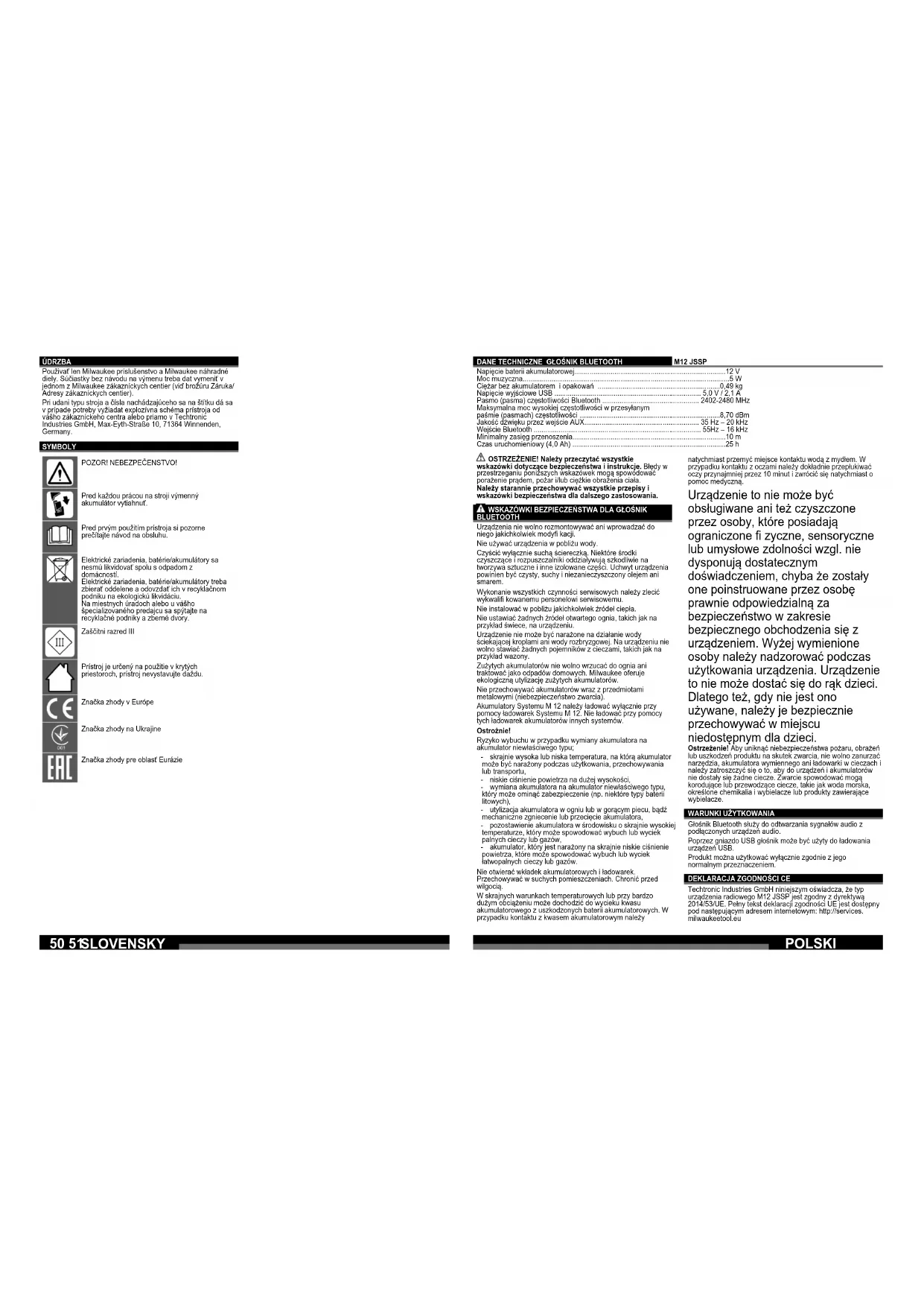 Napięcie baterii akumulatorowej.................................................. Moc muzyczna............................................................................. Ciężar bez akumulatorem i opakowań ...................................... Napięcie wyjściowe USB ............................................................. Pasmo (pasma) częstotliwości Bluetooth .................................... Maksymalna moc wysokiej częstotliwości w przesyłanym paśmie (pasmach) częstotliwości ................................................ Jakość dźwięku przez wejście AUX............................................. Wejście Bluetooth ........................................................................ Minimalny zasięg przenoszenia................................................... Czas uruchomieniowy (4,0 Ah) .................................................... OSTRZEŻENIE! Należy przeczytać wszystkie wskazówki dotyczące bezpieczeństwa i instrukcje. Błędy w przestrzeganiu poniższych wskazówek mogą spowodować porażenie prądem, pożar i/lub ciężkie obrażenia ciała. Należy starannie przechowywać wszystkie przepisy i wskazówki bezpieczeństwa dla dalszego zastosowania. WSKAZÓWKI BEZPIECZEŃSTWA DLA GŁOŚNIK BLUETOOTH Urządzenia nie wolno rozmontowywać ani wprowadzać do niego jakichkolwiek modyfi kacji. Nie używać urządzenia w pobliżu wody. Czyścić wyłącznie suchą ściereczką. Niektóre środki czyszczące i rozpuszczalniki oddziaływują szkodliwie na tworzywa sztuczne i inne izolowane części. Uchwyt urządzenia powinien być czysty, suchy i niezanieczyszczony olejem ani smarem. Wykonanie wszystkich czynności serwisowych należy zlecić wykwalifi kowanemu personelowi serwisowemu. Nie instalować w pobliżu jakichkolwiek źródeł ciepła. Nie ustawiać żadnych źródeł otwartego ognia, takich jak na przykład świece, na urządzeniu. Urządzenie nie może być narażone na działanie wody ściekającej kroplami ani wody rozbryzgowej. Na urządzeniu nie wolno stawiać żadnych pojemników z cieczami, takich jak na przykład wazony. Zużytych akumulatorów nie wolno wrzucać do ognia ani traktować jako odpadów domowych. Milwaukee oferuje ekologiczną utylizację zużytych akumulatorów. Nie przechowywać akumulatorów wraz z przedmiotami metalowymi (niebezpieczeństwo zwarcia). Akumulatory Systemu M 12 należy ładować wyłącznie przy pomocy ładowarek Systemu M 12. Nie ładować przy pomocy tych ładowarek akumulatorów innych systemów. Ostrożnie! Ryzyko wybuchu w przypadku wymiany akumulatora na akumulator niewłaściwego typu; - skrajnie wysoka lub niska temperatura, na którą akumulator może być narażony podczas użytkowania, przechowywania lub transportu, - niskie ciśnienie powietrza na dużej wysokości, - wymiana akumulatora na akumulator niewłaściwego typu, który może ominąć zabezpieczenie (np. niektóre typy baterii litowych), - utylizacja akumulatora w ogniu lub w gorącym piecu, bądź mechaniczne zgniecenie lub przecięcie akumulatora, - pozostawienie akumulatora w środowisku o skrajnie wysokiej temperaturze, który może spowodować wybuch lub wyciek palnych cieczy lub gazów, - akumulator, który jest narażony na skrajnie niskie ciśnienie powietrza, które może spowodować wybuch lub wyciek łatwopalnych cieczy lub gazów. Nie otwierać wkładek akumulatorowych i ładowarek. Przechowywać w suchych pomieszczeniach. Chronić przed wilgocią. W skrajnych warunkach temperaturowych lub przy bardzo dużym obciążeniu może dochodzić do wycieku kwasu akumulatorowego z uszkodzonych baterii akumulatorowych. W przypadku kontaktu z kwasem akumulatorowym należy natychmiast przemyć miejsce kontaktu wodą z mydłem. W przypadku kontaktu z oczami należy dokładnie przepłukiwać oczy przynajmniej przez 10 minut i zwrócić się natychmiast o pomoc medyczną. Urządzenie to nie może być obsługiwane ani też czyszczone przez osoby, które posiadają ograniczone fi zyczne, sensoryczne lub umysłowe zdolności wzgl. nie dysponują dostatecznym doświadczeniem, chyba że zostały one poinstruowane przez osobę prawnie odpowiedzialną za bezpieczeństwo w zakresie bezpiecznego obchodzenia się z urządzeniem. Wyżej wymienione osoby należy nadzorować podczas użytkowania urządzenia. Urządzenie to nie może dostać się do rąk dzieci. Dlatego też, gdy nie jest ono używane, należy je bezpiecznie przechowywać w miejscu niedostępnym dla dzieci. Ostrzeżenie! Aby uniknąć niebezpieczeństwa pożaru, obrażeń lub uszkodzeń produktu na skutek zwarcia, nie wolno zanurzać narzędzia, akumulatora wymiennego ani ładowarki w cieczach i należy zatroszczyć się o to, aby do urządzeń i akumulatorów nie dostały się żadne ciecze. Zwarcie spowodować mogą korodujące lub przewodzące ciecze, takie jak woda morska, określone chemikalia i wybielacze lub produkty zawierające wybielacze.