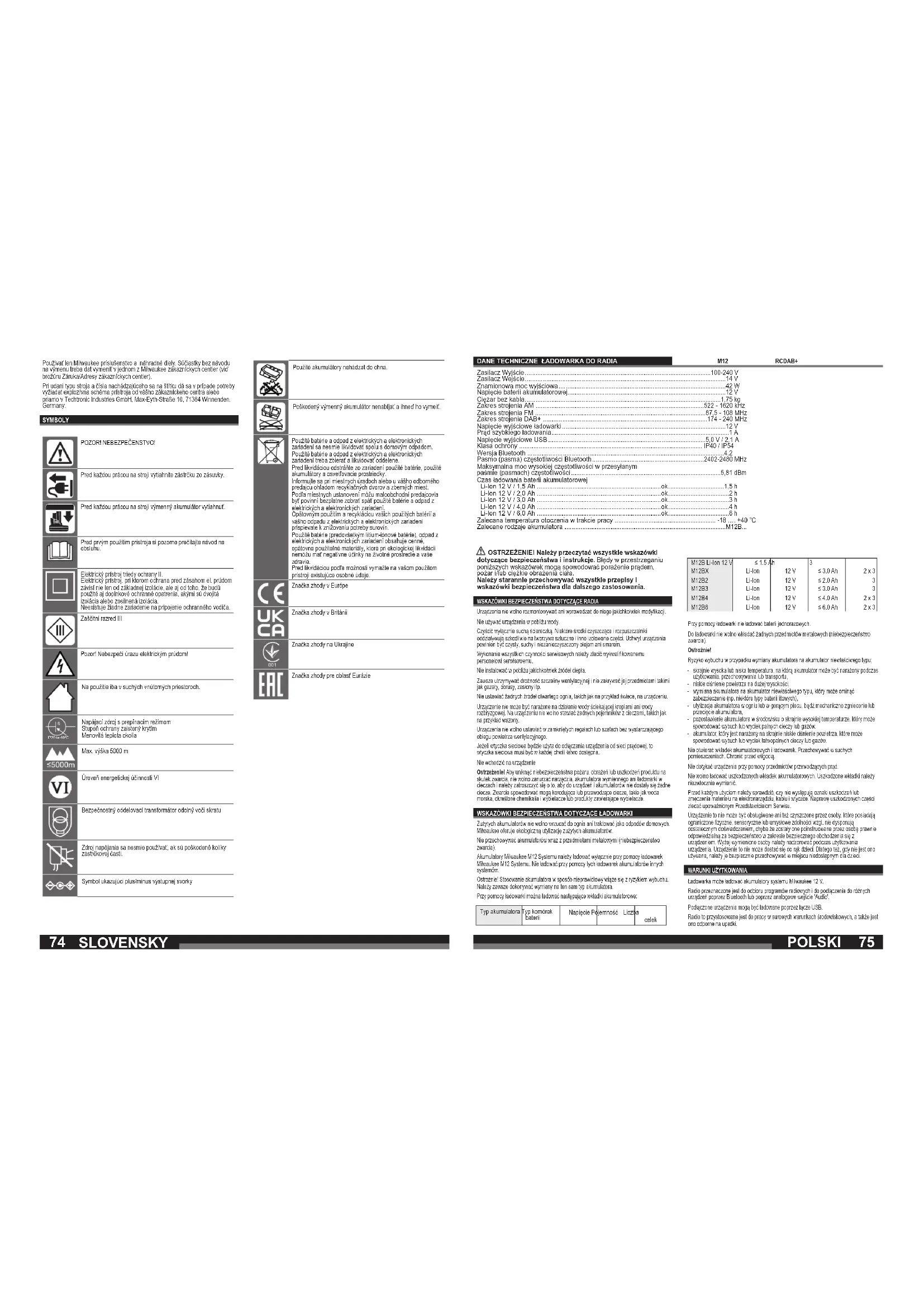 Ładowarka może ładować akumulatory systemu Milwaukee 12 V. Radio przeznaczone jest do odbioru programów radiowych i do podłączenia do różnych urządzeń poprzez Bluetooth lub poprzez analogowe wejście 'Audio'. Podłączone urządzenia mogą być ładowane poprzez łącze USB. Radio to przystosowane jest do pracy w surowych warunkach środowiskowych, a także jest ono odporne na upadki. POLSKI SLOVENSKY76 77 POLSKIPOLSKI Produkt można użytkować wyłącznie zgodnie z jego normalnym przeznaczeniem.