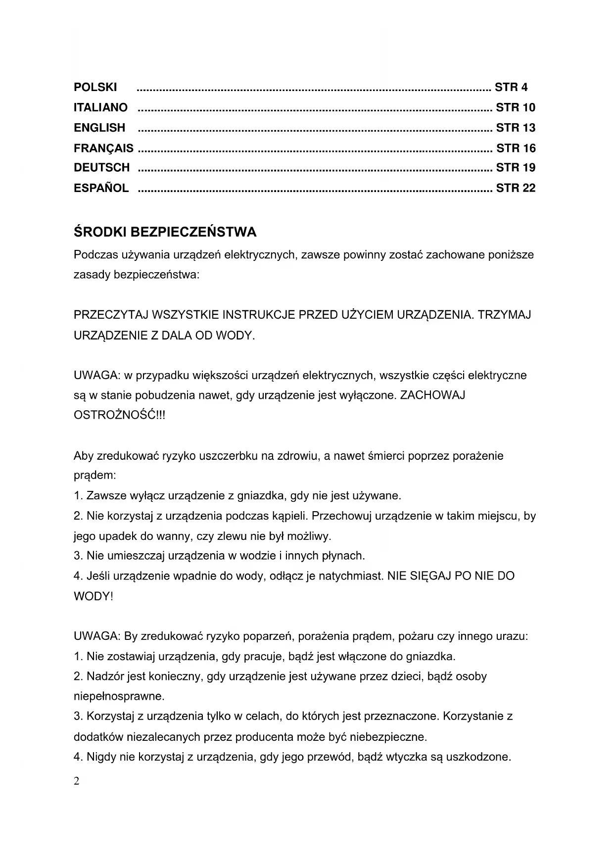 Podczas używania urządzeń elektrycznych, zawsze powinny zostać zachowane poniższe zasady bezpieczeństwa: PRZECZYTAJ WSZYSTKIE INSTRUKCJE PRZED UŻYCIEM URZĄDZENIA. TRZYMAJ URZĄDZENIE Z DALA OD WODY. UWAGA: w przypadku większości urządzeń elektrycznych, wszystkie części elektryczne są w stanie pobudzenia nawet, gdy urządzenie jest wyłączone. ZACHOWAJ OSTROŻNOŚĆ!!! Aby zredukować ryzyko uszczerbku na zdrowiu, a nawet śmierci poprzez porażenie prądem: