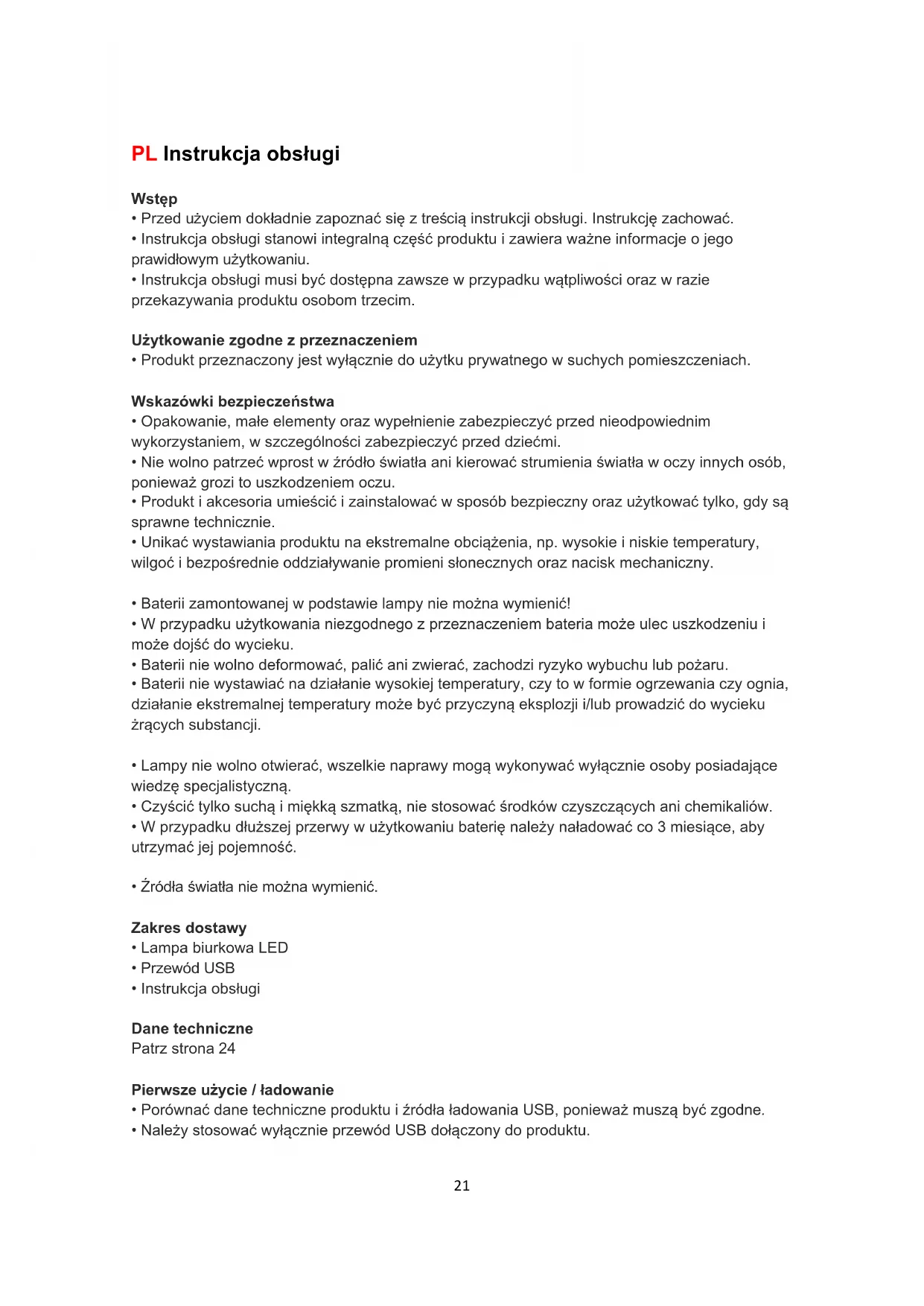 - Instrukcja obsługi Dane techniczne Patrz strona 24 Pierwsze użycie / ładowanie