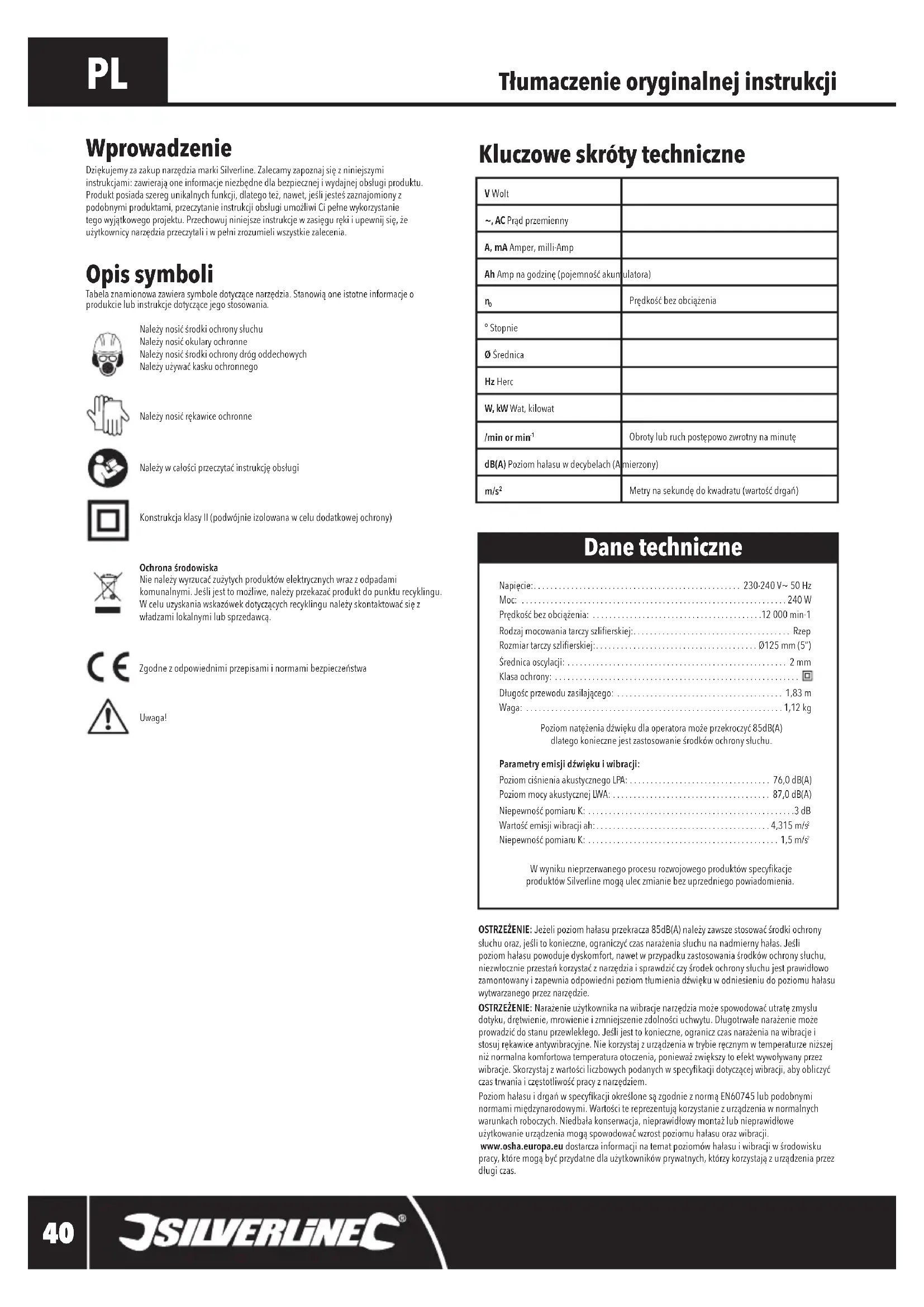 Metrynasekundędokwadratu(wartośćdrgań) Wprowadzenie DziękujemyzazakupnarzędziamarkiSilverline.Zalecamyzapoznajsięzniniejszymi instrukcjami:zawierająoneinformacjeniezbędnedlabezpiecznejiwydajnejobsługiproduktu. Produktposiadaszeregunikalnychfunkcji,dlategoteż,nawet,jeślijesteśzaznajomionyz podobnymiproduktami,przeczytanieinstrukcjiobsługiumożliwiCipełnewykorzystanie tegowyjątkowegoprojektu.Przechowujniniejszeinstrukcjewzasięgurękiiupewnijsię,że użytkownicynarzędziaprzeczytaliiwpełnizrozumieliwszystkiezalecenia. Napięcie:.................................................. 230-240 V~ 50 Hz Moc: ................................................................240 W Prędkośćbezobciążenia: .........................................12 000 min-1 Rodzajmocowaniatarczyszlierskiej:...................................... Rzep Rozmiartarczyszlierskiej:.......................................Ø125 mm (5”) Średnicaoscylacji: ..................................................... 2 mm Klasa ochrony: ........................................................... Długoścprzewoduzasilającego: ........................................ 1,83 m Waga: ..............................................................1,12kg Poziomnatężeniadźwiękudlaoperatoramożeprzekroczyć85dB(A) dlategokoniecznejestzastosowanieśrodkówochronysłuchu. Parametryemisjidźwiękuiwibracji: PoziomciśnieniaakustycznegoLPA: .................................. 76,0 dB(A) PoziommocyakustycznejLWA:...................................... 87,0 dB(A) NiepewnośćpomiaruK: ..................................................3 dB Wartośćemisjiwibracjiah:..........................................4,315 m/s