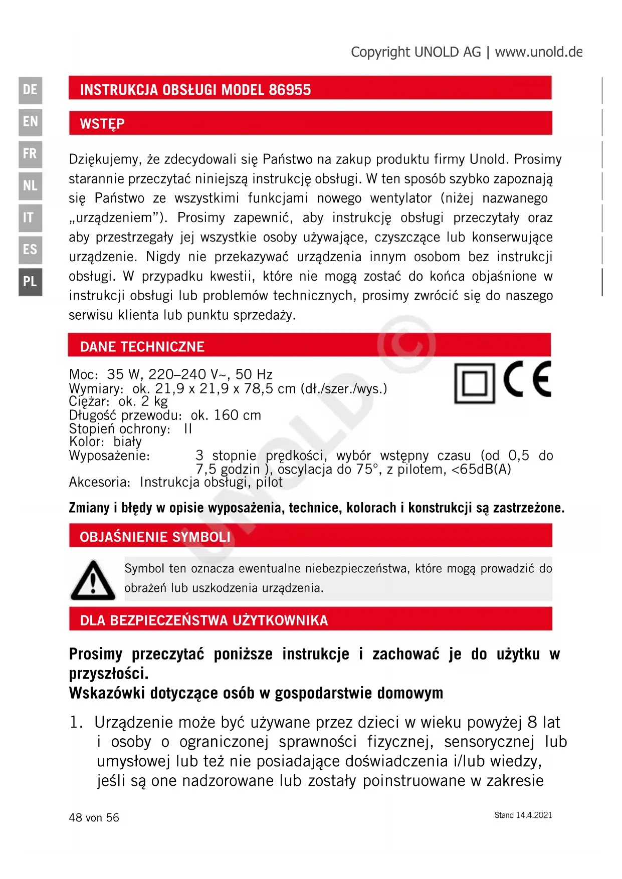 Symbol ten oznacza ewentualne niebezpieczeństwa, które mogą prowadzić do obrażeń lub uszkodzenia urządzenia. WSTĘP Dziękujemy, że zdecydowali się Państwo na zakup produktu firmy Unold. Prosimy starannie przeczytać niniejszą instrukcję obsługi. W ten sposób szybko zapoznają się Państwo ze wszystkimi funkcjami nowego wentylator (niżej nazwanego „urządzeniem”). Prosimy zapewnić, aby instrukcję obsługi przeczytały oraz aby przestrzegały jej wszystkie osoby używające, czyszczące lub konserwujące urządzenie. Nigdy nie przekazywać urządzenia innym osobom bez instrukcji obsługi. W przypadku kwestii, które nie mogą zostać do końca objaśnione w instrukcji obsługi lub problemów technicznych, prosimy zwrócić się do naszego serwisu klienta lub punktu sprzedaży. Copyright UNOLD AG | www.unold.de UNOLD ©Stand 14.4.2021 49 von 56
