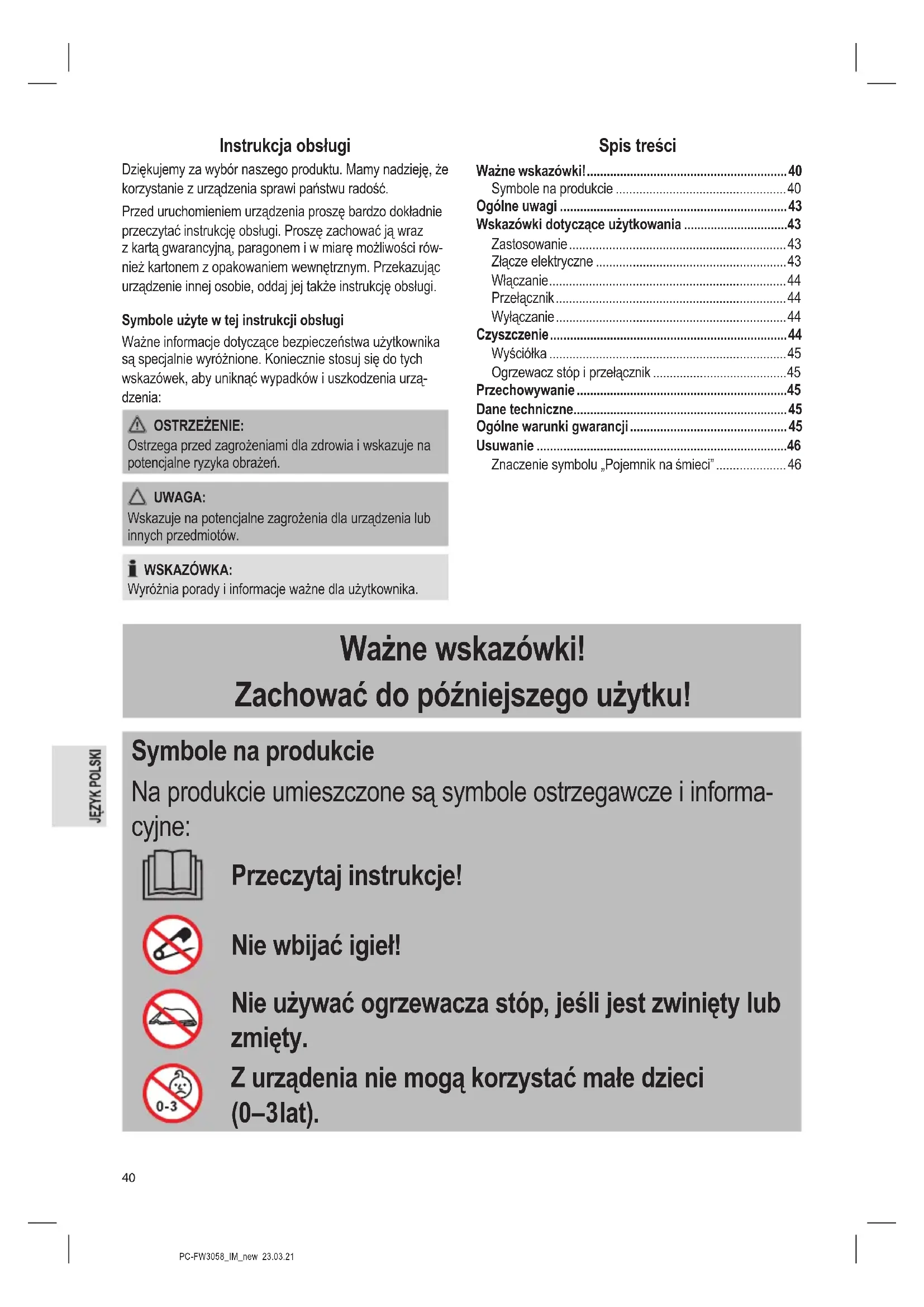 - Znaczenie symbolu „Pojemnik na śmieci” Ważne wskazówki! Zachować do późniejszego użytku! Symbole na produkcie Na produkcie umieszczone są symbole ostrzegawcze i informa- cyjne: Przeczytaj instrukcje! Nie wbijać igieł! Nie używać ogrzewacza stóp, jeśli jest zwinięty lub zmięty. Z urządenia nie mogą korzystać małe dzieci (0 – 3 lat).PC-FW3058_IM_new 23.03.21 p. 46