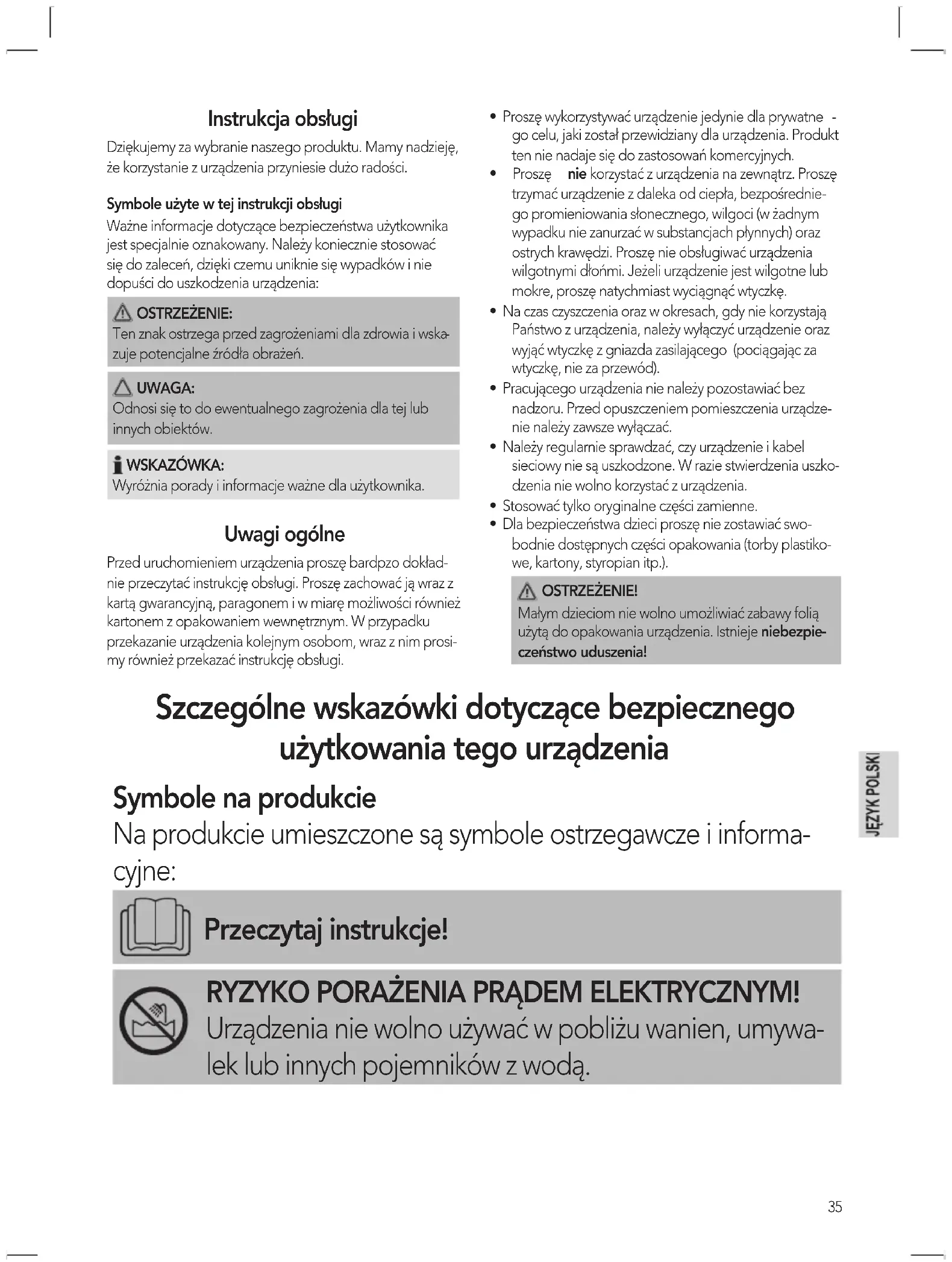 ity and low voltage directives, and has been constructed in accordance with the latest safety regulations. Cleaning34 Disposal Meaning of the “Dustbin” Symbol Protect our environment: do not dispose of electrical equipment in the domestic, paper, glass, or biological waste. Please return any electrical equipment that you will no longer use to the collection points provided for their disposal. This helps avoid the potential effects of incorrect disposal on the environment and human and animal health. This will contribute to the recycling and other forms of reutilization of electrical and electronic equipment. Information concerning where the equipment can be disposed of can be obtained from your local authorities.35 Instrukcja obsługi Dziękujemy za wybranie naszego produktu. Mamy nadzieję, że korzystanie z urządzenia przyniesie dużo radości. Symbole użyte w tej instrukcji obsługi Ważne informacje dotyczące bezpieczeństwa użytkownika jest specjalnie oznakowany. Należy koniecznie stosować się do zaleceń, dzięki czemu uniknie się wypadków i nie dopuści do uszkodzenia urządzenia: OSTRZEŻENIE: Ten znak ostrzega przed zagrożeniami dla zdrowia i wska