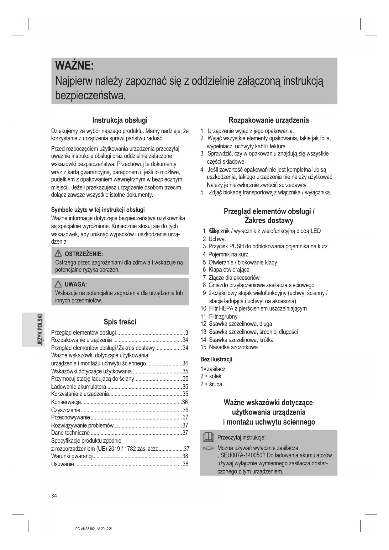 Przegląd elementów obsługi / Zakres dostawy 1 włącznik / wyłącznik z wielofunkcyjną diodą LED 2 Uchwyt 3 Przycisk PUSH do odblokowania pojemnika na kurz 4 Pojemnik na kurz 5 Otwieranie / blokowanie klapy 6 Klapa otwierająca 7 Złącze dla akcesoriów 8 Gniazdo przyłączeniowe zasilacza sieciowego 9 2-częściowy stojak wielofunkcyjny (uchwyt ścienny / stacja ładująca i uchwyt na akcesoria) 10 Filtr HEPA z pierścieniem uszczelniającym 11 Filtr zgrubny 12 Ssawka szczelinowa, długa 13 Ssawka szczelinowa, średniej długości 14 Ssawka szczelinowa, krótka 15 Nasadka szczotkowa Bez ilustracji 1 × zasilacz 2 × kołek 2 × śruba Ważne wskazówki dotyczące użytkowania urządzenia i montażu uchwytu ściennego Przeczytaj instrukcje! Można używać wyłącznie zasilacza „ SEU007A-140050”! Do ładowania akumulatorów używaj wyłącznie wymiennego zasilacza dostar- czonego z tym urządzeniem.PC-AKS3102_IM 29.12.21