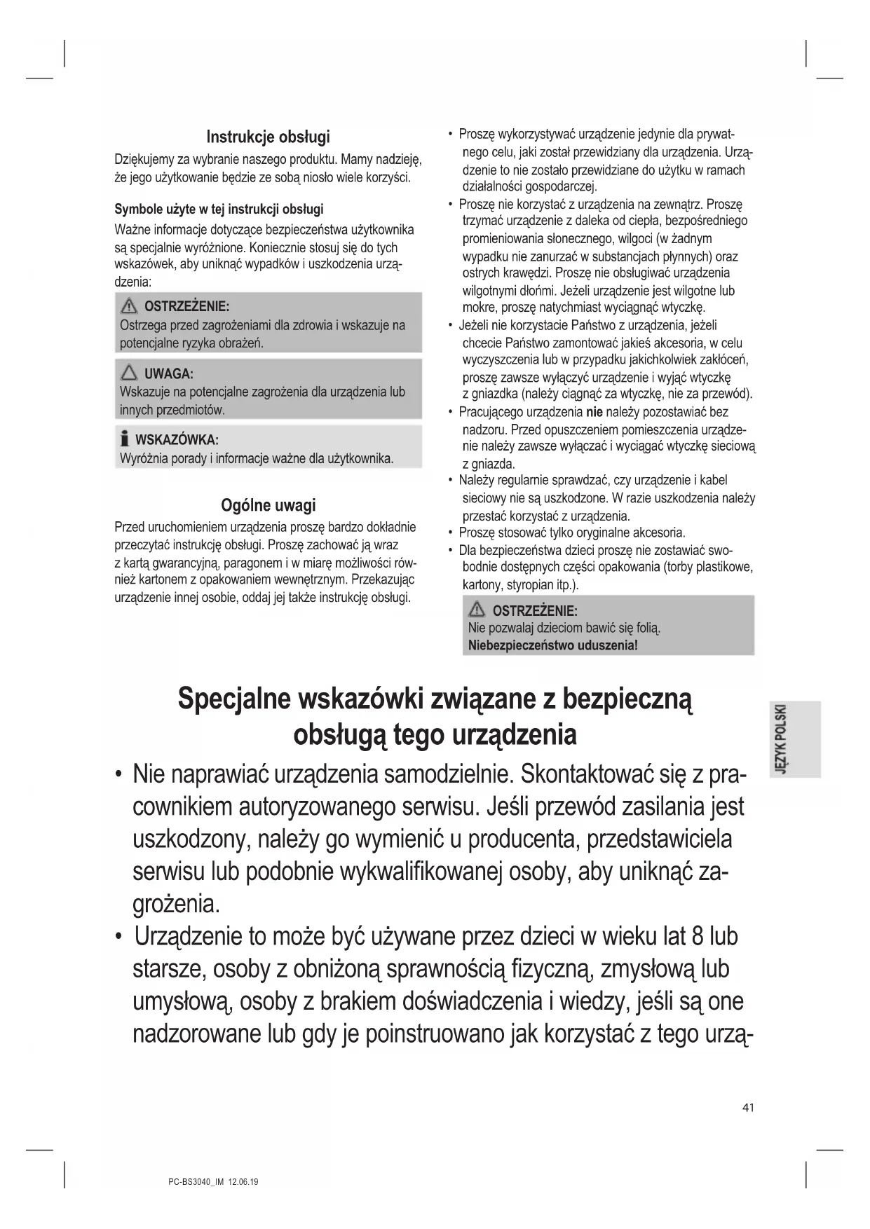- Urządzenie to może być używane przez dzieci w wieku lat 8 lub starsze, osoby z obniżoną sprawnością zyczną, zmysłową lub umysłową, osoby z brakiem doświadczenia i wiedzy, jeśli są one nadzorowane lub gdy je poinstruowano jak korzystać z tego urzą-PC-BS3040_IM 12.06.19