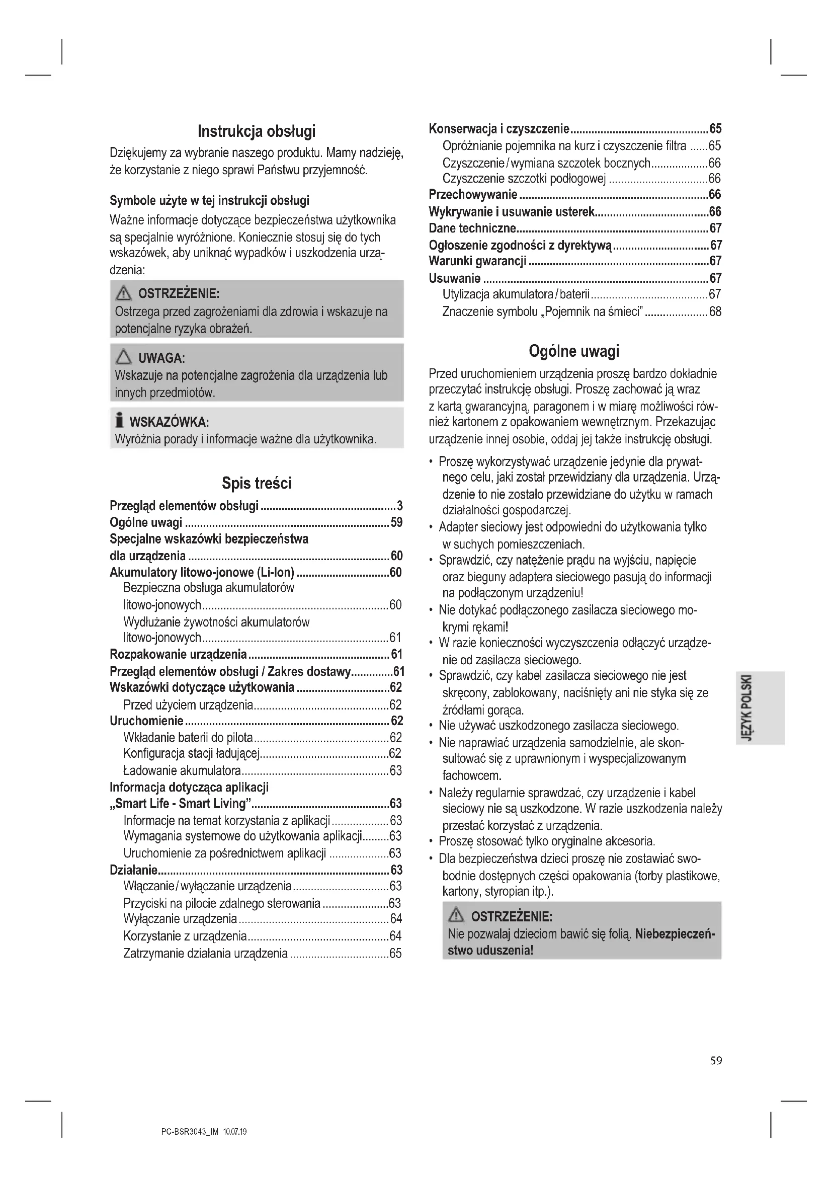 Informacje na temat utylizacji baterii / akumulatorów można uzyskać od władz lokalnych lub miejskich. Znaczenie symbolu „Pojemnik na śmieci” Proszę oszczędzać nasze środowisko, sprzęt elektryczny nie należy do śmieci domowych. Proszę korzystać z punktów zbiorczych, przewidzianych do zdawania sprzętu elektrycz- nego, i tam proszę oddawać sprzęt elektryczny, którego już nie będą Państwo używać. Tym sposobem pomagają Państwo unikać potencjalnych następstw niewłaściwego usuwania odpadów, mających wpływ na środowisko i zdrowie ludzi. Tą drogą przyczyniają się Państwo do ponownego użycia, do recyklingu i do innych form wykorzystania starego sprzętu elektrycznego i elektronicznego. Informacje, gdzie można zdać sprzęt, otrzymają Państwo w swoich urzędach komunalnych lub w administracji gminy.PC-BSR3043_IM 10.07.19