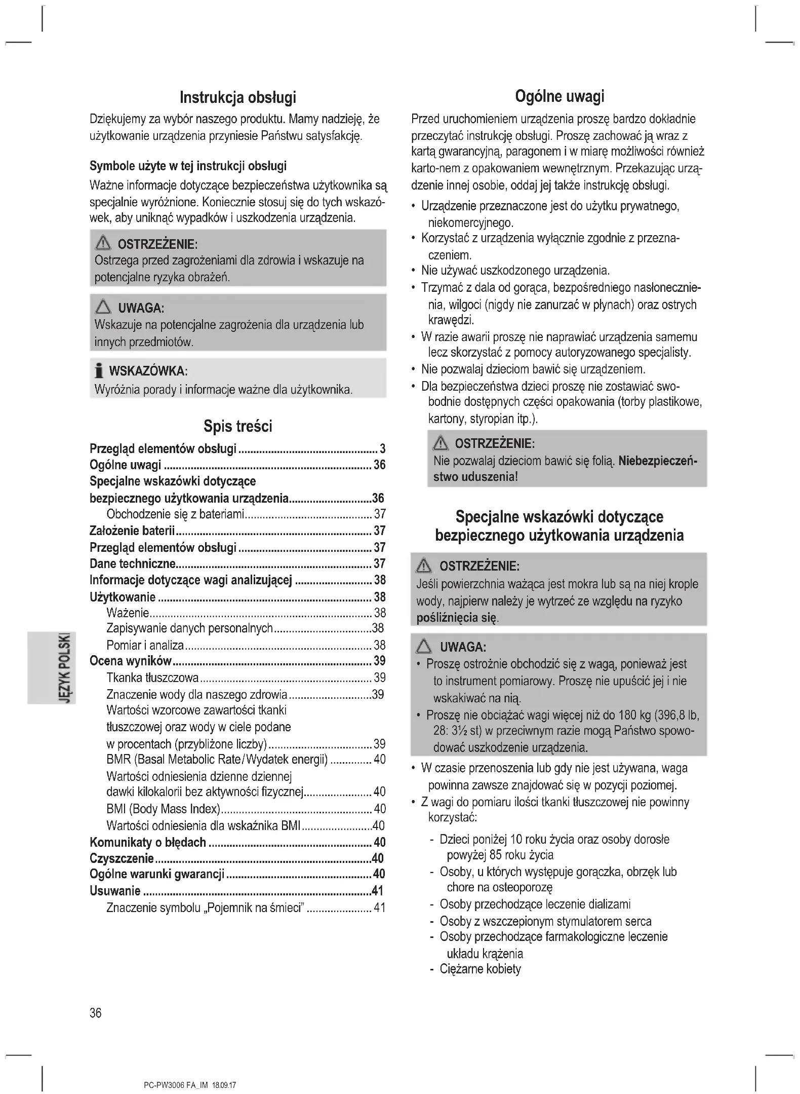 - Dry the appliance well after cleaning with a dry and soft cloth. Disposal Meaning of the “Dustbin” Symbol Protect our environment: do not dispose of elec- trical equipment in the domestic waste. Please return any electrical equipment that you will no longer use to the collection points provided for their disposal. This helps avoid the potential effects of incorrect disposal on the environment and human health. This will contribute to the recycling and other forms of reutili- sation of electrical and electronic equipment. Information concerning where the equipment can be dis- posed of can be obtained from your local authority.36 PC-PW3006 FA_IM 18.09.17 Instrukcja obsługi Dziękujemy za wybór naszego produktu. Mamy nadzieję, że użytkowanie urządzenia przyniesie Państwu satysfakcję. Symbole użyte w tej instrukcji obsługi Ważne informacje dotyczące bezpieczeństwa użytkownika są specjalnie wyróżnione. Koniecznie stosuj się do tych wskazó- wek, aby uniknąć wypadków i uszkodzenia urządzenia. OSTRZEŻENIE: Ostrzega przed zagrożeniami dla zdrowia i wskazuje na potencjalne ryzyka obrażeń. UWAGA: Wskazuje na potencjalne zagrożenia dla urządzenia lub innych przedmiotów. WSKAZÓWKA: Wyróżnia porady i informacje ważne dla użytkownika. Spis treści Przegląd elementów obsługi ............................................... 3 Ogólne uwagi ......................................................................36 Specjalne wskazówki dotyczące bezpiecznego użytkowania urządzenia ............................36 Obchodzenie się z bateriami ...........................................37 Założenie baterii ..................................................................37 Przegląd elementów obsługi ............................................. 37 Dane techniczne ..................................................................37 Informacje dotyczące wagi analizującej ..........................38 Użytkowanie ........................................................................ 38 Ważenie ...........................................................................38 Zapisywanie danych personalnych .................................38 Pomiar i analiza ...............................................................38 Ocena wyników ...................................................................39 Tkanka tłuszczowa ..........................................................39 Znaczenie wody dla naszego zdrowia ............................39 Wartości wzorcowe zawartości tkanki tłuszczowej oraz wody w ciele podane w procentach (przybliżone liczby) ................................... 39 BMR (Basal Metabolic Rate / Wydatek energii) .............. 40 Wartości odniesienia dzienne dziennej dawki kilokalorii bez aktywności zycznej ....................... 40 BMI (Body Mass Index) ...................................................40 Wartości odniesienia dla wskaźnika BMI ........................40 Komunikaty o błędach .......................................................40 Czyszczenie .........................................................................40 Ogólne warunki gwarancji ................................................. 40 Usuwanie .............................................................................41 Znaczenie symbolu „Pojemnik na śmieci” ...................... 41 Ogólne uwagi Przed uruchomieniem urządzenia proszę bardzo dokładnie przeczytać instrukcję obsługi. Proszę zachować ją wraz z kartą gwarancyjną, paragonem i w miarę możliwości również karto-nem z opakowaniem wewnętrznym. Przekazując urzą- dzenie innej osobie, oddaj jej także instrukcję obsługi.