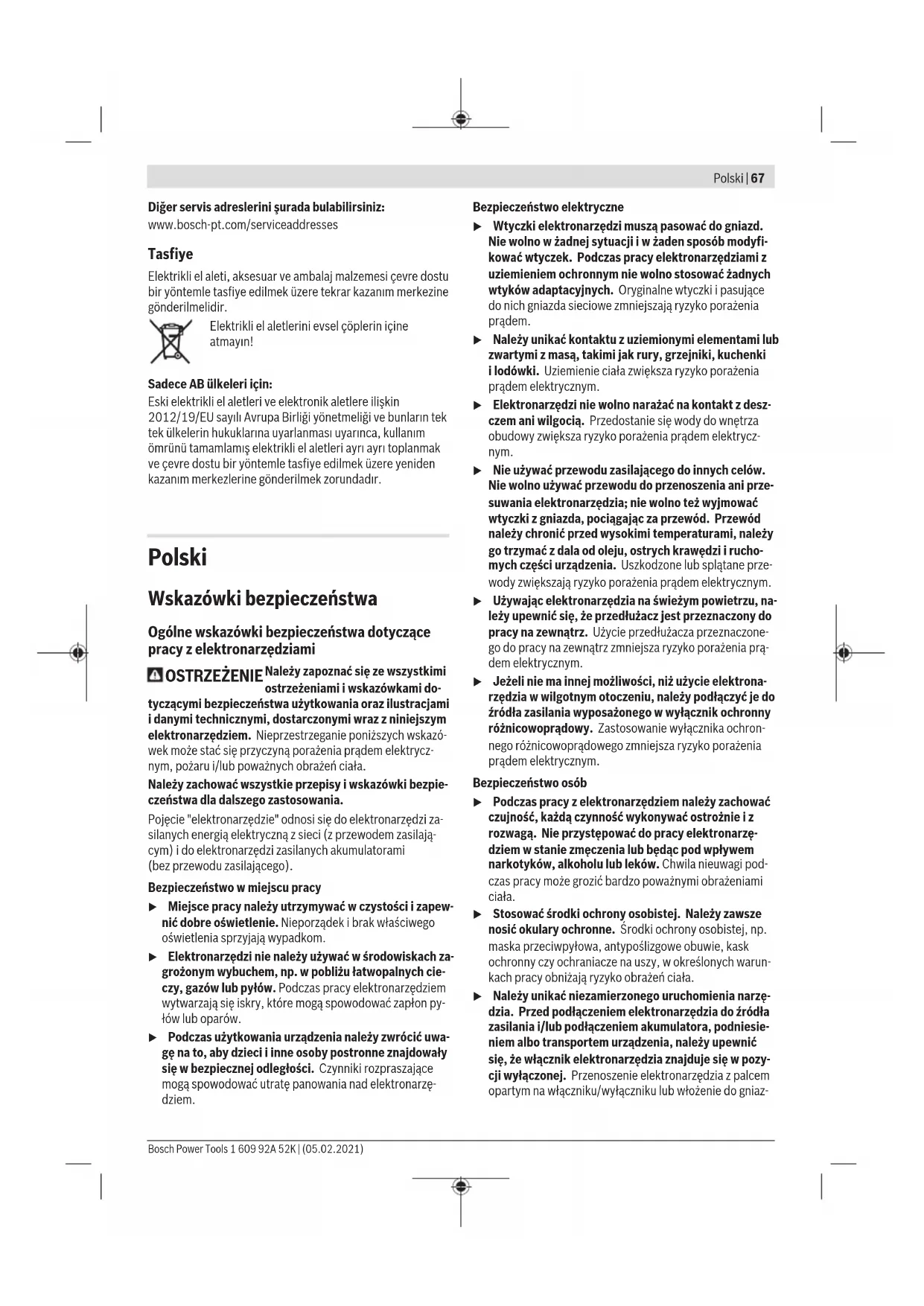 Karasoku Mahallesi 28028. Sokak No:20/A Merkez / ADANA Tel.: +903223599710 -3521379 Fax: +903223591323 E-mail: isiklar@isiklarelektrik.com 1 609 92A 52K | (05.02.2021) Bosch Power ToolsPolski | 67 Diğer servis adreslerini şurada bulabilirsiniz: www.bosch-pt.com/serviceaddresses Tasfiye Elektrikli el aleti, aksesuar ve ambalaj malzemesi çevre dostu bir yöntemle tasfiye edilmek üzere tekrar kazanım merkezine gönderilmelidir. Elektrikli el aletlerini evsel çöplerin içine atmayın! Sadece AB ülkeleri için: Eski elektrikli el aletleri ve elektronik aletlere ilişkin 2012/19/EU sayılı Avrupa Birliği yönetmeliği ve bunların tek tek ülkelerin hukuklarına uyarlanması uyarınca, kullanım ömrünü tamamlamış elektrikli el aletleri ayrı ayrı toplanmak ve çevre dostu bir yöntemle tasfiye edilmek üzere yeniden kazanım merkezlerine gönderilmek zorundadır. Polski Wskazówki bezpieczeństwa Ogólne wskazówki bezpieczeństwa dotyczące pracy z elektronarzędziami OSTRZEŻENIE Należy zapoznać się ze wszystkimi ostrzeżeniami i wskazówkami do- tyczącymi bezpieczeństwa użytkowania oraz ilustracjami i danymi technicznymi, dostarczonymi wraz z niniejszym elektronarzędziem. Nieprzestrzeganie poniższych wskazó- wek może stać się przyczyną porażenia prądem elektrycz- nym, pożaru i/lub poważnych obrażeń ciała. Należy zachować wszystkie przepisy i wskazówki bezpie- czeństwa dla dalszego zastosowania. Pojęcie "elektronarzędzie" odnosi się do elektronarzędzi za- silanych energią elektryczną z sieci (z przewodem zasilają- cym) i do elektronarzędzi zasilanych akumulatorami (bezprzewodu zasilającego). Bezpieczeństwo w miejscu pracy u Miejsce pracy należy utrzymywać w czystości i zapew- nić dobre oświetlenie. Nieporządek i brak właściwego oświetlenia sprzyjają wypadkom. u Elektronarzędzi nie należy używać w środowiskach za- grożonym wybuchem, np. w pobliżu łatwopalnych cie- czy, gazów lub pyłów. Podczas pracy elektronarzędziem wytwarzają się iskry, które mogą spowodować zapłon py- łów lub oparów. u Podczas użytkowania urządzenia należy zwrócić uwa- gę na to, aby dzieci i inne osoby postronne znajdowały się w bezpiecznej odległości. Czynniki rozpraszające mogą spowodować utratę panowania nad elektronarzę- dziem. Bezpieczeństwo elektryczne u Wtyczki elektronarzędzi muszą pasować do gniazd. Nie wolno w żadnej sytuacji i w żaden sposób modyfi- kować wtyczek. Podczas pracy elektronarzędziami z uziemieniem ochronnym nie wolno stosować żadnych wtyków adaptacyjnych. Oryginalne wtyczki i pasujące do nich gniazda sieciowe zmniejszają ryzyko porażenia prądem. u Należy unikać kontaktu z uziemionymi elementami lub zwartymi z masą, takimi jak rury, grzejniki, kuchenki ilodówki. Uziemienie ciała zwiększa ryzyko porażenia prądem elektrycznym. u Elektronarzędzi nie wolno narażać na kontakt z desz- czem ani wilgocią. Przedostanie się wody do wnętrza obudowy zwiększa ryzyko porażenia prądem elektrycz- nym. u Nie używać przewodu zasilającego do innych celów. Nie wolno używać przewodu do przenoszenia ani prze- suwania elektronarzędzia; nie wolno też wyjmować wtyczki z gniazda, pociągając za przewód. Przewód należy chronić przed wysokimi temperaturami, należy go trzymać zdala od oleju, ostrych krawędzi i rucho- mych części urządzenia. Uszkodzone lub splątane prze- wody zwiększają ryzyko porażenia prądem elektrycznym. u Używając elektronarzędzia na świeżym powietrzu, na- leży upewnić się, że przedłużacz jest przeznaczony do pracy na zewnątrz. Użycie przedłużacza przeznaczone- go do pracy na zewnątrz zmniejsza ryzyko porażenia prą- dem elektrycznym. u Jeżeli nie ma innej możliwości, niż użycie elektrona- rzędzia w wilgotnym otoczeniu, należy podłączyć je do źródła zasilania wyposażonego w wyłącznik ochronny różnicowoprądowy. Zastosowanie wyłącznika ochron- nego różnicowoprądowego zmniejsza ryzyko porażenia prądem elektrycznym. Bezpieczeństwo osób u Podczas pracy z elektronarzędziem należy zachować czujność, każdą czynność wykonywać ostrożnie i z rozwagą. Nie przystępować do pracy elektronarzę- dziem w stanie zmęczenia lub będąc pod wpływem narkotyków, alkoholu lub leków. Chwila nieuwagi pod- czas pracy może grozić bardzo poważnymi obrażeniami ciała. u Stosować środki ochrony osobistej. Należy zawsze nosić okulary ochronne. Środki ochrony osobistej, np. maska przeciwpyłowa, antypoślizgowe obuwie, kask ochronny czy ochraniacze na uszy, w określonych warun- kach pracy obniżają ryzyko obrażeń ciała. u Należy unikać niezamierzonego uruchomienia narzę- dzia. Przed podłączeniem elektronarzędzia do źródła zasilania i/lub podłączeniem akumulatora, podniesie- niem albo transportem urządzenia, należy upewnić się, że włącznik elektronarzędzia znajduje się w pozy- cji wyłączonej. Przenoszenie elektronarzędzia z palcem opartym na włączniku/wyłączniku lub włożenie do gniaz- Bosch Power Tools 1 609 92A 52K | (05.02.2021)68 | Polski da sieciowego wtyczki włączonego narzędzia, może stać się przyczyną wypadków. u Przed włączeniem elektronarzędzia należy usunąć wszystkie narzędzia nastawcze i klucze maszynowe. Narzędzia lub klucze, pozostawione wruchomych czę- ściach urządzenia, mogą spowodować obrażenia ciała. u Należy unikać nienaturalnych pozycji przy pracy. Na- leży dbać o stabilną pozycję przy pracy i zachowanie równowagi. Dzięki temu można będzie łatwiej zapano- wać nad elektronarzędziem w nieprzewidzianych sytu- acjach. u Należy nosić odpowiednią odzież. Nie należy nosić luźnej odzieży ani biżuterii. Włosy i odzież należy trzy- mać z dala od ruchomych części. Luźna odzież, biżuteria lub długie włosy mogą zostać pochwycone przez ruchome części. u Jeżeli producent przewidział możliwość podłączenia odkurzacza lu