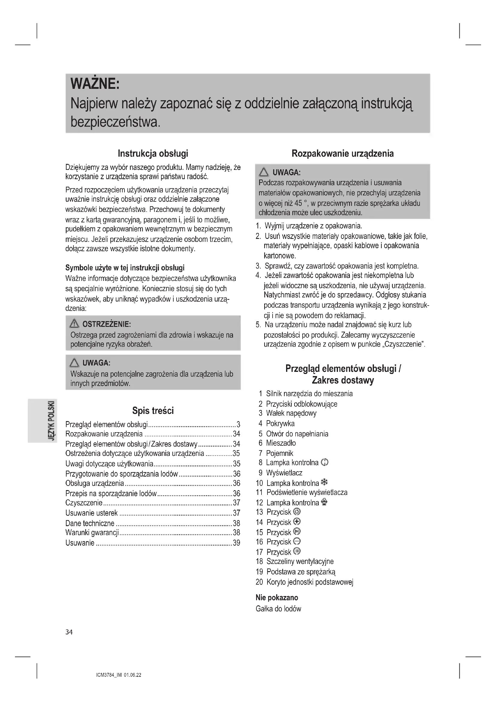 pozostałości po produkcji. Zalecamy wyczyszczenie urządzenia zgodnie z opisem w punkcie „Czyszczenie”. Przegląd elementów obsługi / Zakres dostawy 1 Silnik narzędzia do mieszania 2 Przyciski odblokowujące 3 Wałek napędowy 4 Pokrywka 5 Otwór do napełniania 6 Mieszadło 7 Pojemnik 8 Lampka kontrolna 9 Wyświetlacz 10 Lampka kontrolna 11 Podświetlenie wyświetlacza 12 Lampka kontrolna 13 Przycisk 14 Przycisk 15 Przycisk 16 Przycisk 17 Przycisk 18 Szczeliny wentylacyjne 19 Podstawa ze sprężarką 20 Koryto jednostki podstawowej Nie pokazano Gałka do lodówICM3784_IM 01.06.22