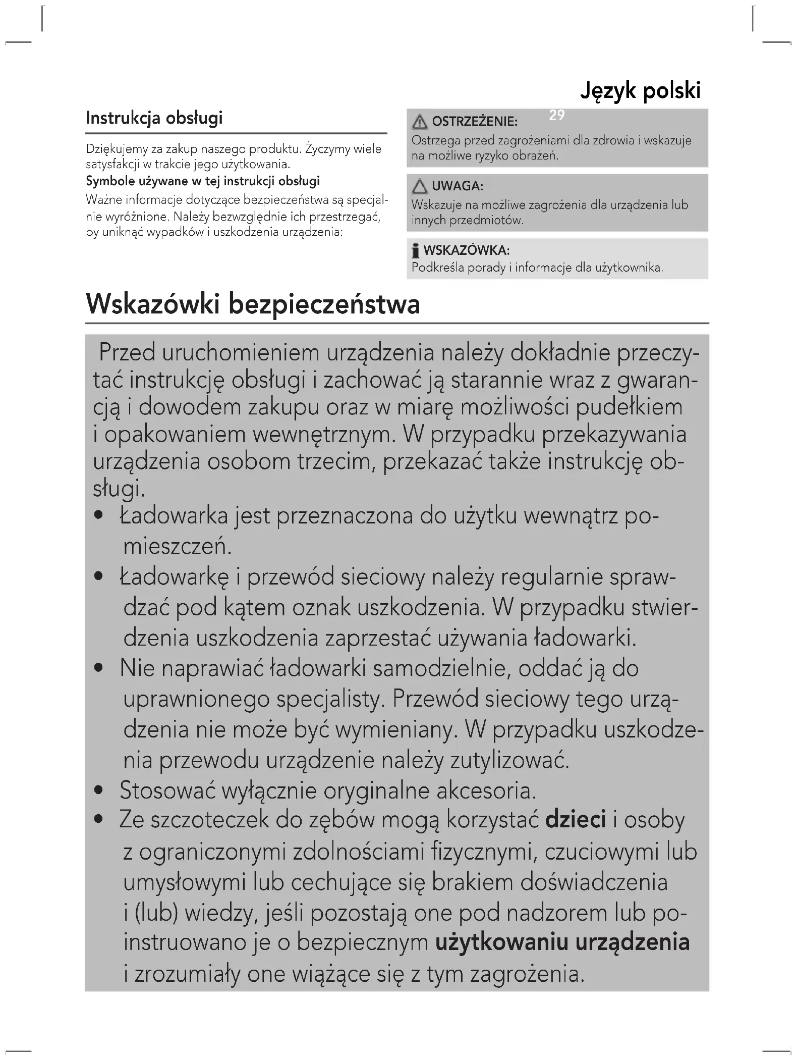 po każdym użyciu pod bieżącą wodą. WSKAZÓWKA: Nie czyścić żadnych elementów w zmywarce. Ładowarka OSTRZEŻENIE: Przed każdym czyszczeniem wyciągnąć wtyczkę siecio- wą z gniazdka. WSKAZÓWKA: Ładowarkajestchronionaprzedrozpryskamiwody.