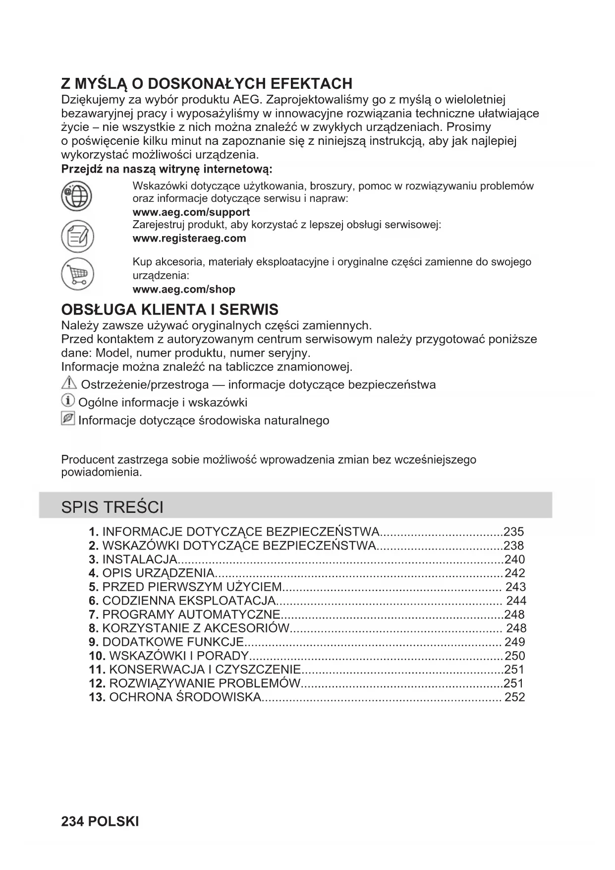 Należy zawsze używać oryginalnych części zamiennych. Przed kontaktem z autoryzowanym centrum serwisowym należy przygotować poniższe dane: Model, numer produktu, numer seryjny. Informacje można znaleźć na tabliczce znamionowej. Ostrzeżenie/przestroga — informacje dotyczące bezpieczeństwa Ogólne informacje i wskazówki Informacje dotyczące środowiska naturalnego Producent zastrzega sobie możliwość wprowadzenia zmian bez wcześniejszego powiadomienia.
