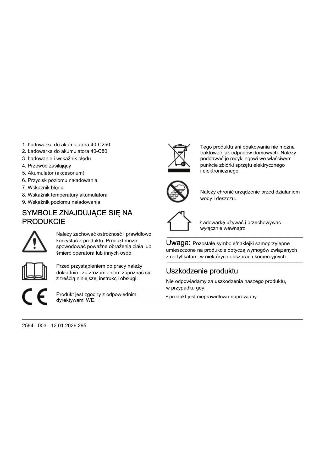 Nie używać ładowarki do akumulatora w pobliżu łatwopalnych materiałów lub materiałów, które mogą powodować korozję. W razie 2594 - 003 - 12.01.2026 299zauważenia dymu lub ognia należy odłączyć ładowarkę od źródła zasilania.