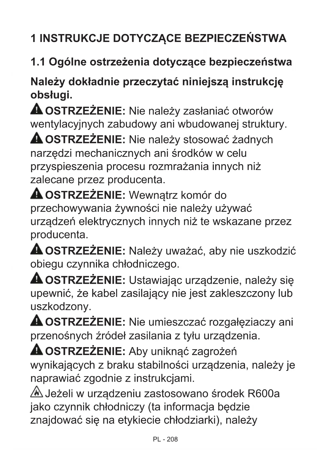 Należy dokładnie przeczytać niniejszą instrukcję obsługi. OSTRZEŻENIE: Nie należy zasłaniać otworów wentylacyjnych zabudowy ani wbudowanej struktury. OSTRZEŻENIE: Nie należy stosować żadnych narzędzi mechanicznych ani środków w celu przyspieszenia procesu rozmrażania innych niż zalecane przez producenta. OSTRZEŻENIE: Wewnątrz komór do przechowywania żywności nie należy używać urządzeń elektrycznych innych niż te wskazane przez producenta. OSTRZEŻENIE: Należy uważać, aby nie uszkodzić obiegu czynnika chłodniczego. OSTRZEŻENIE: Ustawiając urządzenie, należy się upewnić, że kabel zasilający nie jest zakleszczony lub uszkodzony. OSTRZEŻENIE: Nie umieszczać rozgałęziaczy ani przenośnych źródeł zasilania z tyłu urządzenia. OSTRZEŻENIE: Aby uniknąć zagrożeń wynikających z braku stabilności urządzenia, należy je naprawiać zgodnie z instrukcjami. Jeżeli w urządzeniu zastosowano środek R600a jako czynnik chłodniczy (ta informacja będzie znajdować się na etykiecie chłodziarki), należyPL - 209 zachować ostrożność podczas transportu i montażu, aby zapobiec zniszczeniu części chłodziarki. Środek R600a jest przyjaznym środowisku naturalnym gazem, ale jest on wybuchowy. W przypadku wycieku gazu w wyniku uszkodzenia elementów chłodziarki należy odsunąć lodówkę od źródeł otwartego ognia lub ciepła i przez kilka minut wietrzyć pomieszczenie, w którym znajduje się urządzenie.