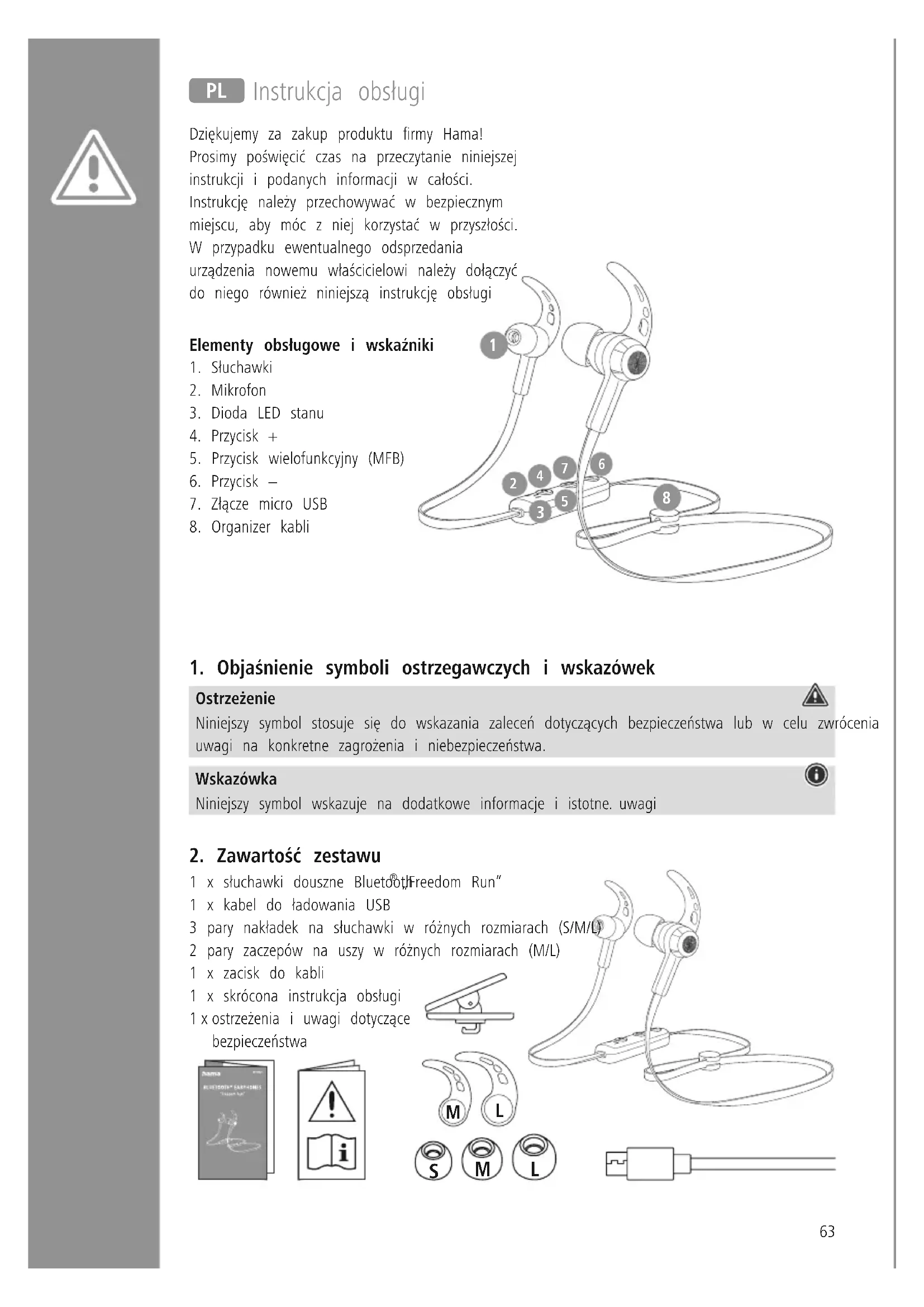 „Freedom Run” 1 x kabel do ładowania USB 3 pary nakładek na słuchawki w różnych rozmiarach (S/M/L) 2 pary zaczepów na uszy w różnych rozmiarach (M/L) 1 x zacisk do kabli 1 x skrócona instrukcja obsługi 1 x ostrzeżenia i uwagi dotyczące bezpieczeństwa