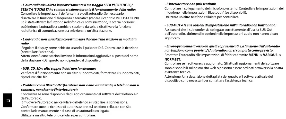 Problemy z Bluetooth® (książka telefoniczna nie jest wyświetlana, telefon komórkowy nie łączy się, nie słychać rozmówcy): Należy sprawdzić, czy dostępne są aktualizacje oprogramowania dla telefonu komórkowego i/lub radia samochodowego. Proszę usunąć radio samochodowe w telefonie komórkowym z listy, a następnie ponownie nawiązać połączenie. Potwierdzić wszystkie żądania autoryzacji w telefonie komórkowym za pomocą TAK lub sprawdzić je ręcznie w przypadku podłączonego radia samochodowego. Wykorzystaj inny telefon komórkowy do sprawdzenia.